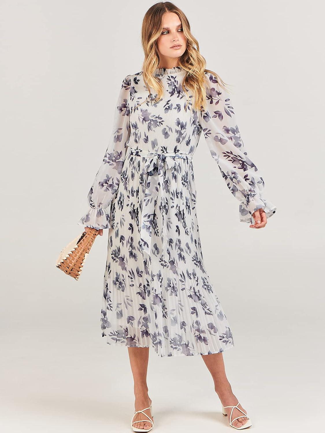 imageANRABESS Womens Floral Chiffon Midi Dress Puff Long Sleeve Mock Neck Summer Wedding Guest Party Dresses Fall 2025 OutfitsLeaf White