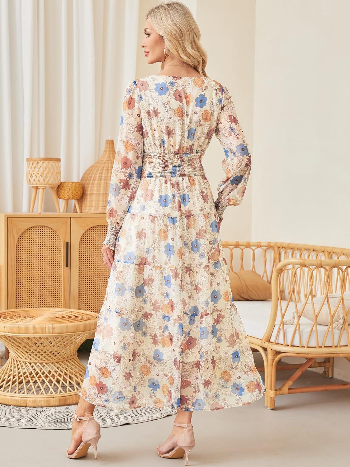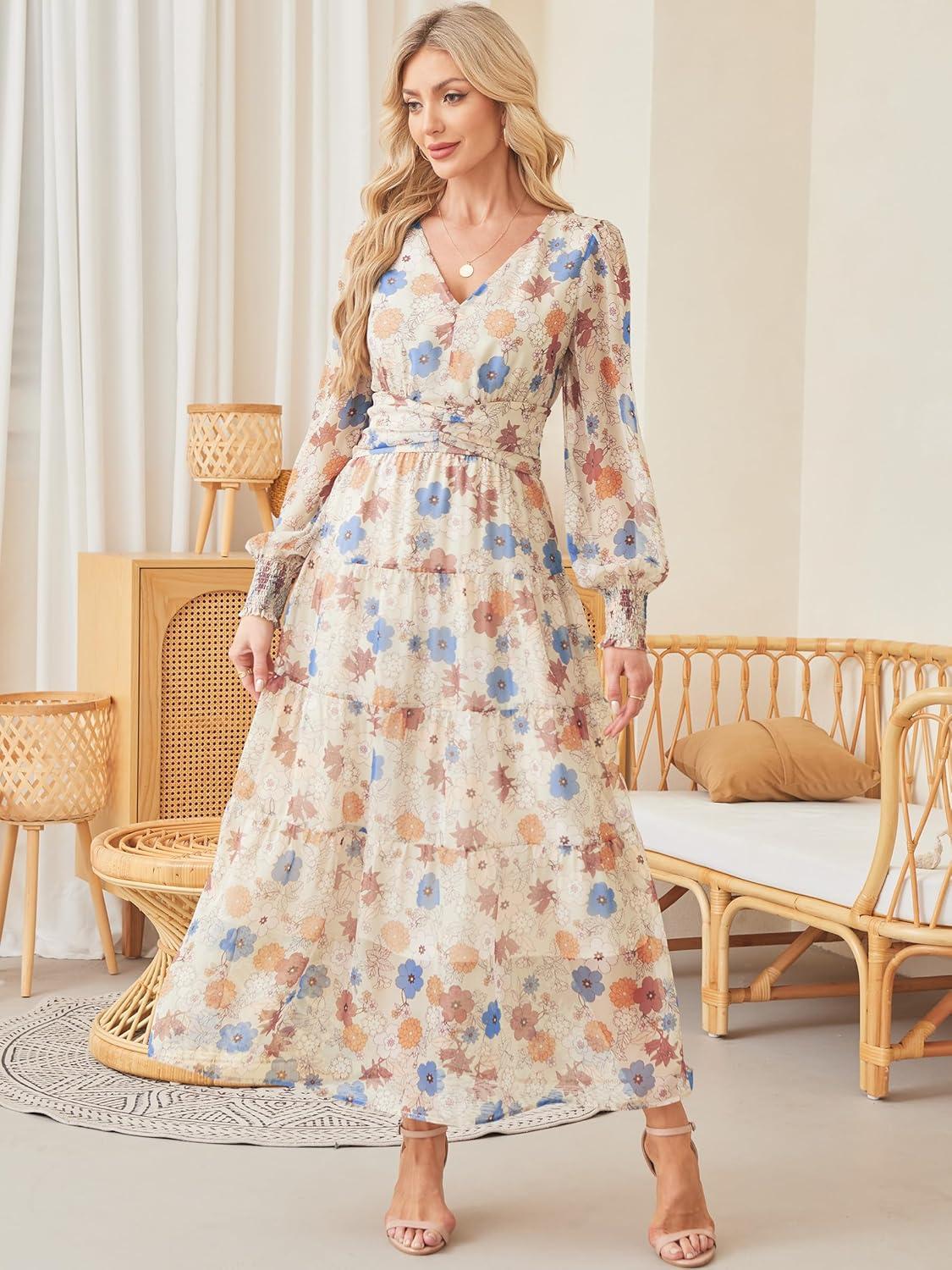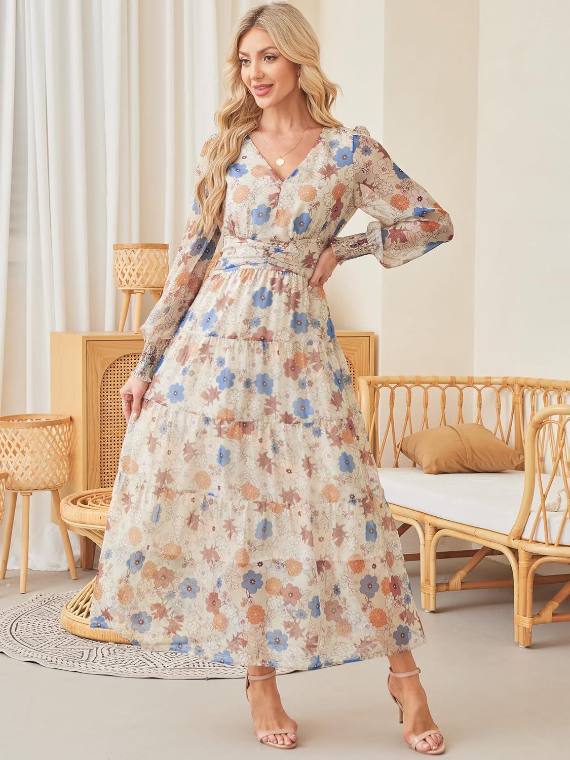 ANRABESS Womens Floral Long Sleeve Maxi Dress V Neck Chiffon Flowy Boho A-Line 2025 Fall Wedding Guest Party Wrap Dresses(Floral Beige)