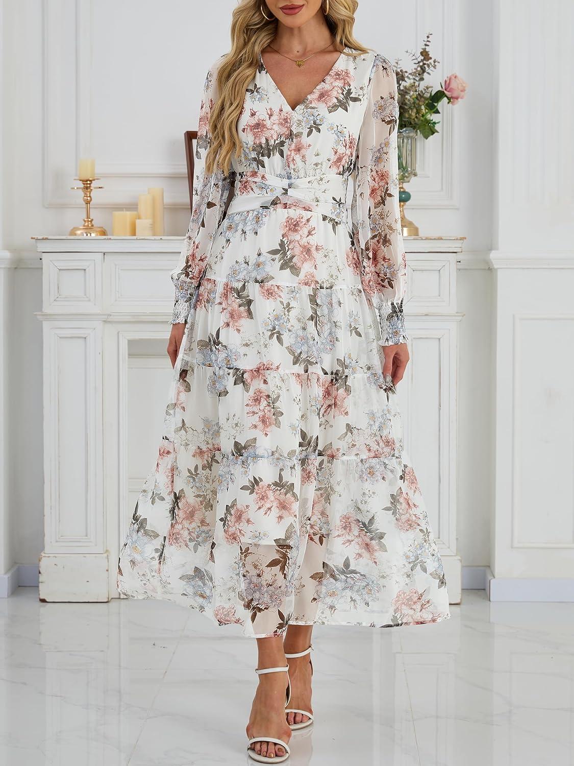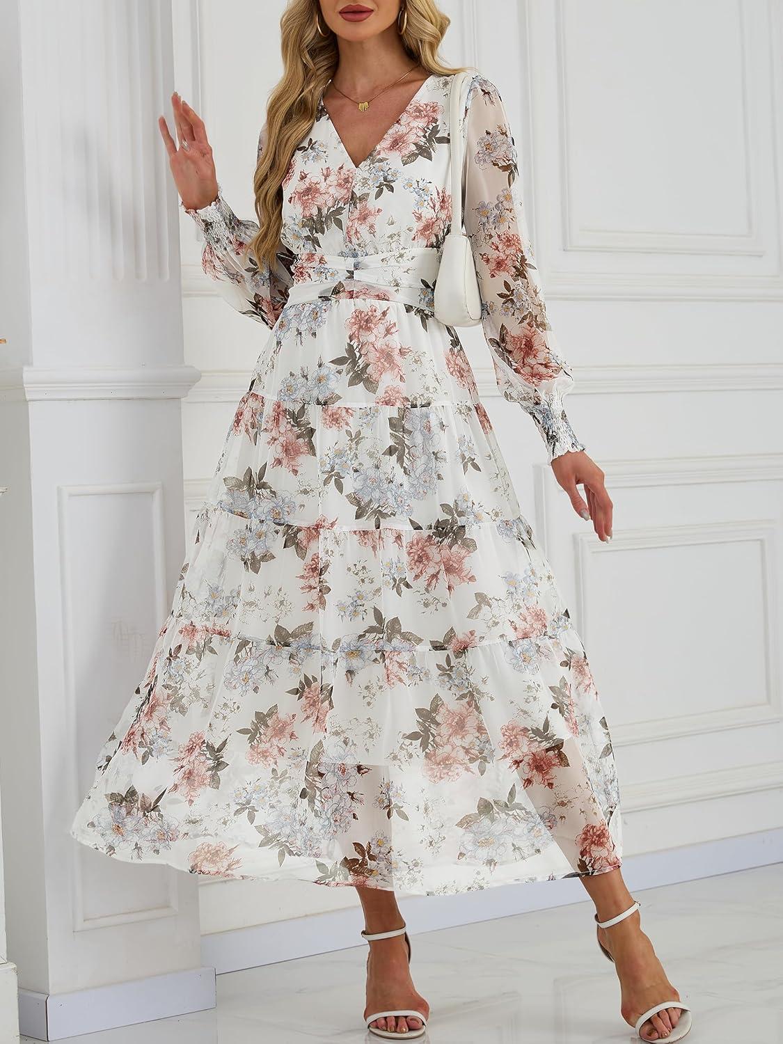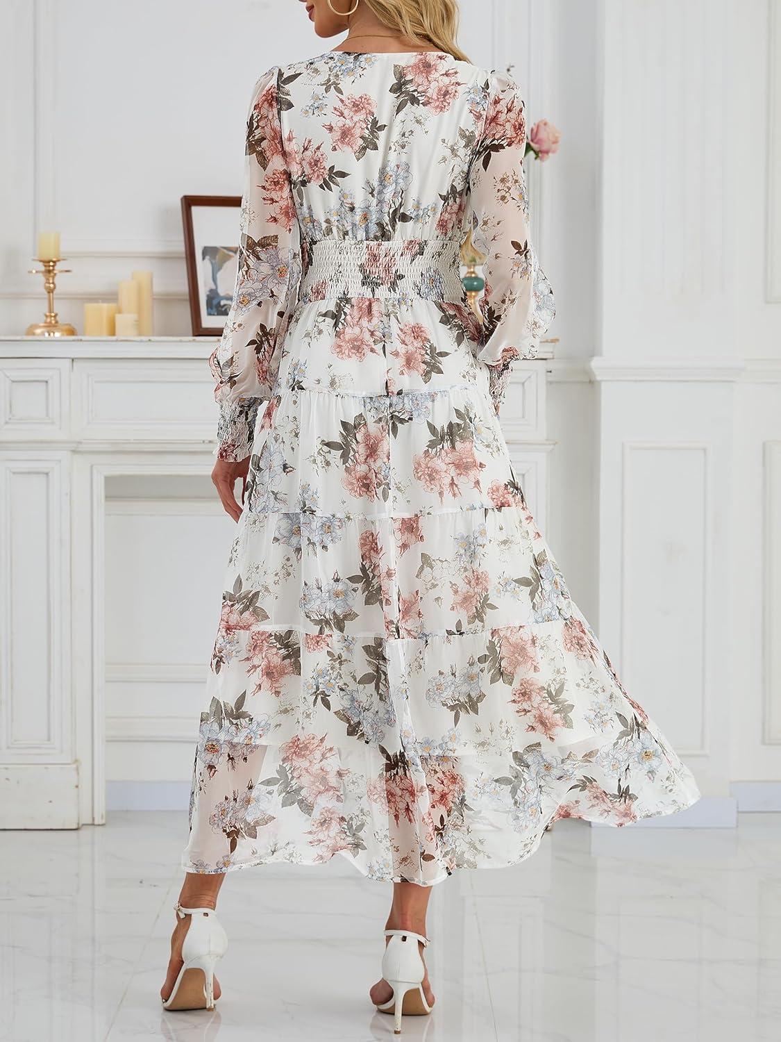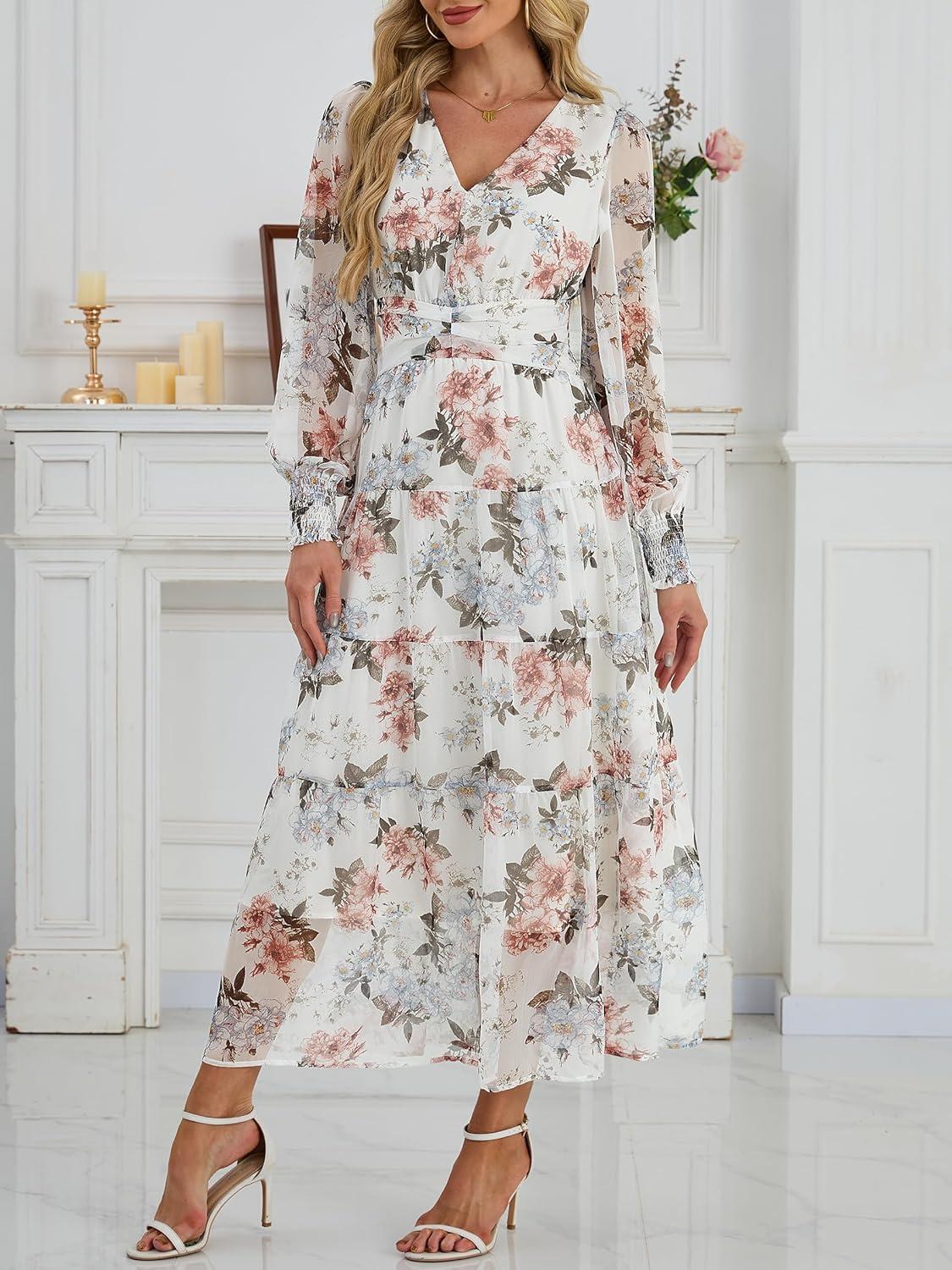 ANRABESS Womens Floral Long Sleeve Maxi Dress V Neck Chiffon Flowy Boho A-Line 2025 Fall Wedding Guest Party Wrap Dresses(Floral White)