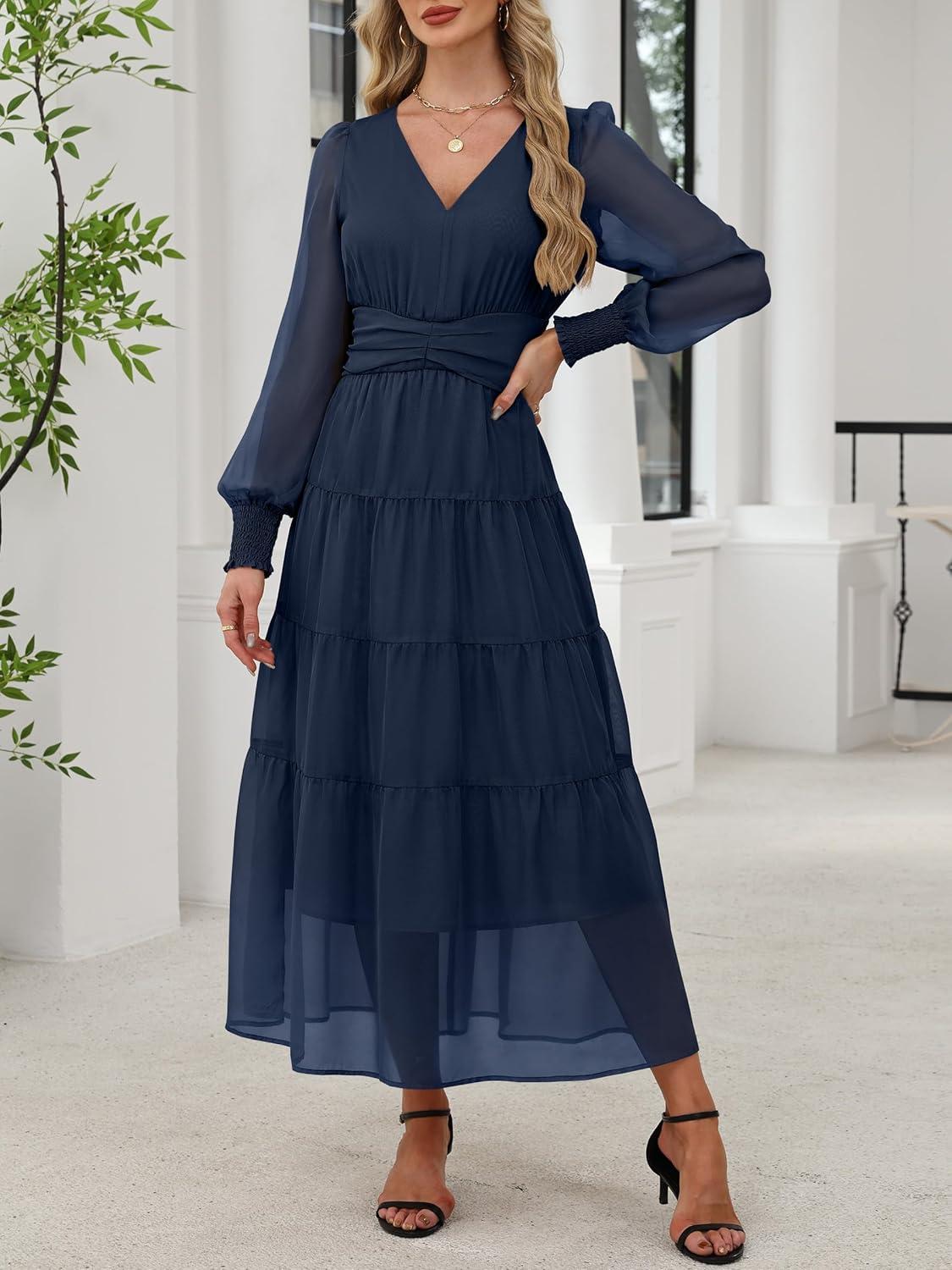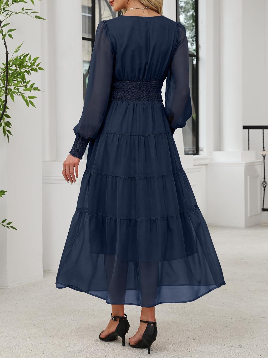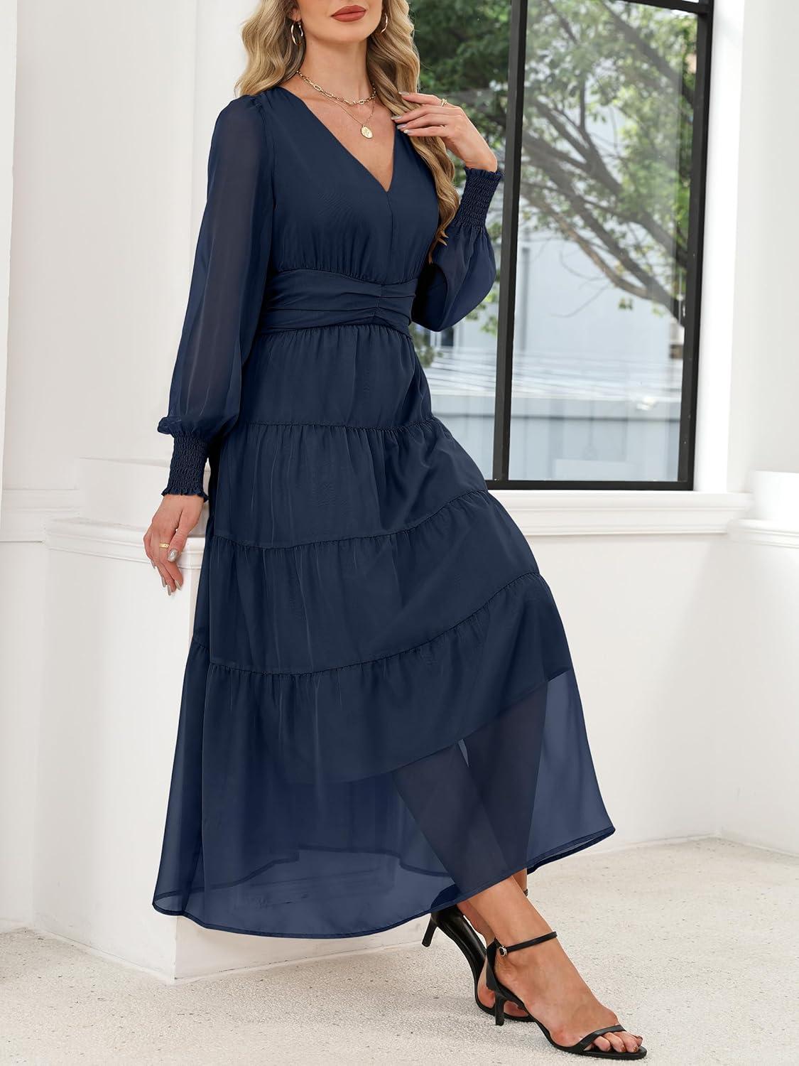 ANRABESS Womens Floral Long Sleeve Maxi Dress V Neck Chiffon Flowy Boho A-Line 2025 Fall Wedding Guest Party Wrap Dresses(Navy Blue)