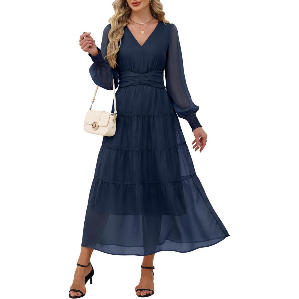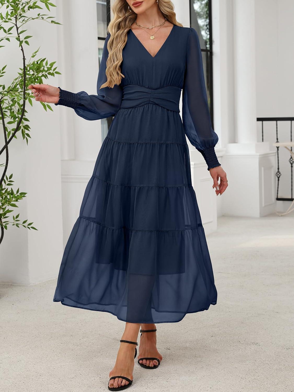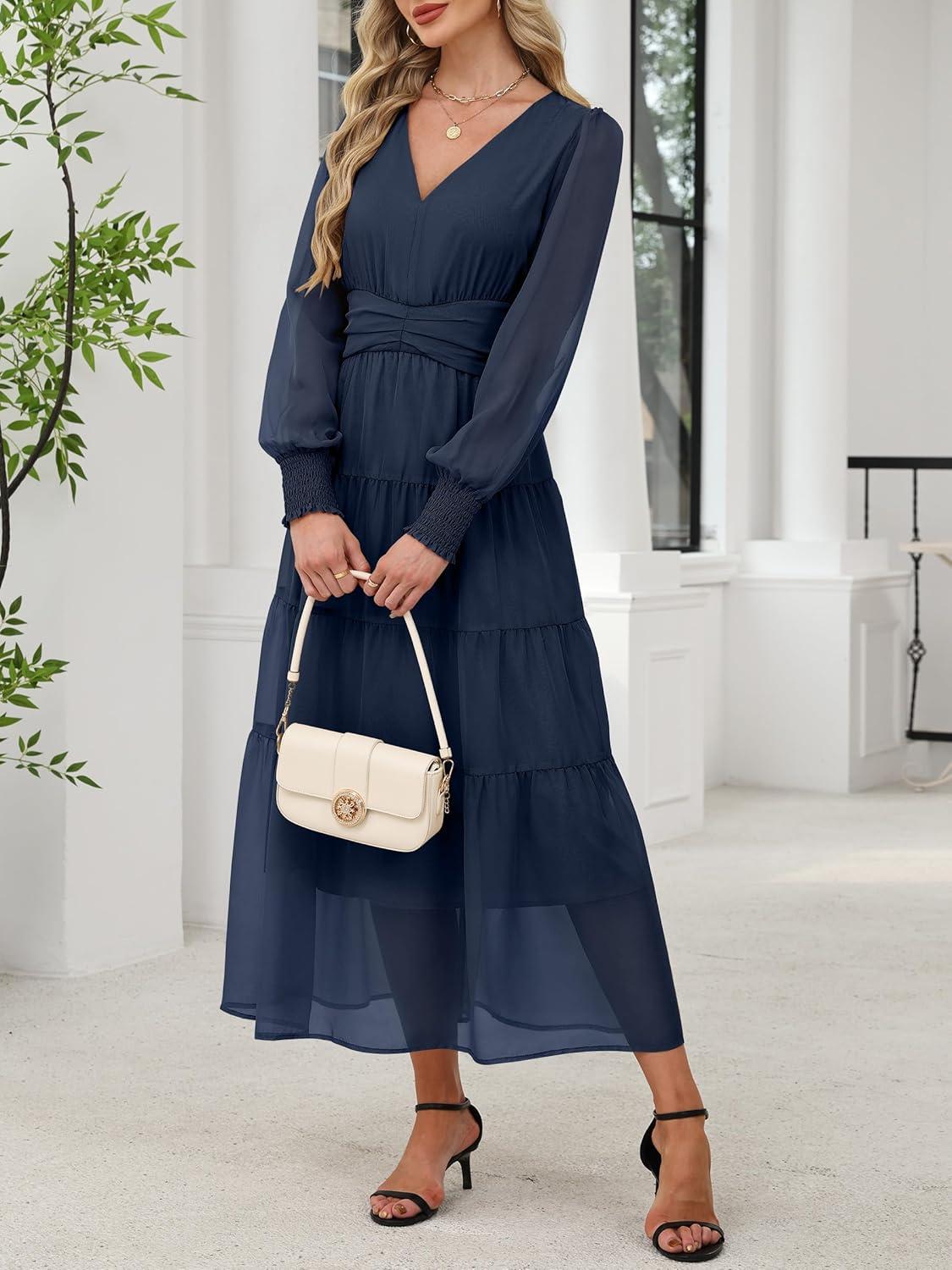 ANRABESS Womens Floral Long Sleeve Maxi Dress V Neck Chiffon Flowy Boho A-Line 2025 Fall Wedding Guest Party Wrap Dresses(Navy Blue)
