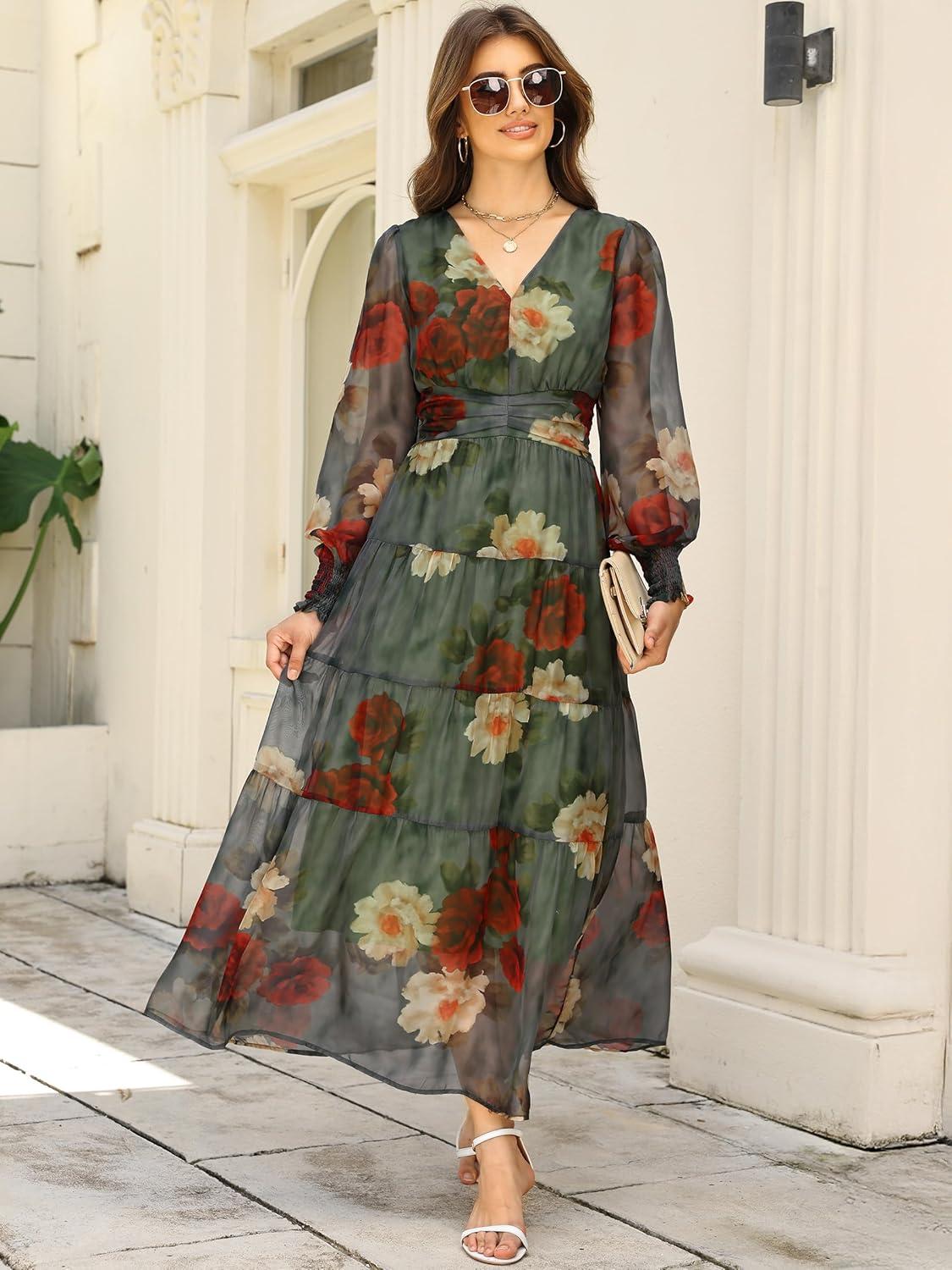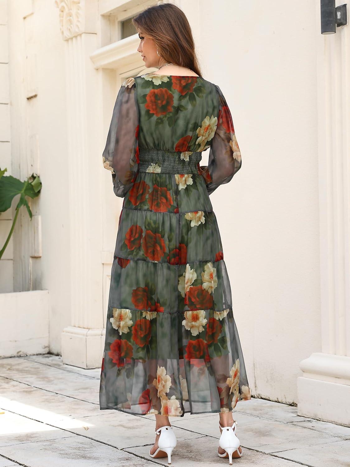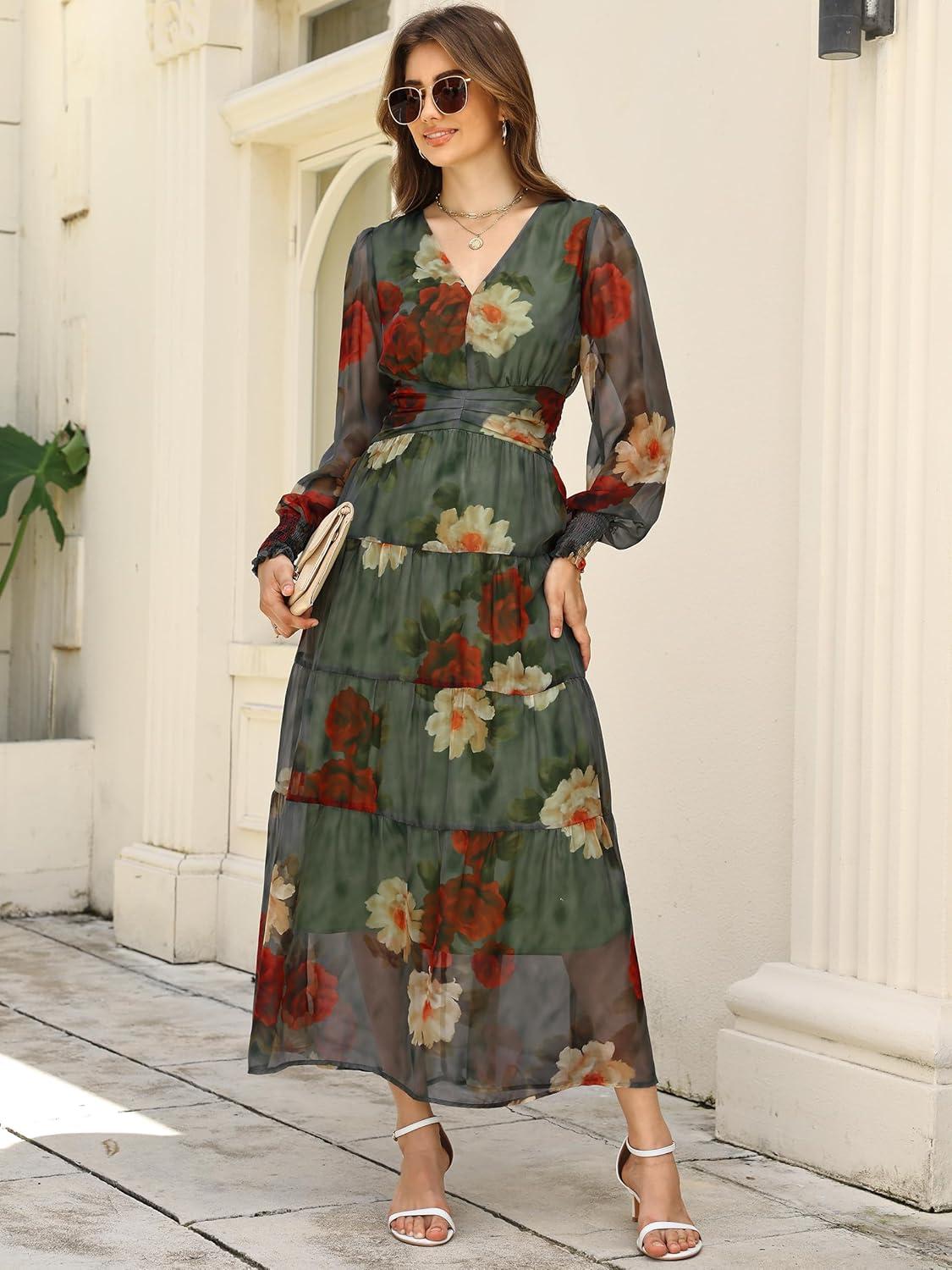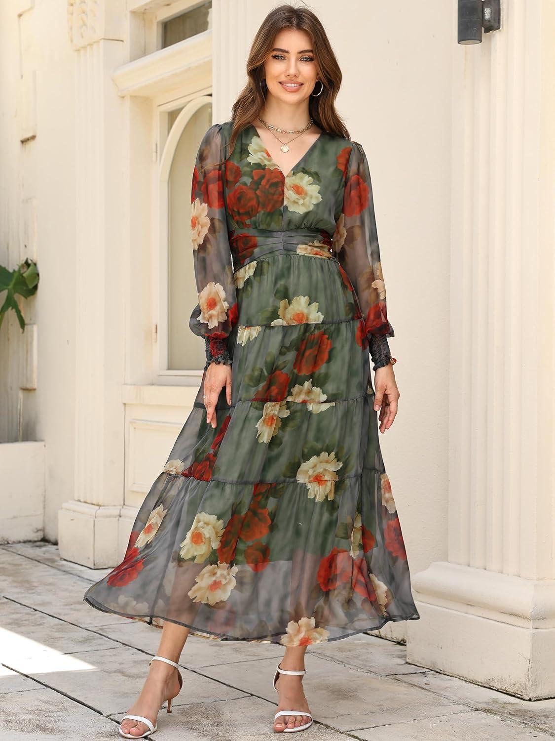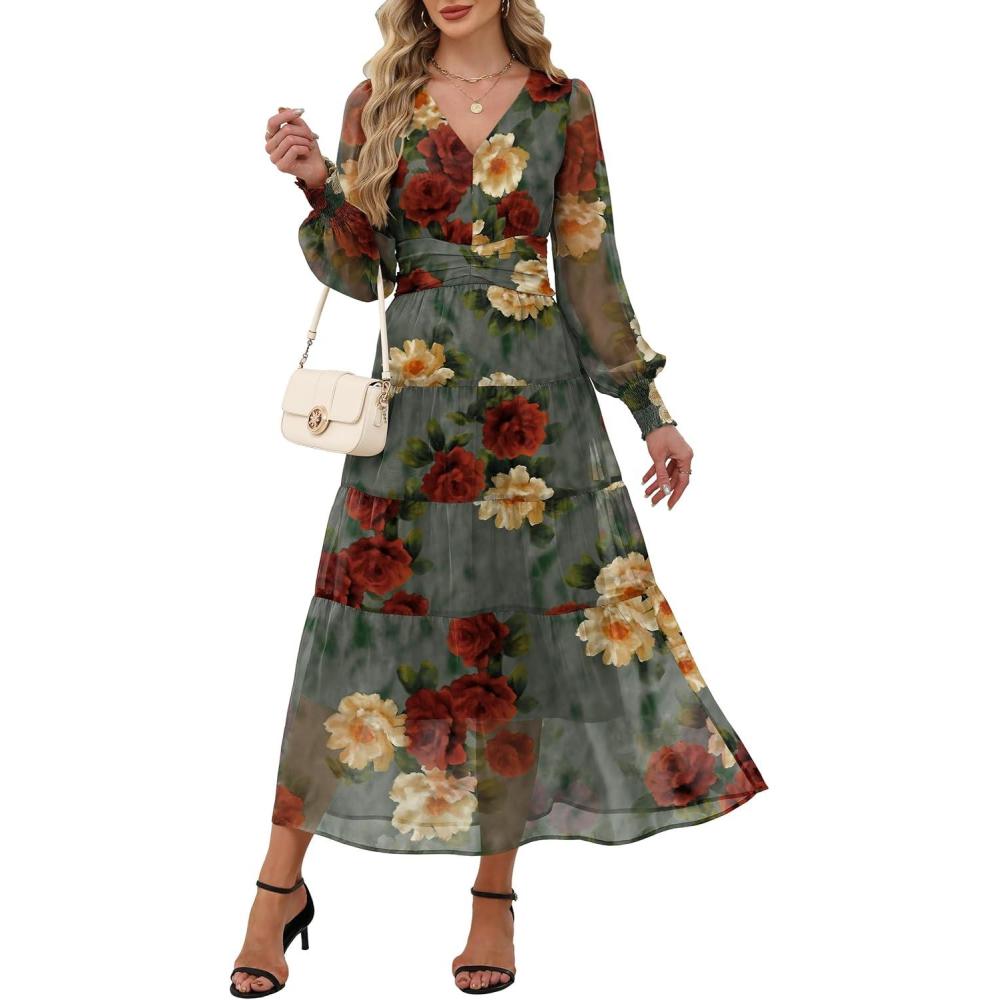 ANRABESS Womens Floral Long Sleeve Maxi Dress V Neck Chiffon Flowy Boho A-Line 2025 Fall Wedding Guest Party Wrap Dresses(Red Yellow Rose)