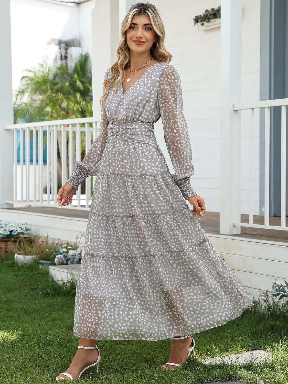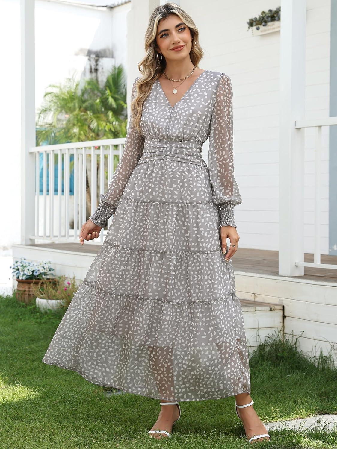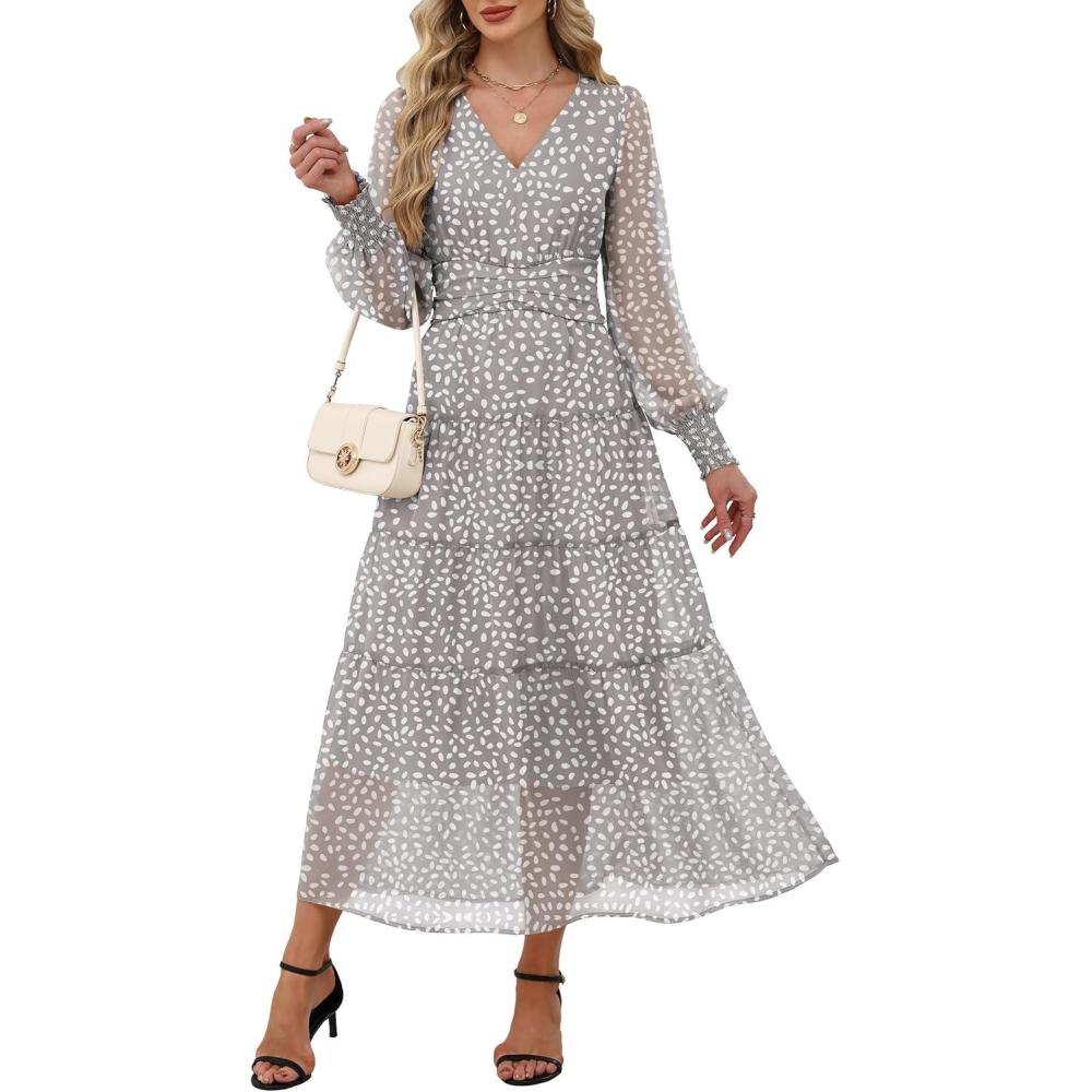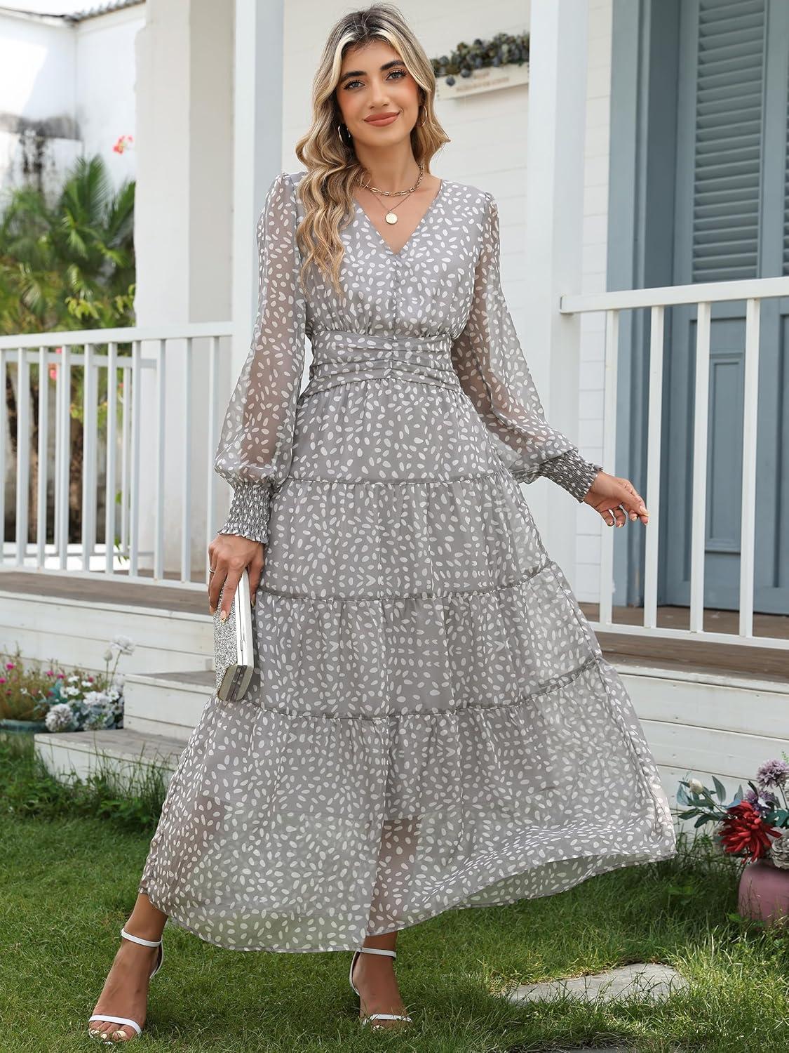 ANRABESS Womens Floral Long Sleeve Maxi Dress V Neck Chiffon Flowy Boho A-Line 2025 Fall Wedding Guest Party Wrap Dresses(White Dot)