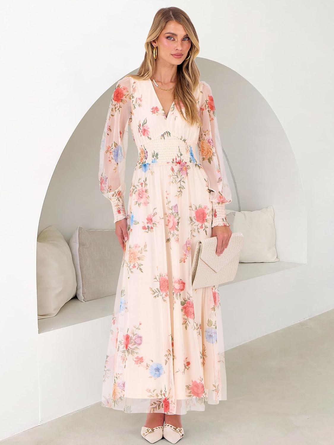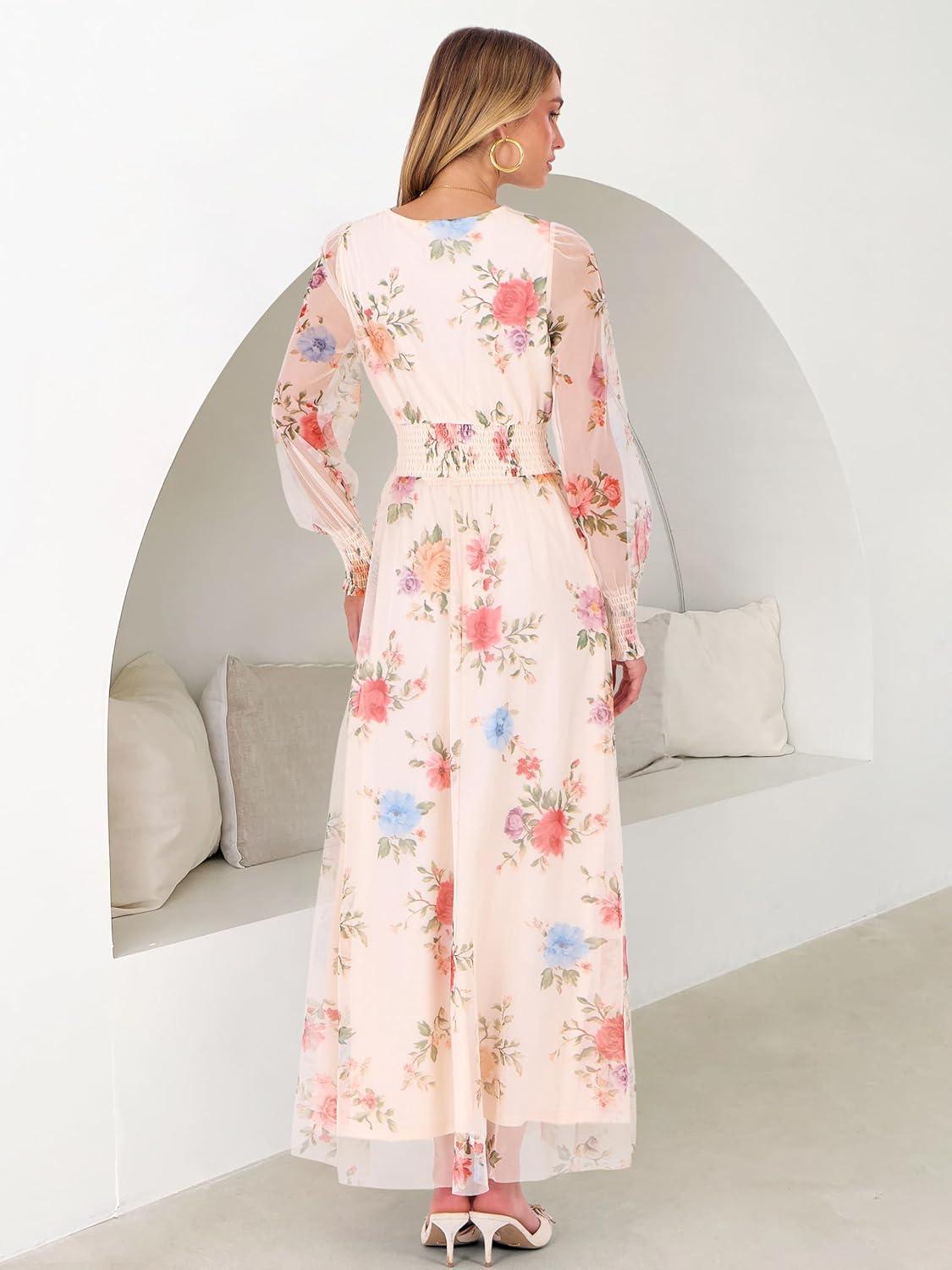 ANRABESS Women’s Floral Maxi Dress 2025 Fall V Neck Puff Long Sleeve Flowy Casual Wedding Guest Tee Party Tulle Dresses(Multicolored Rose Apricot)