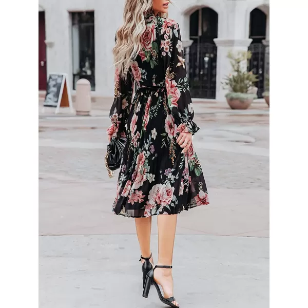 ANRABESS Women's Floral Midi Dress Puff Long Sleeve Ruffle Trim Smocked A-line Pleated Swing Chiffon Dresses with Belt(Floral Black)