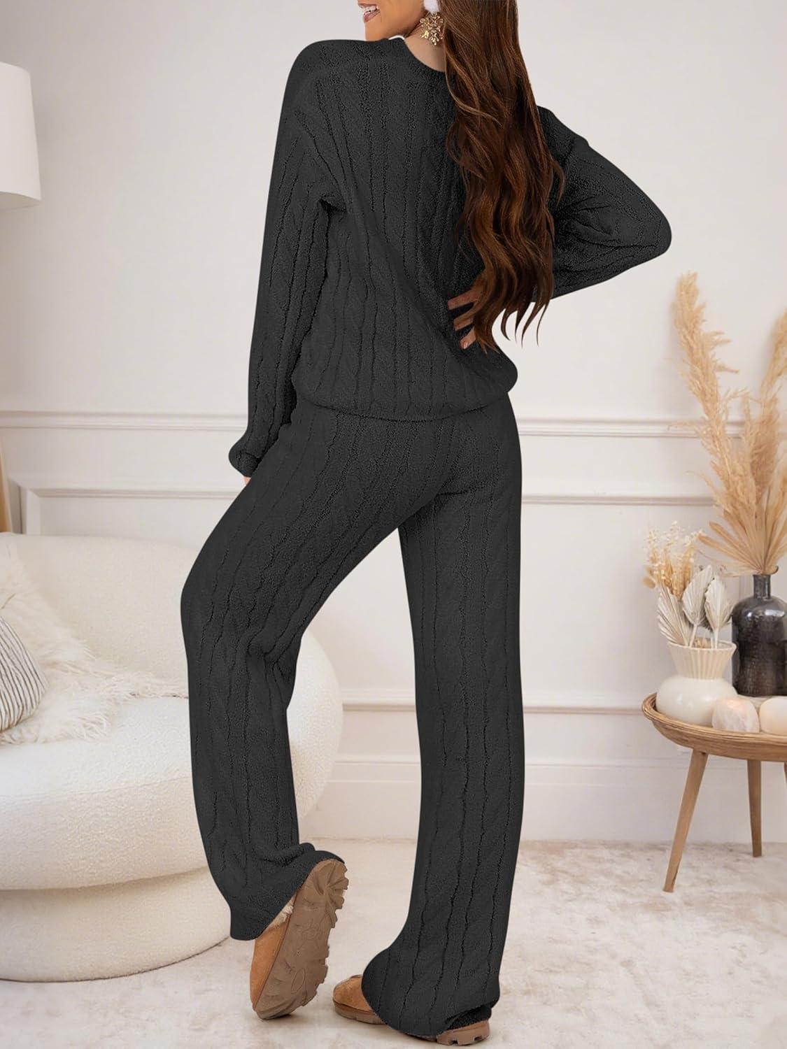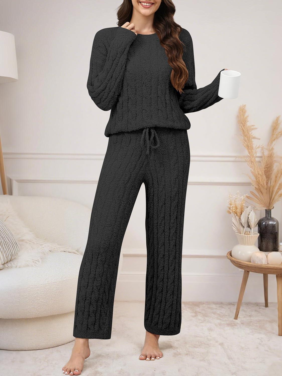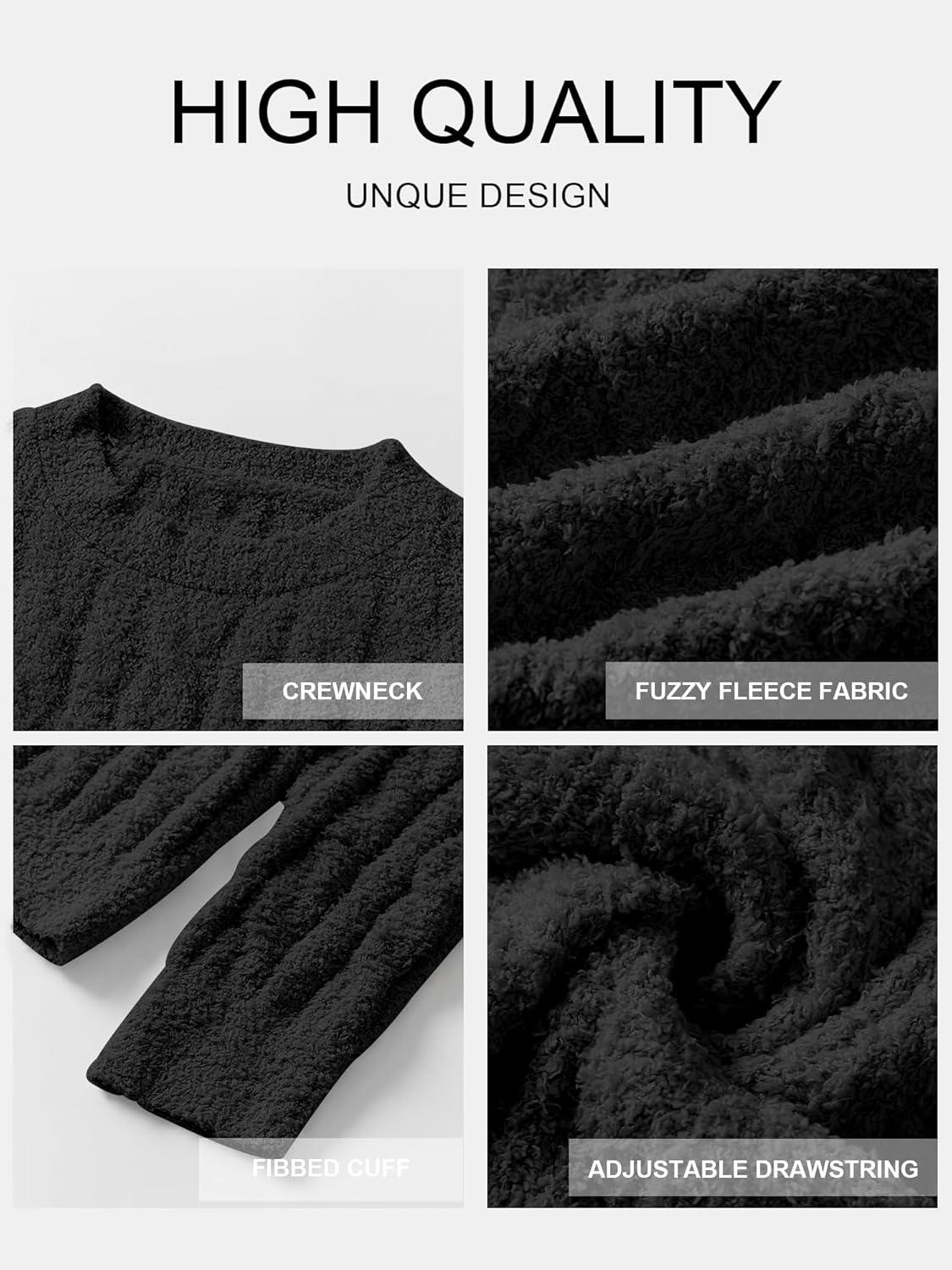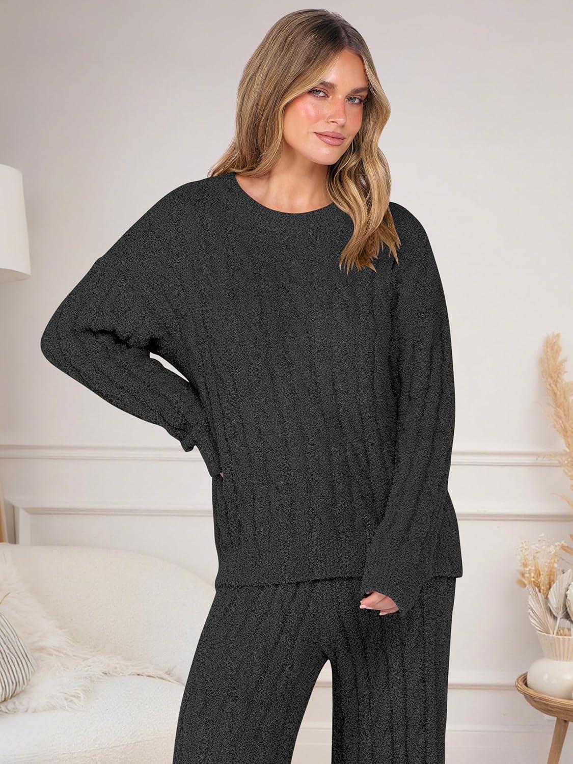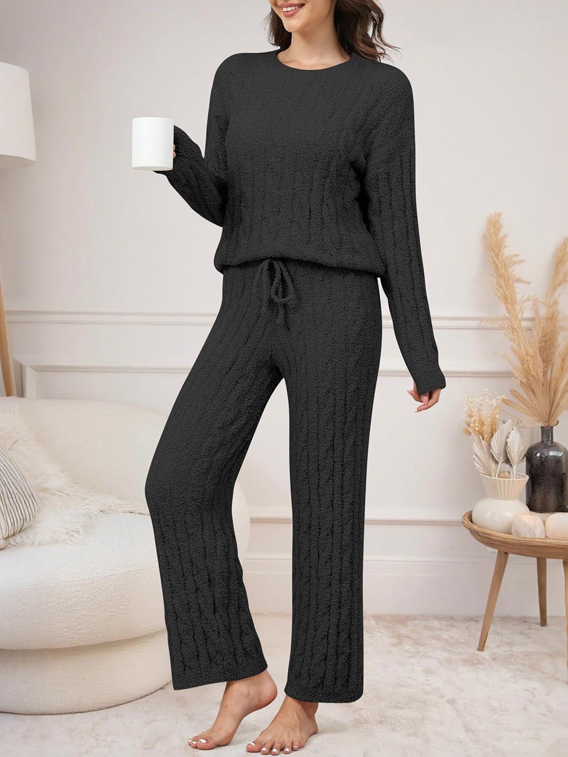 ANRABESS Women's Fuzzy Fleece Pajama Set 2 Piece Outfits Lounge Knit Oversized Sweater Pj Sets 2025 Fall Winter Loungewear(Black)