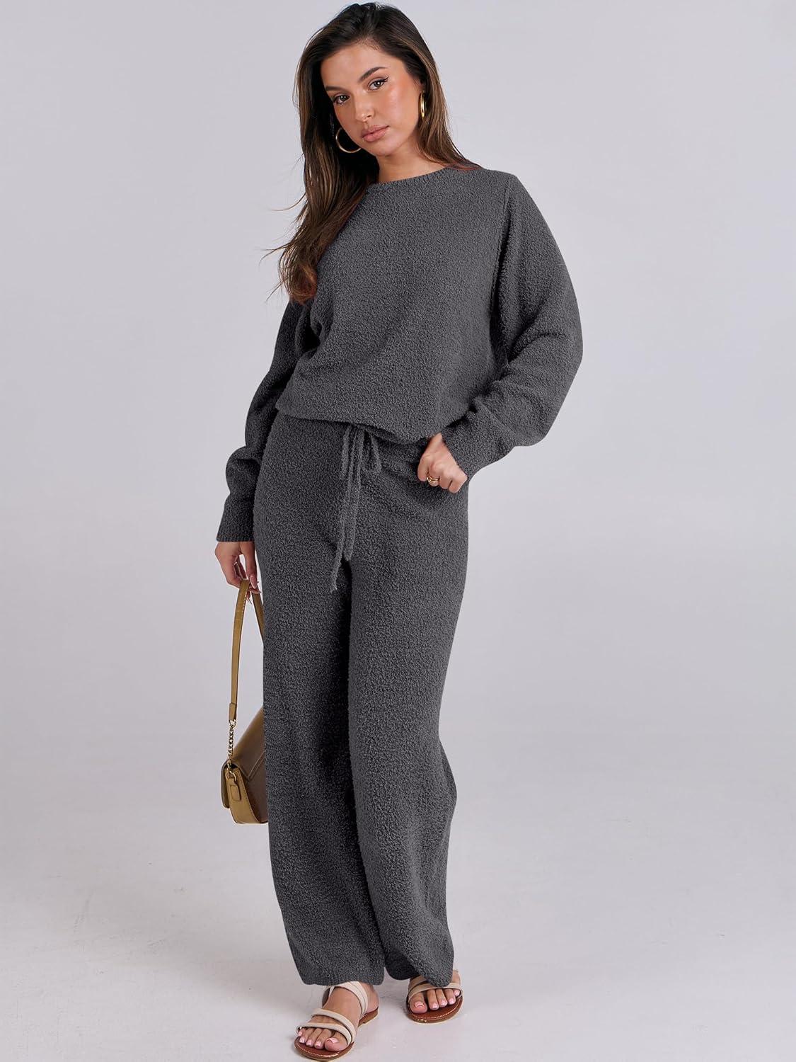 ANRABESS Women’s Fuzzy Fleece Pajama Sets 2 Piece Outfits Long Sleeve Top Wide Leg Pants Lounge Matching Set 2025 Fall Winter(Deep Gray)