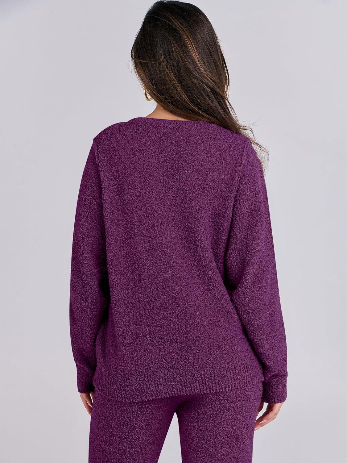 ANRABESS Women's Fuzzy Fleece Pajama Sets 2 Piece Outfits Long Sleeve Top Wide Leg Pants Lounge Matching Set 2025 Fall Winter(Deep Viole)