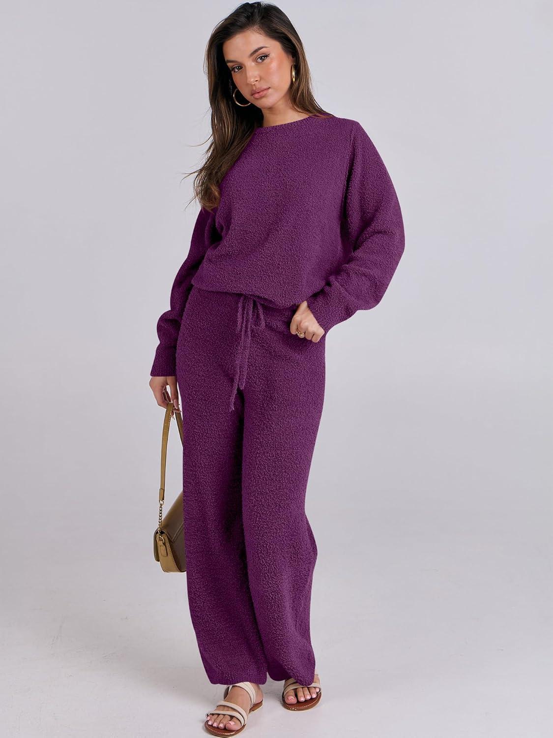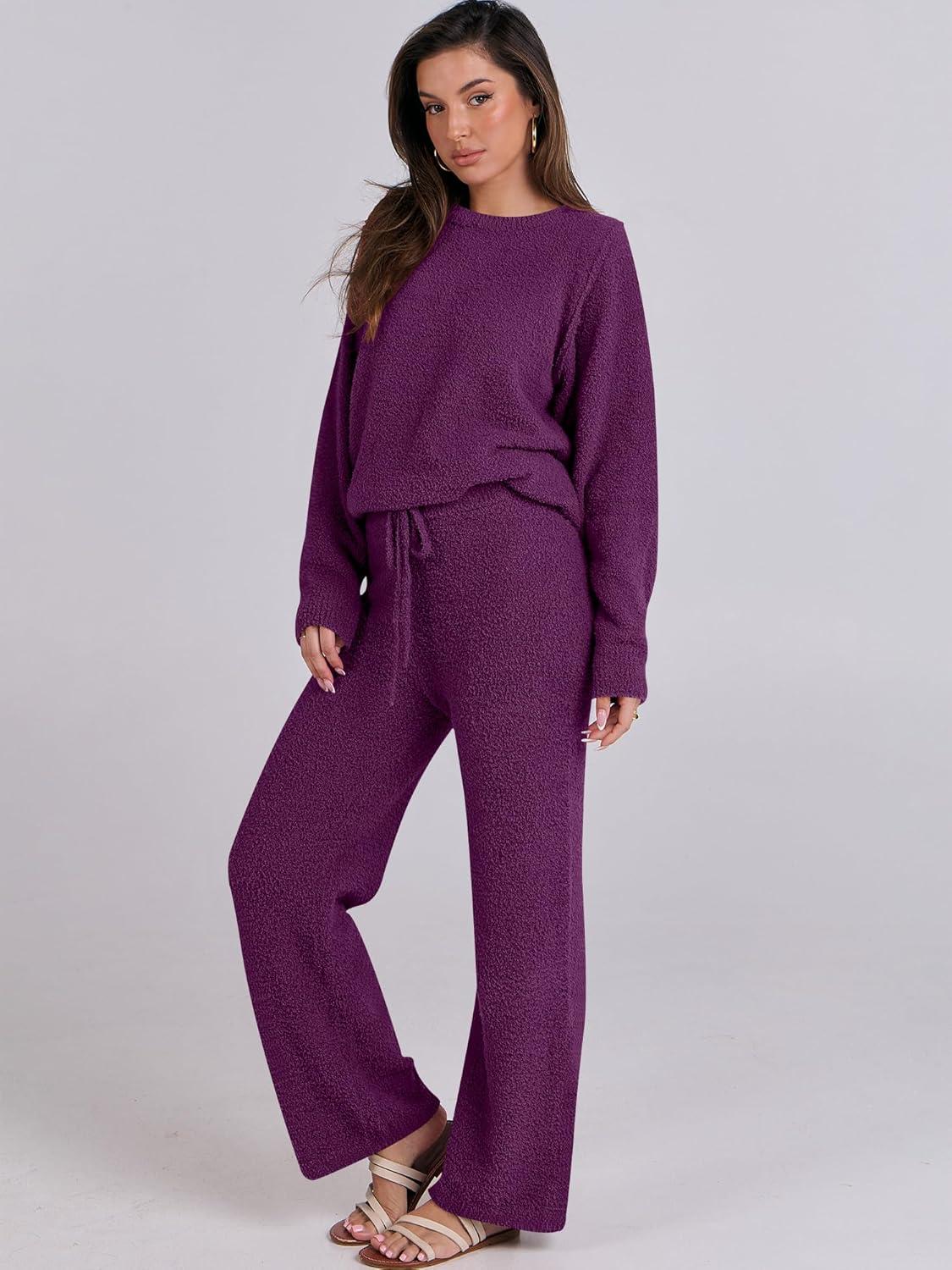 ANRABESS Women’s Fuzzy Fleece Pajama Sets 2 Piece Outfits Long Sleeve Top Wide Leg Pants Lounge Matching Set 2025 Fall Winter(Deep Viole)