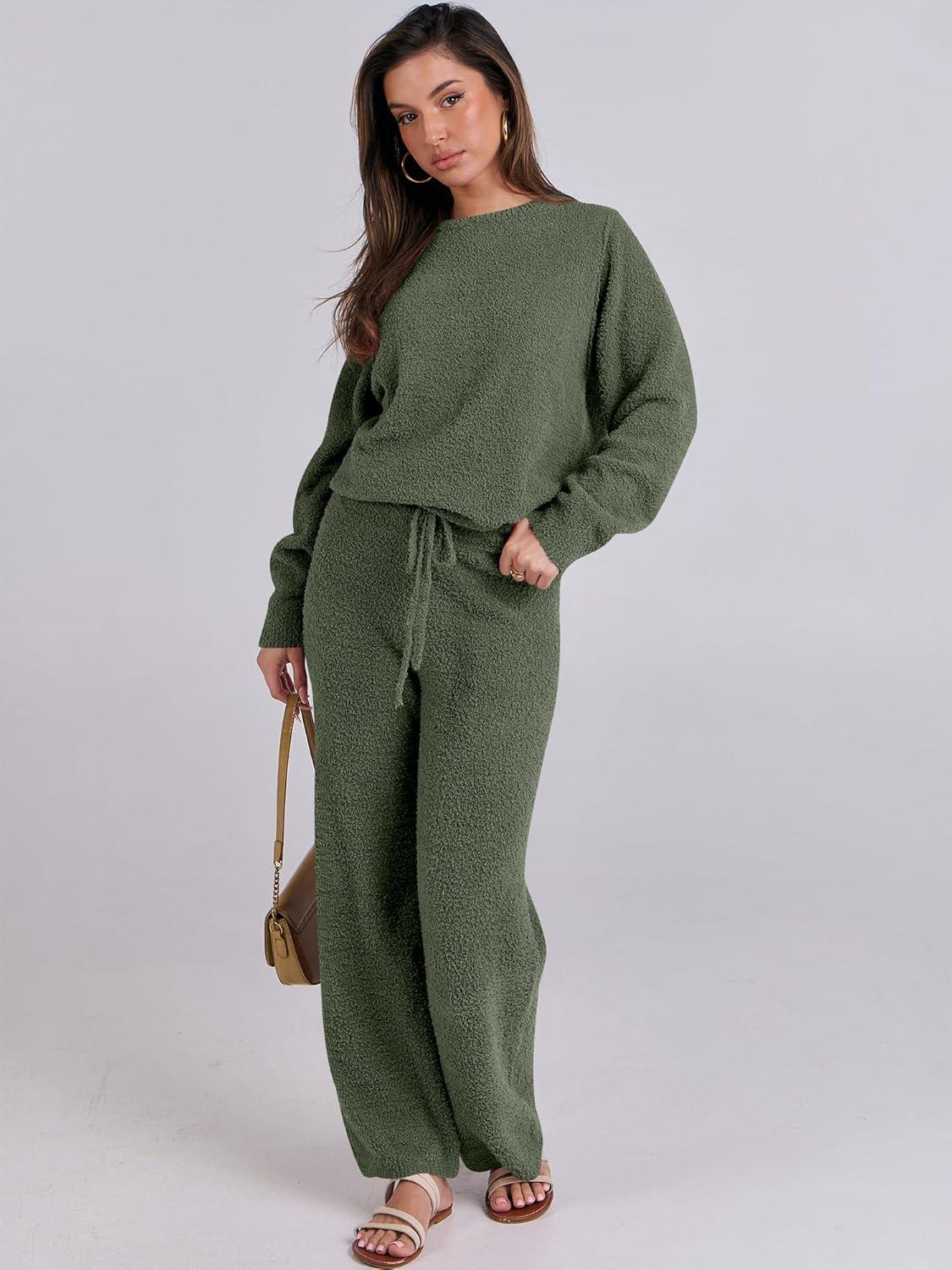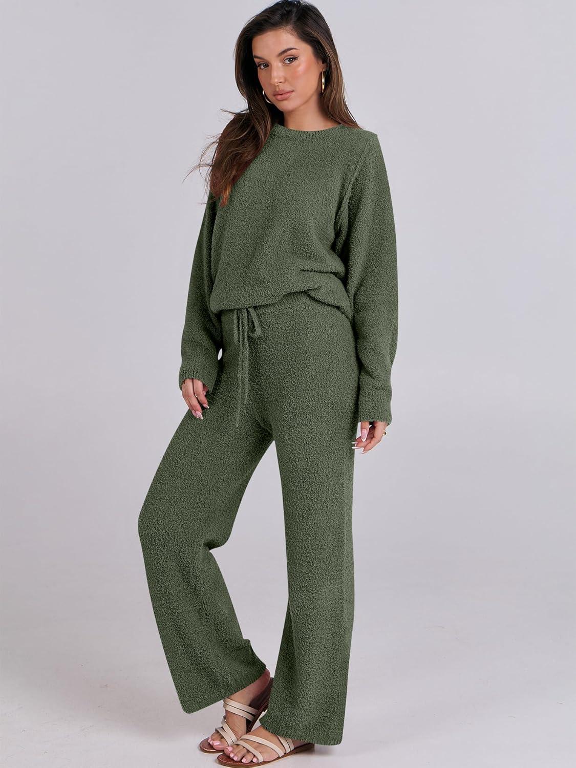 ANRABESS Women’s Fuzzy Fleece Pajama Sets 2 Piece Outfits Long Sleeve Top Wide Leg Pants Lounge Matching Set 2025 Fall Winter(Lawn Green)
