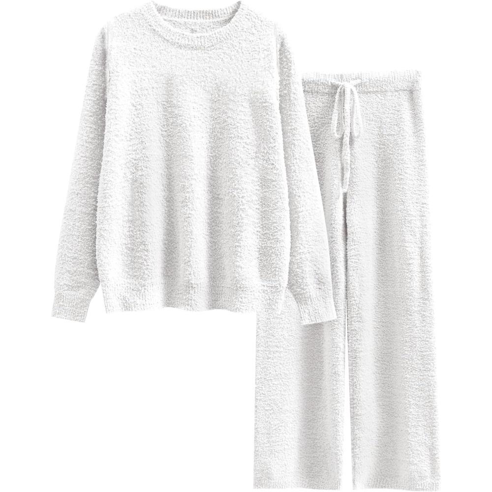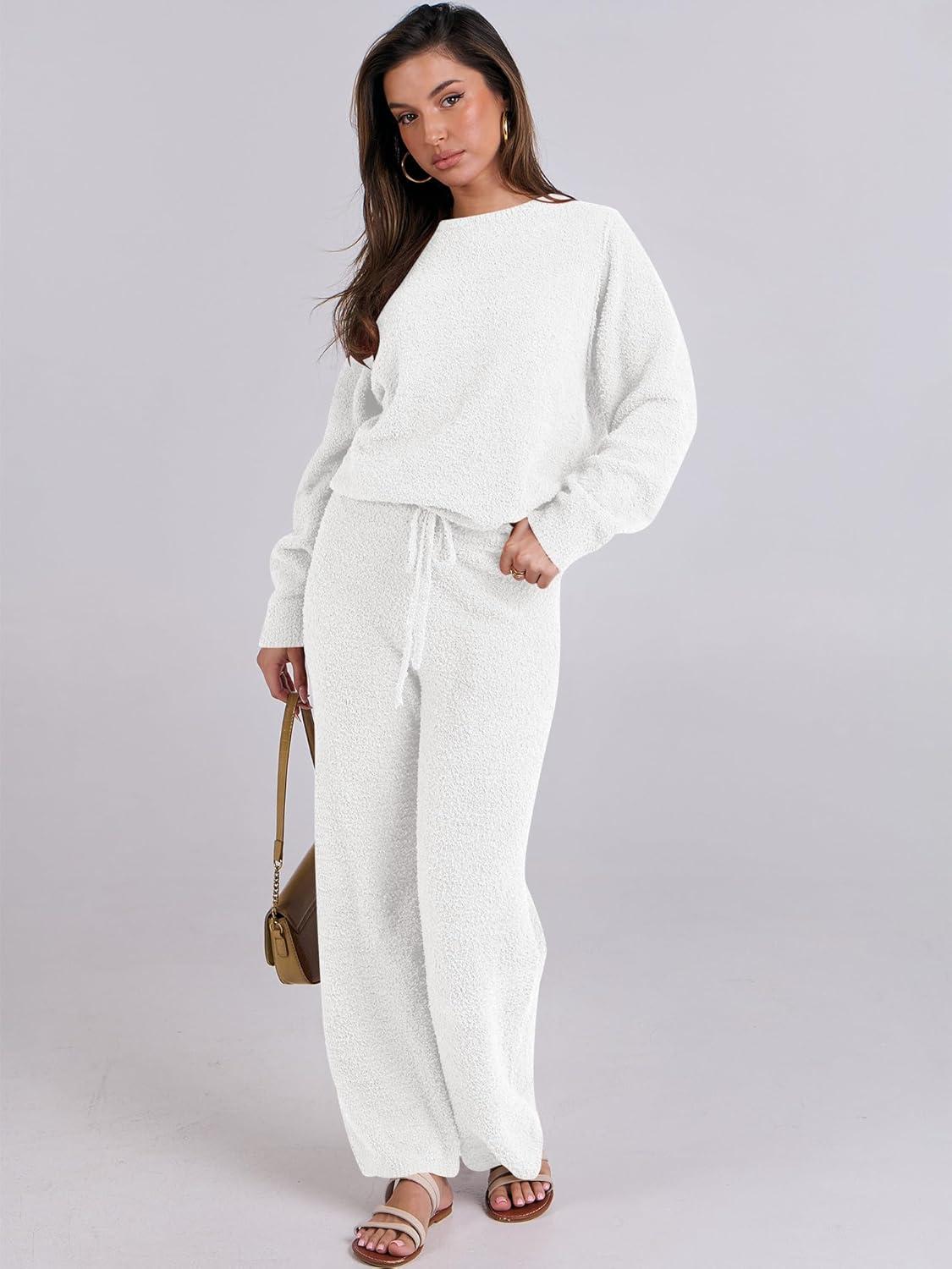 ANRABESS Women’s Fuzzy Fleece Pajama Sets 2 Piece Outfits Long Sleeve Top Wide Leg Pants Lounge Matching Set 2025 Fall Winter(White)