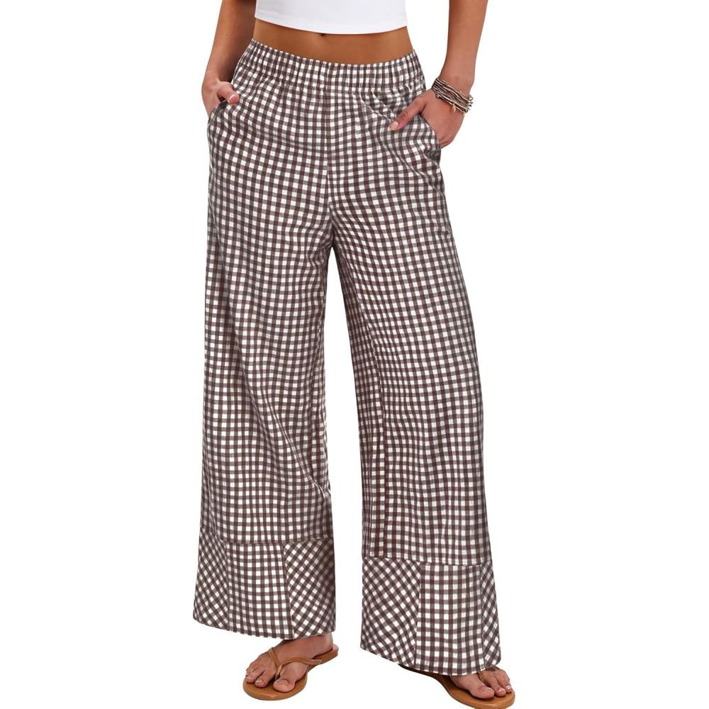imageANRABESS Womens Gingham Striped Boxer Pants Pajama Lounge PJ Bottoms Plaid Wide Leg Casual Cute Fall Trousers with PocketsBrown White Plaid
