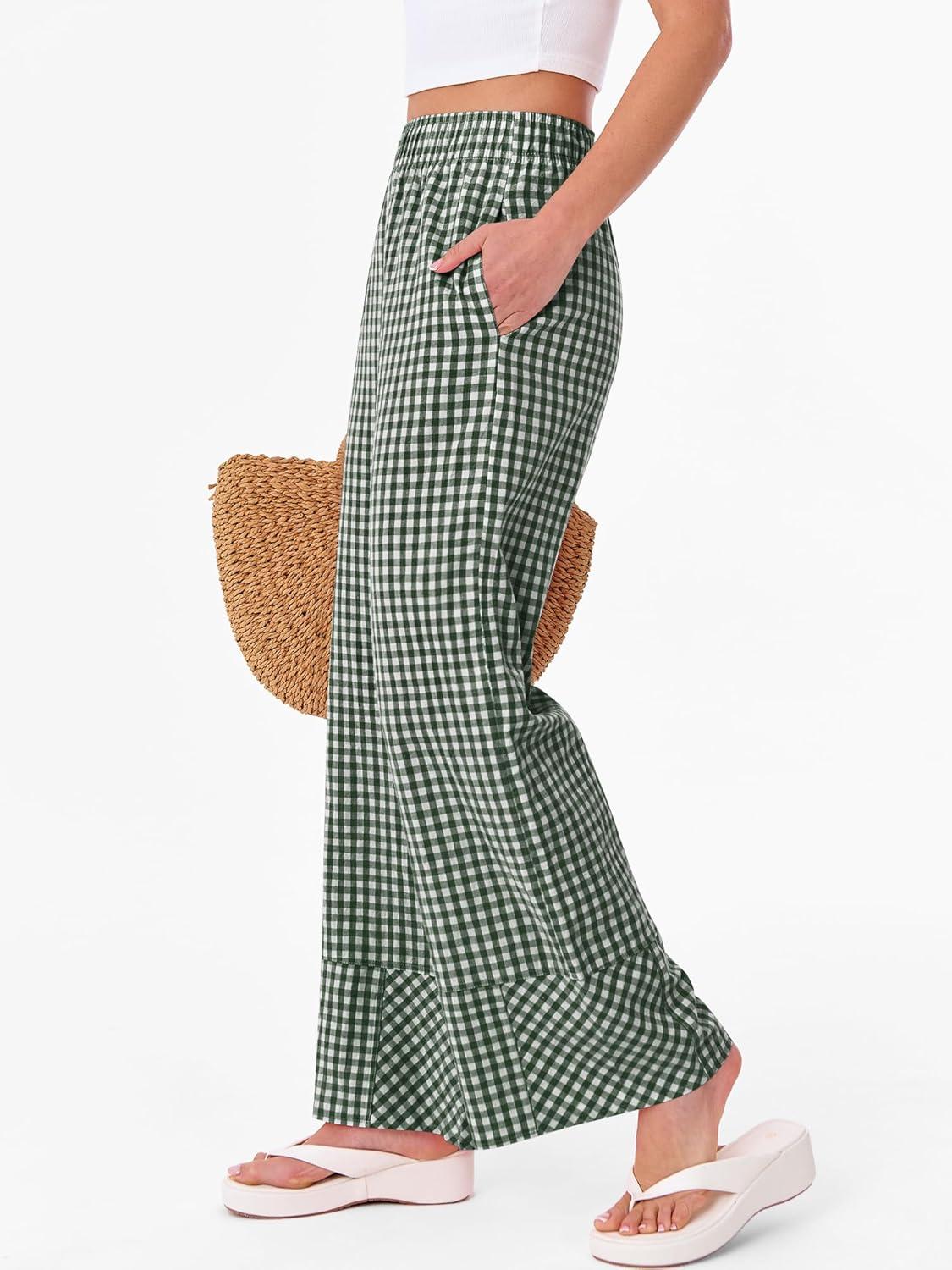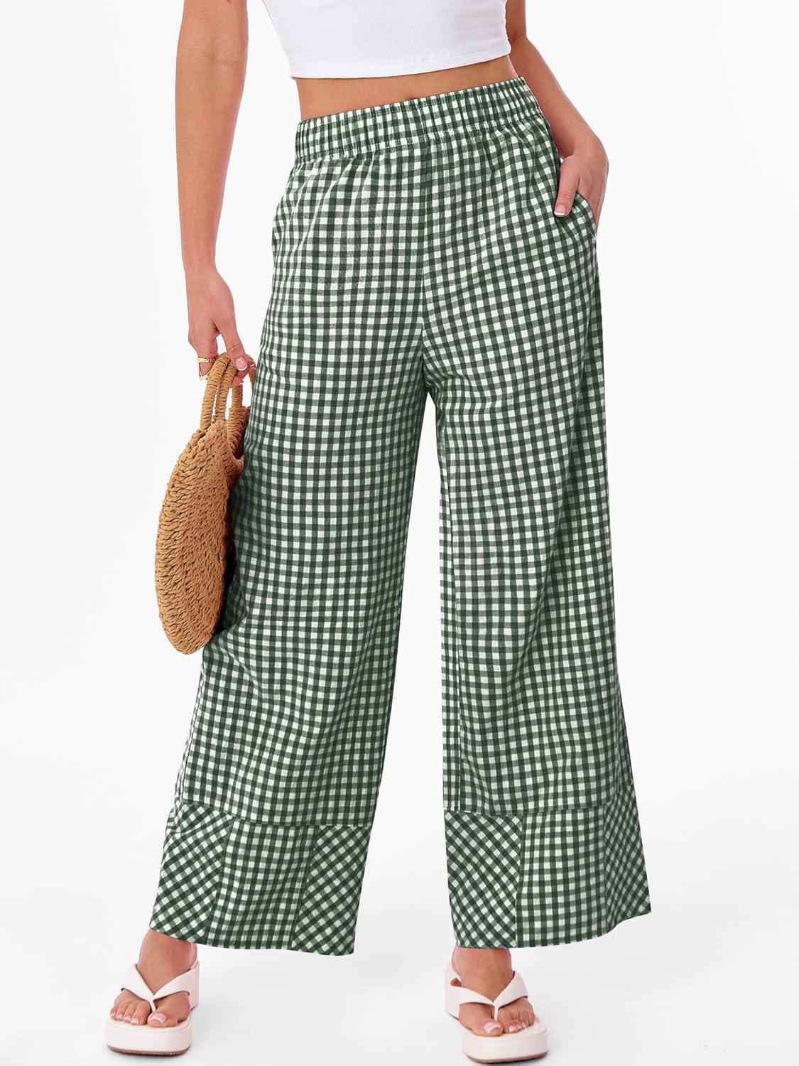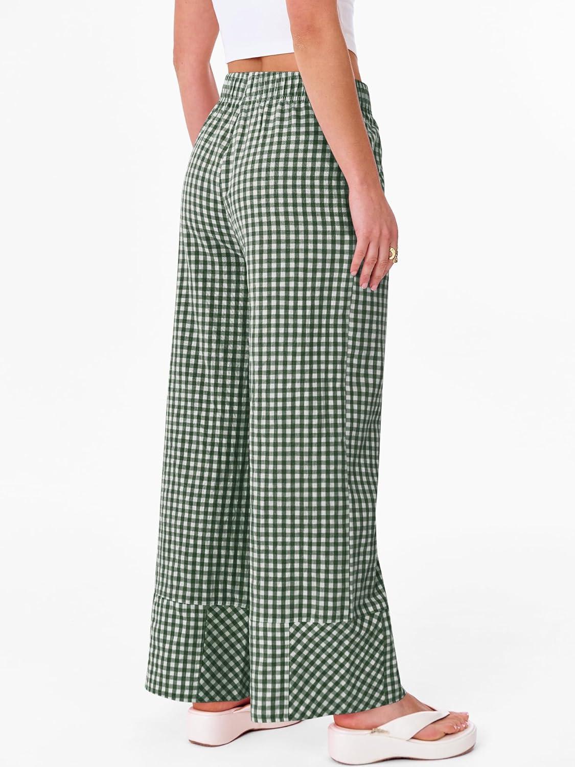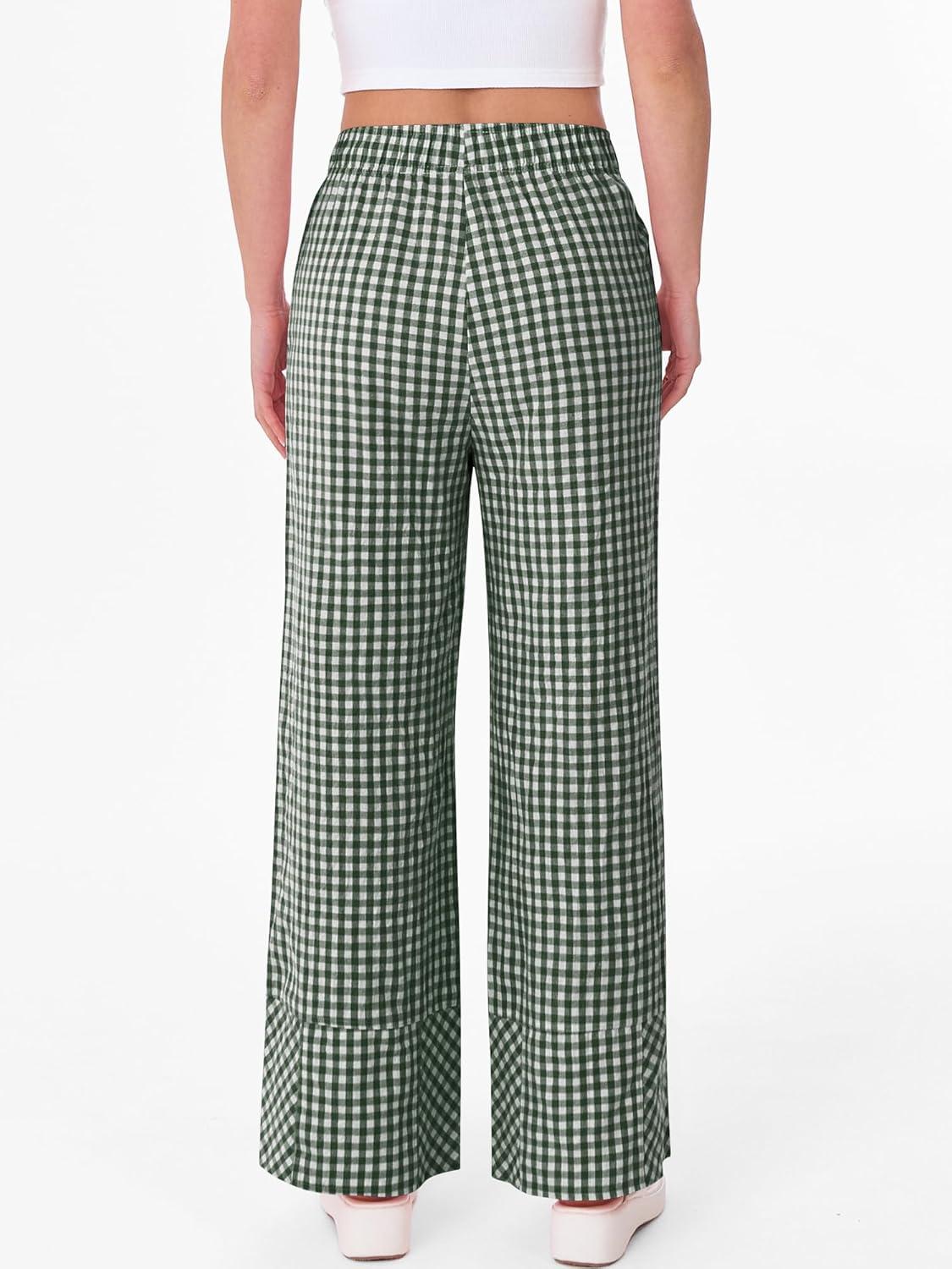 ANRABESS Womens Gingham Striped Boxer Pants Pajama Lounge PJ Bottoms Plaid Wide Leg Casual Cute Fall Trousers with Pockets(Deep Green White Plaid)
