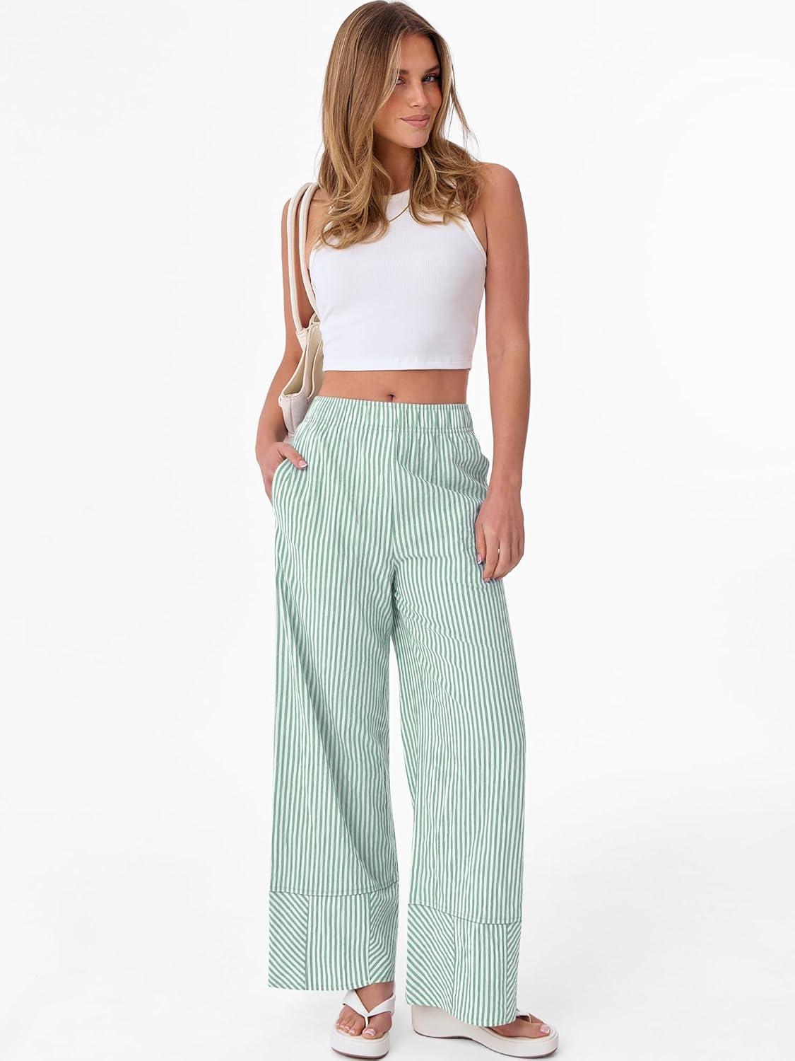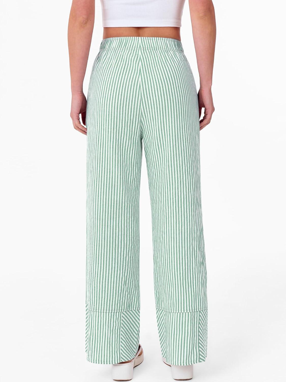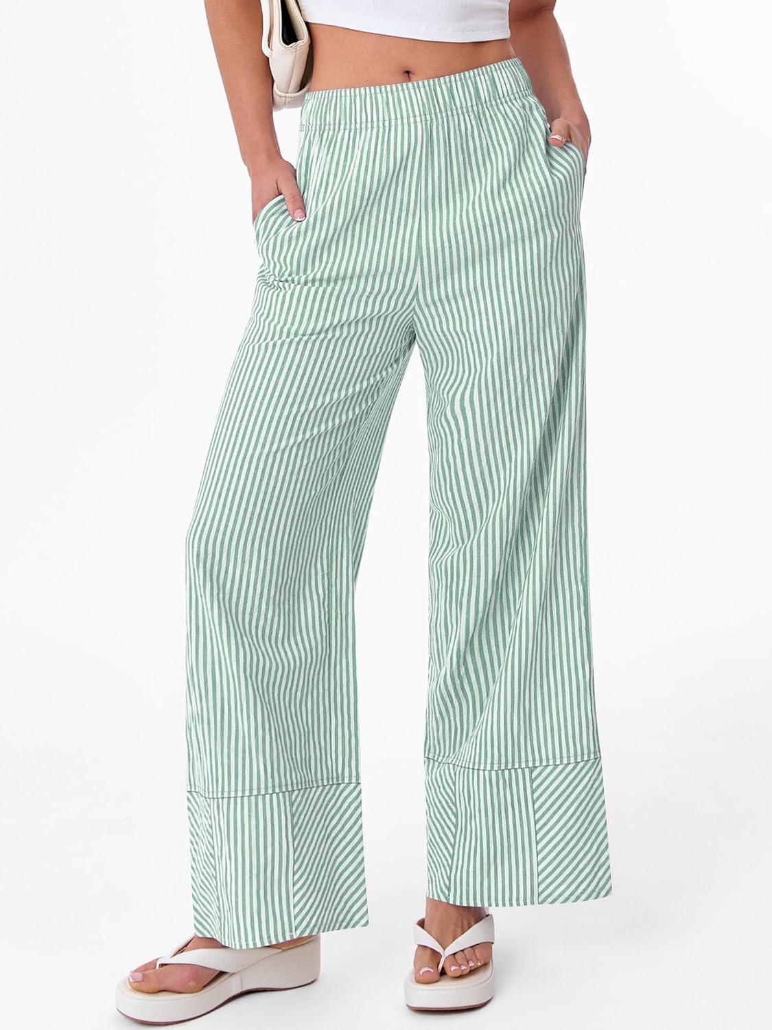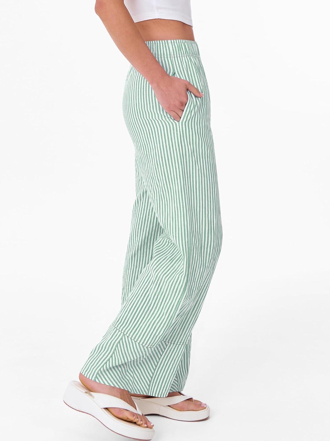 ANRABESS Womens Gingham Striped Boxer Pants Pajama Lounge PJ Bottoms Plaid Wide Leg Casual Cute Fall Trousers with Pockets(Green White Stripe)