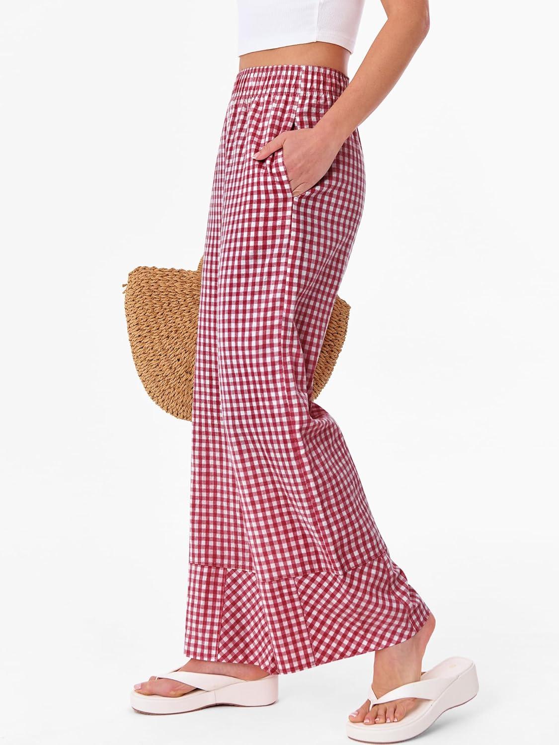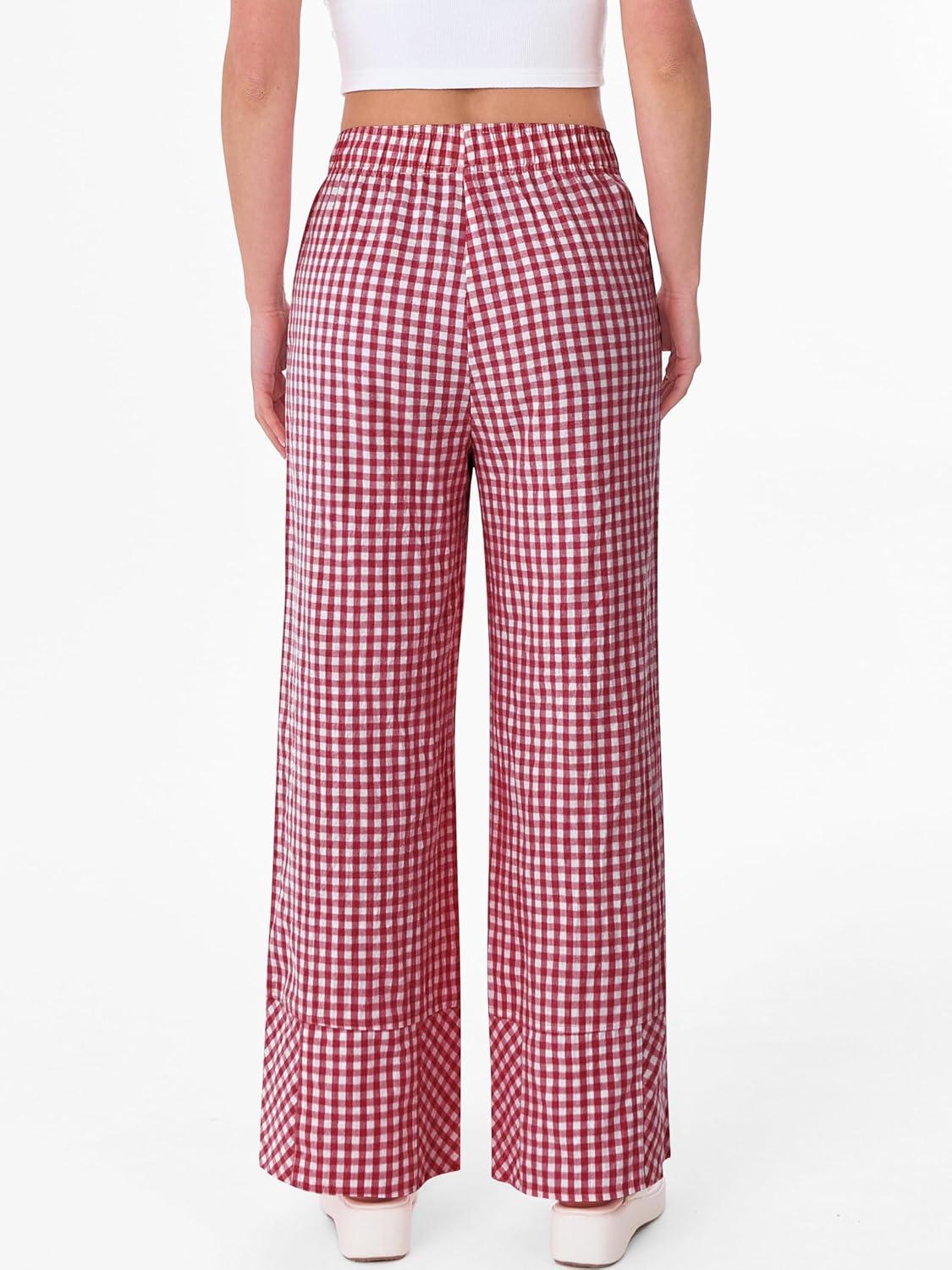 ANRABESS Womens Gingham Striped Boxer Pants Pajama Lounge PJ Bottoms Plaid Wide Leg Casual Cute Fall Trousers with Pockets(Red White Plaid)