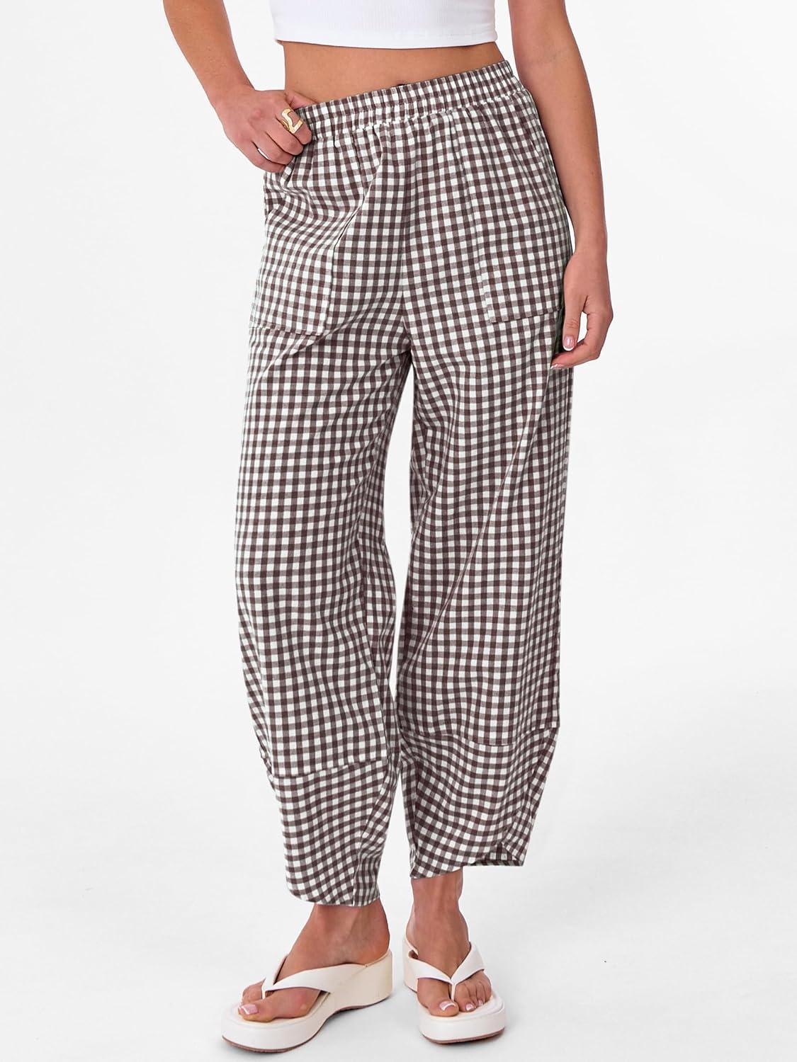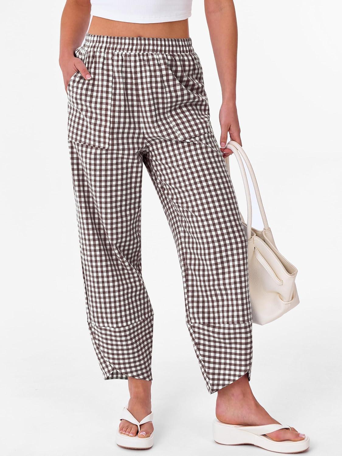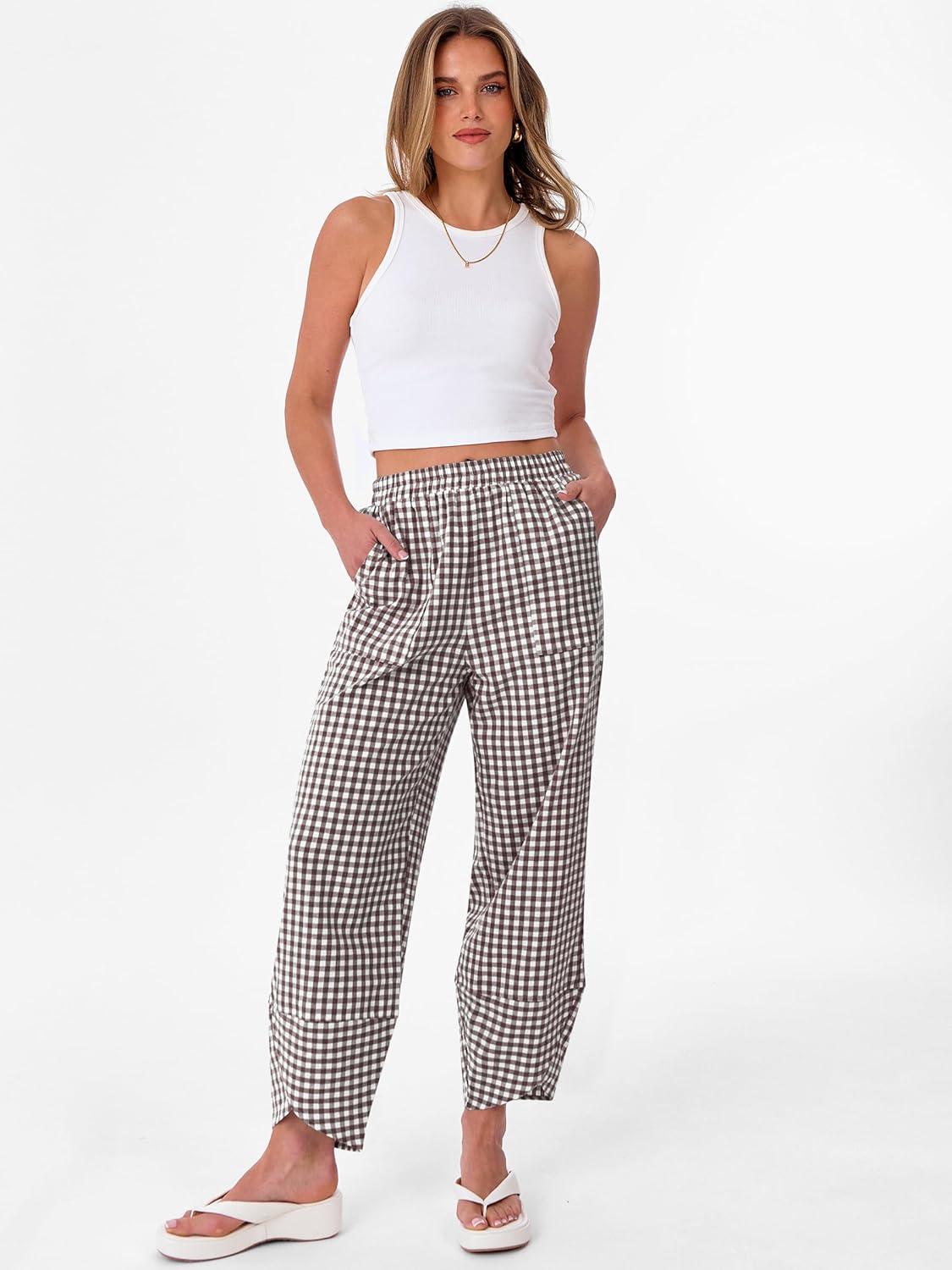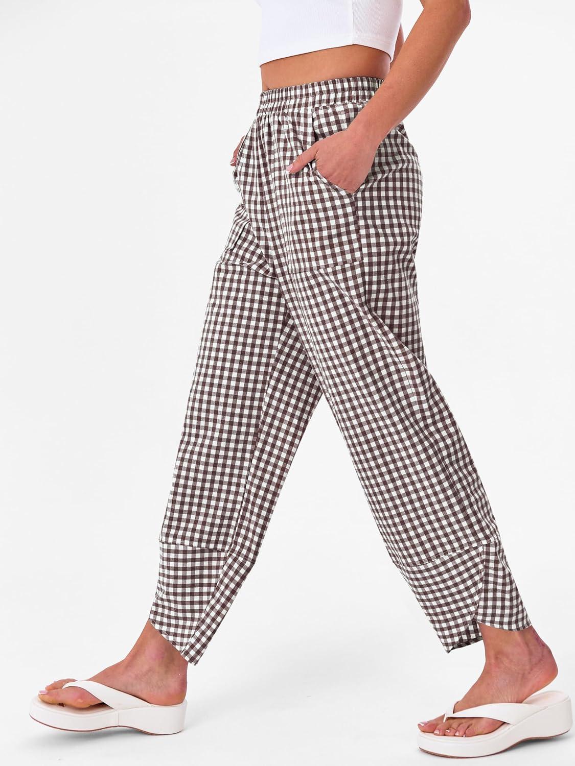 ANRABESS Womens Gingham Striped Palazzo Pants Wide Leg Pajama Lounge Crop Pants Plaid PJ Bottoms Cute Trousers with Pockets(Brown White Plaid)