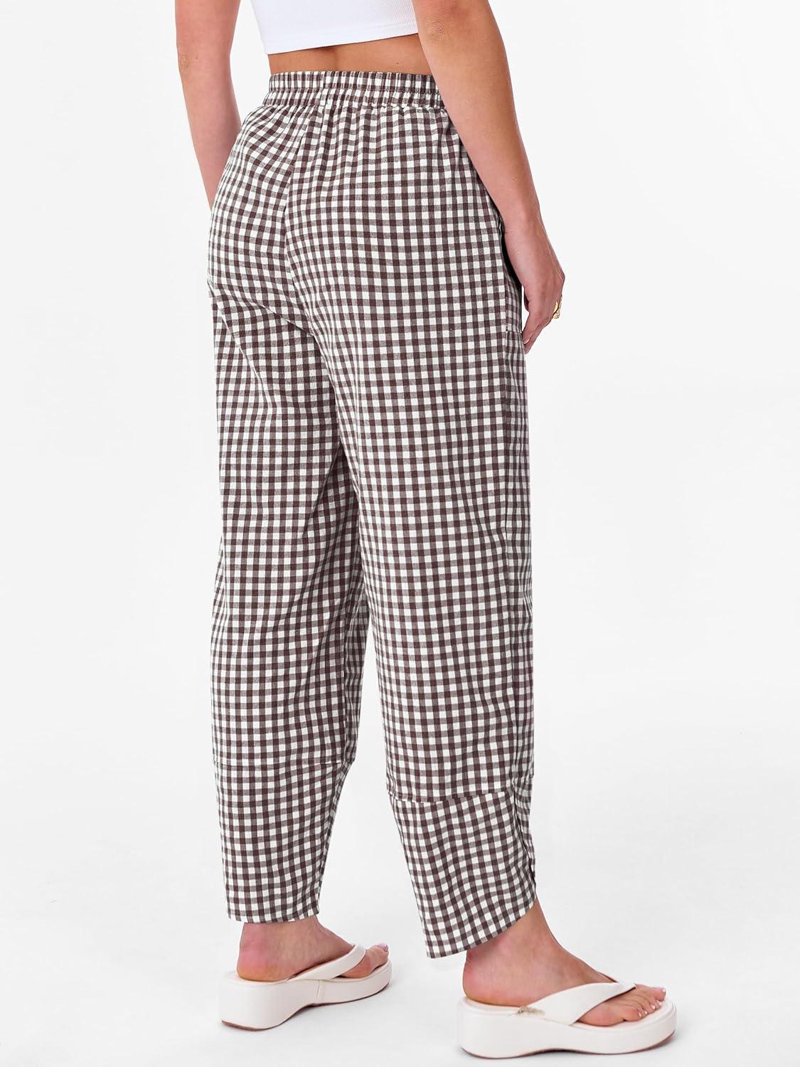 imageANRABESS Womens Gingham Striped Palazzo Pants Wide Leg Pajama Lounge Crop Pants Plaid PJ Bottoms Cute Trousers with PocketsBrown White Plaid