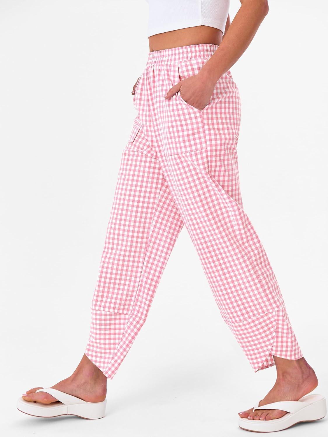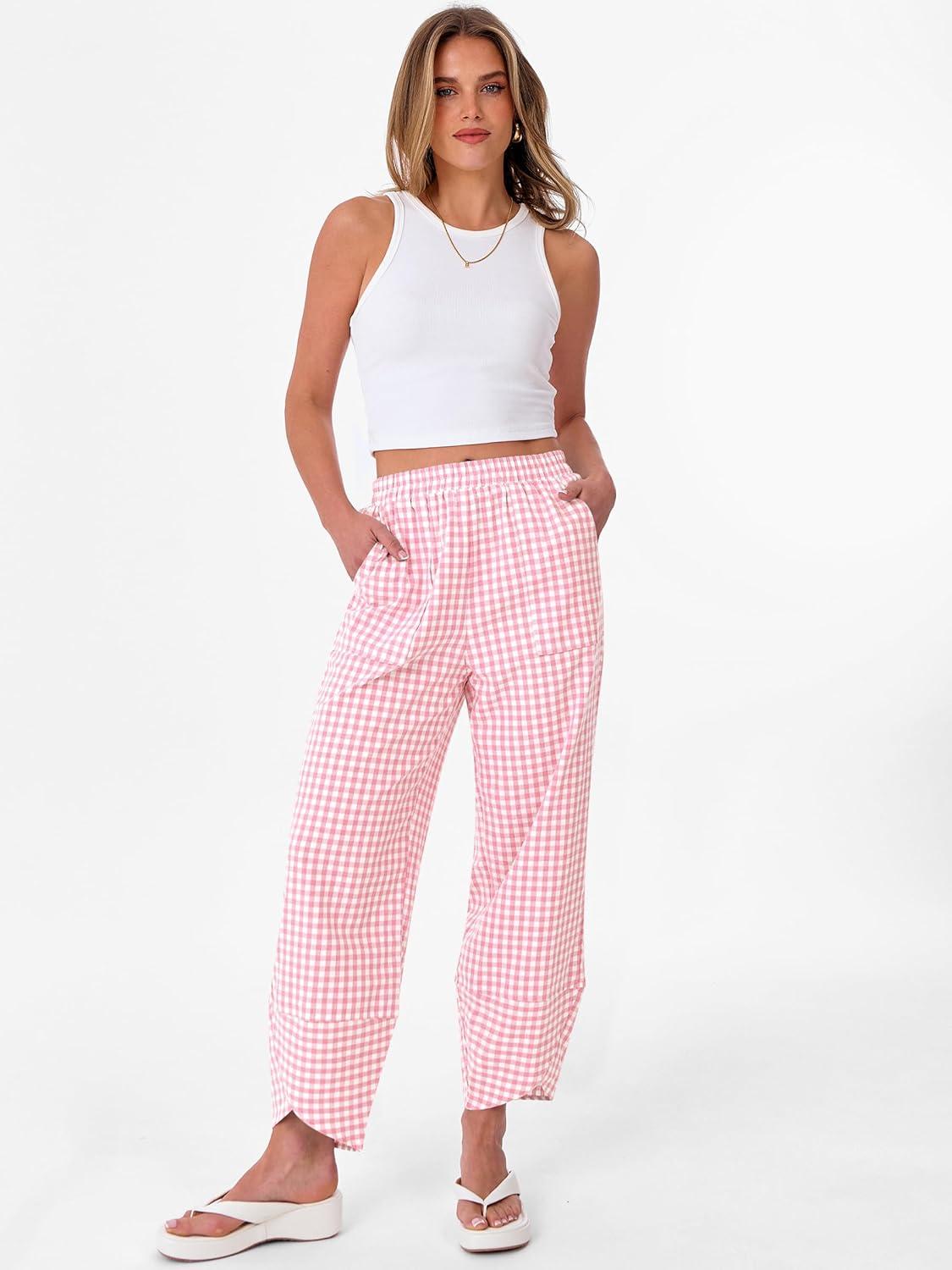 ANRABESS Womens Gingham Striped Palazzo Pants Wide Leg Pajama Lounge Crop Pants Plaid PJ Bottoms Cute Trousers with Pockets(Pink White Plaid)