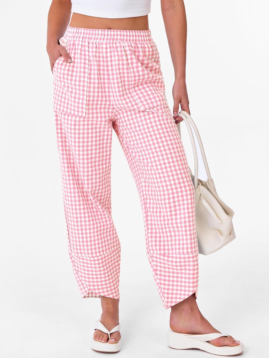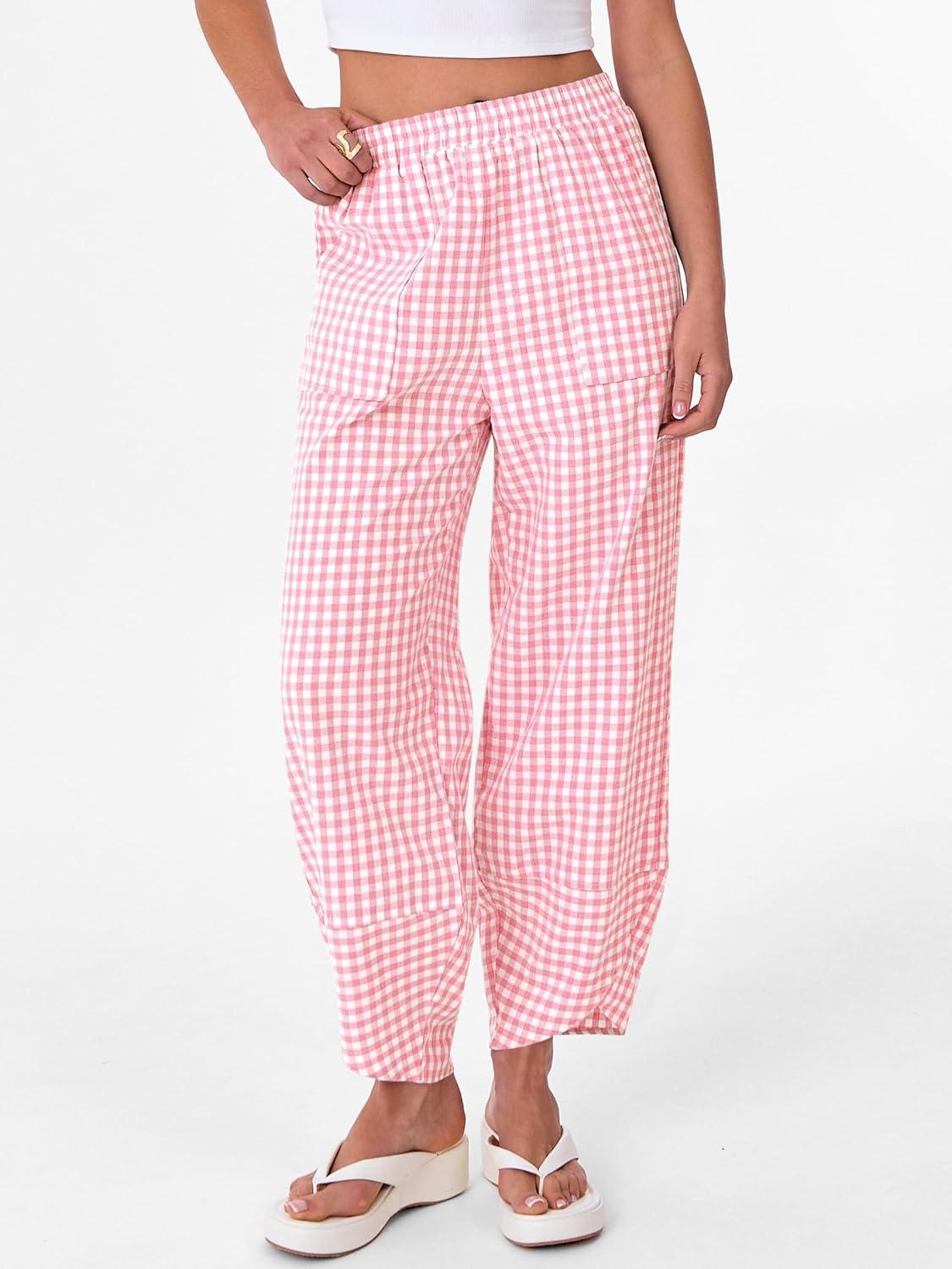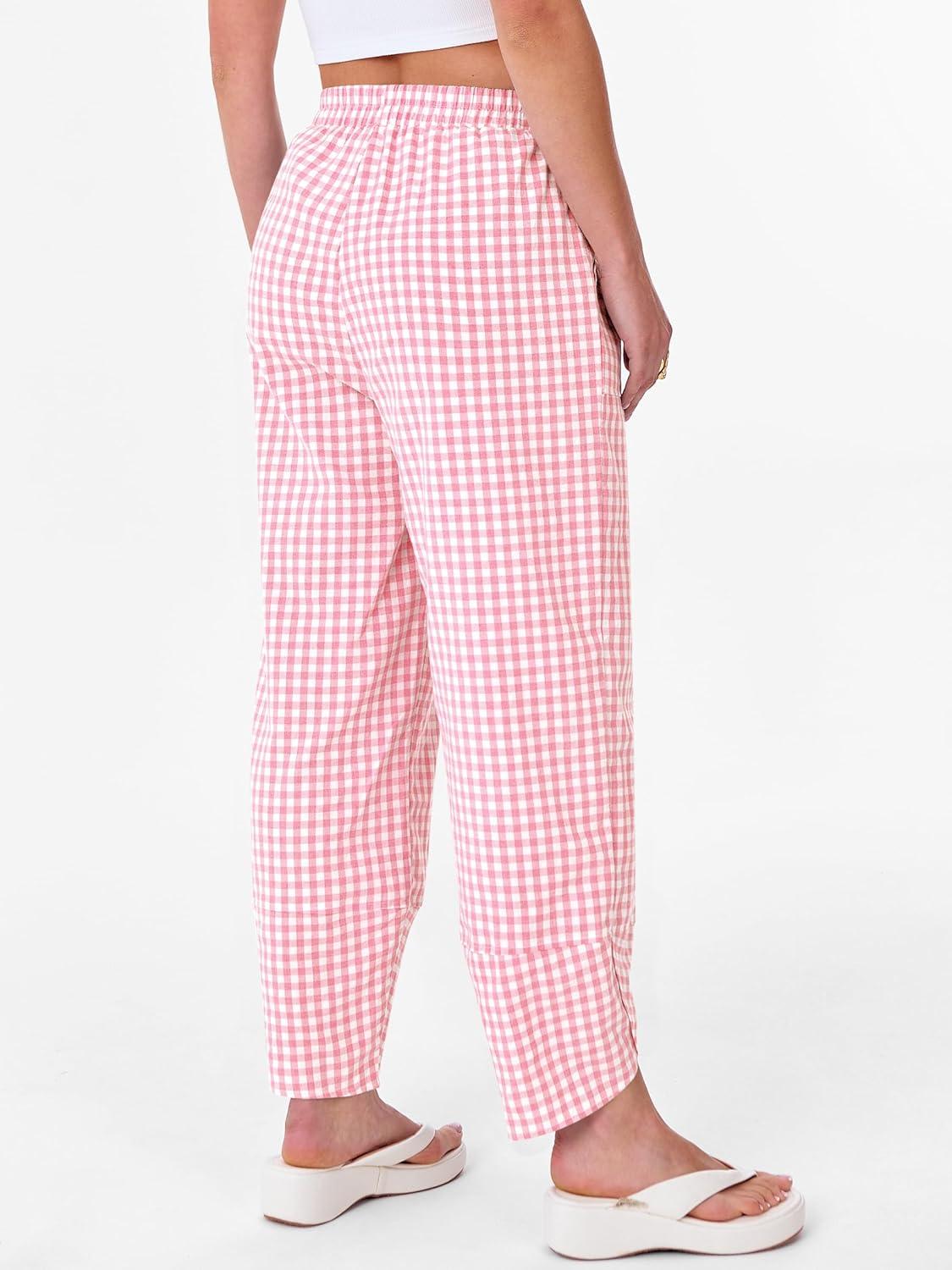 imageANRABESS Womens Gingham Striped Palazzo Pants Wide Leg Pajama Lounge Crop Pants Plaid PJ Bottoms Cute Trousers with PocketsPink White Plaid