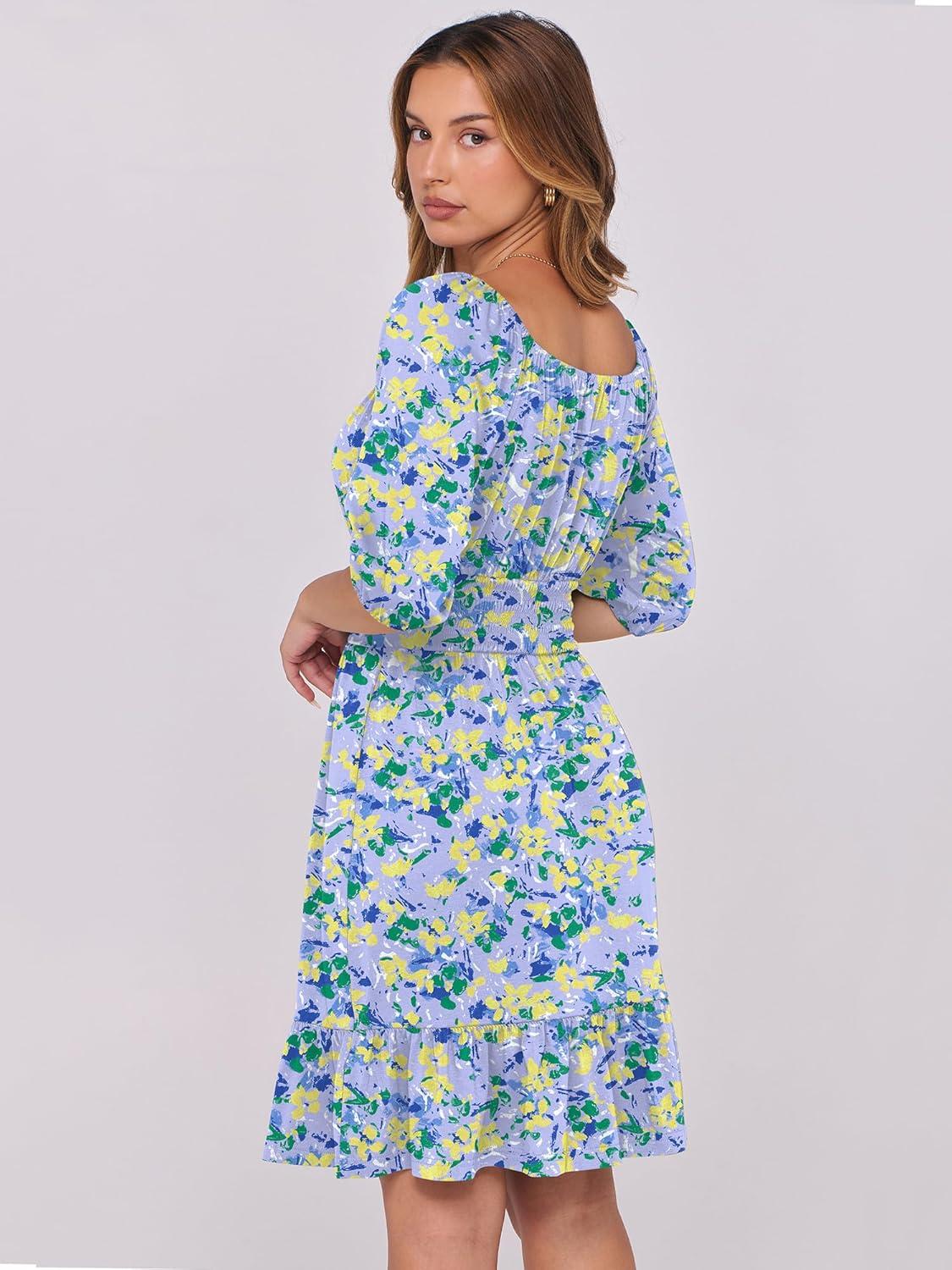 imageANRABESS Womens Half Sleeve Mini Dress 2025 Fall Square Neck Casual Flowy Wedding Guest Dresses Summer Beach Vacation OutfitsBlue Yellow Floral