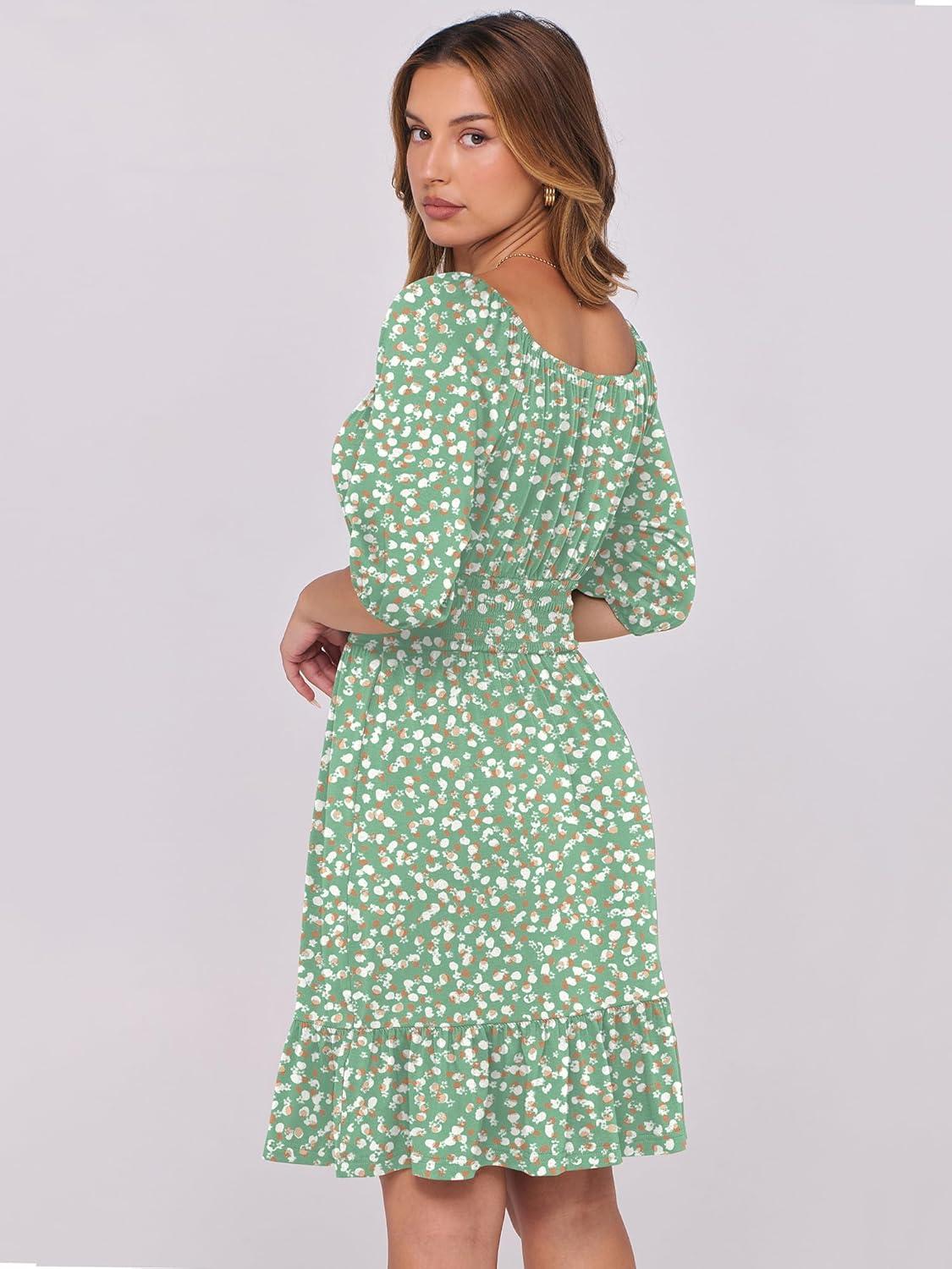 ANRABESS Womens Half Sleeve Mini Dress 2025 Fall Square Neck Casual Flowy Wedding Guest Dresses Summer Beach Vacation Outfits(White Brown Dot)