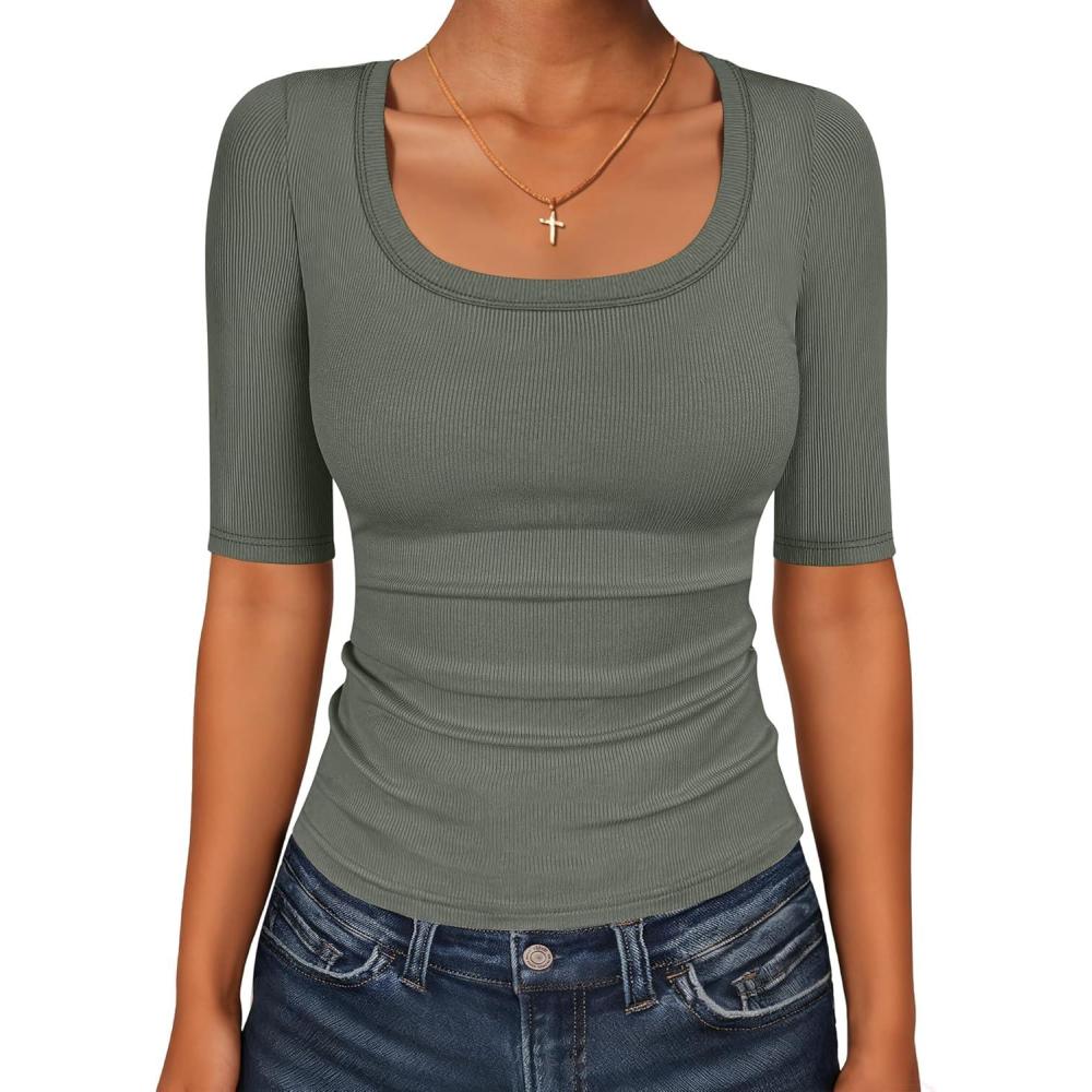 ANRABESS Womens Half Sleeve Tops Scoop Neck Ribbed Knit Slim Fitted Basic Tee Shirts Summer 2026 Trendy Spring Casual Clothes(Army Green)