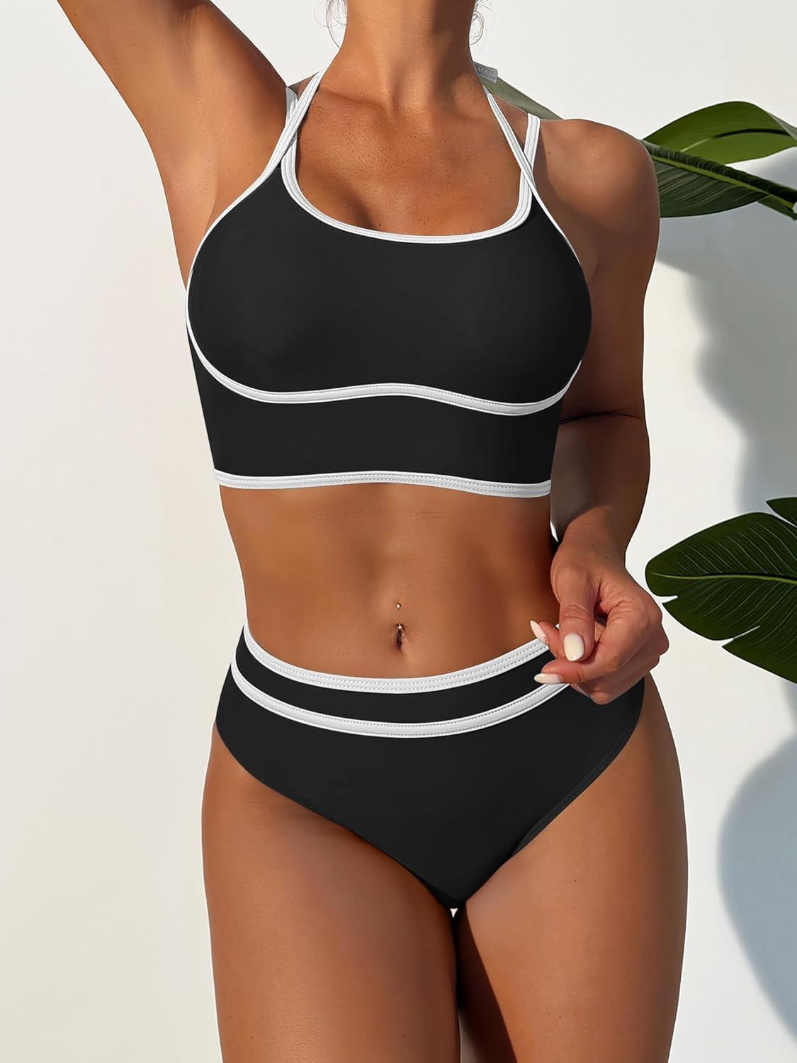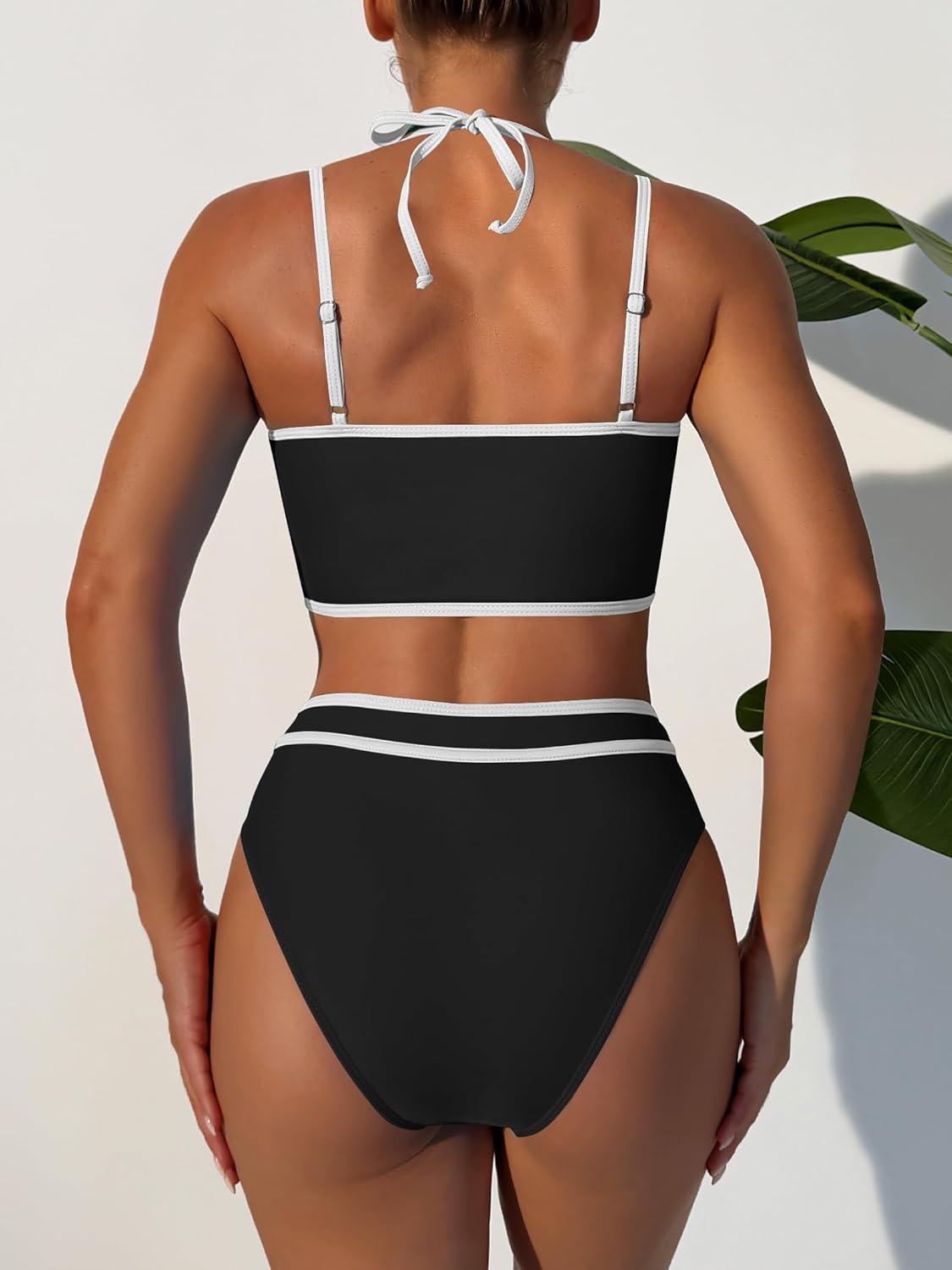 ANRABESS Womens Halter Bikini Sets Color Block Two Piece Swimsuits High Waisted Bathing Suits Summer Sporty Cheeky Swimwear(Black)