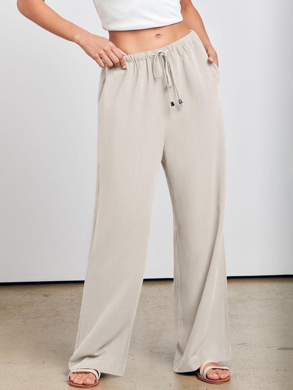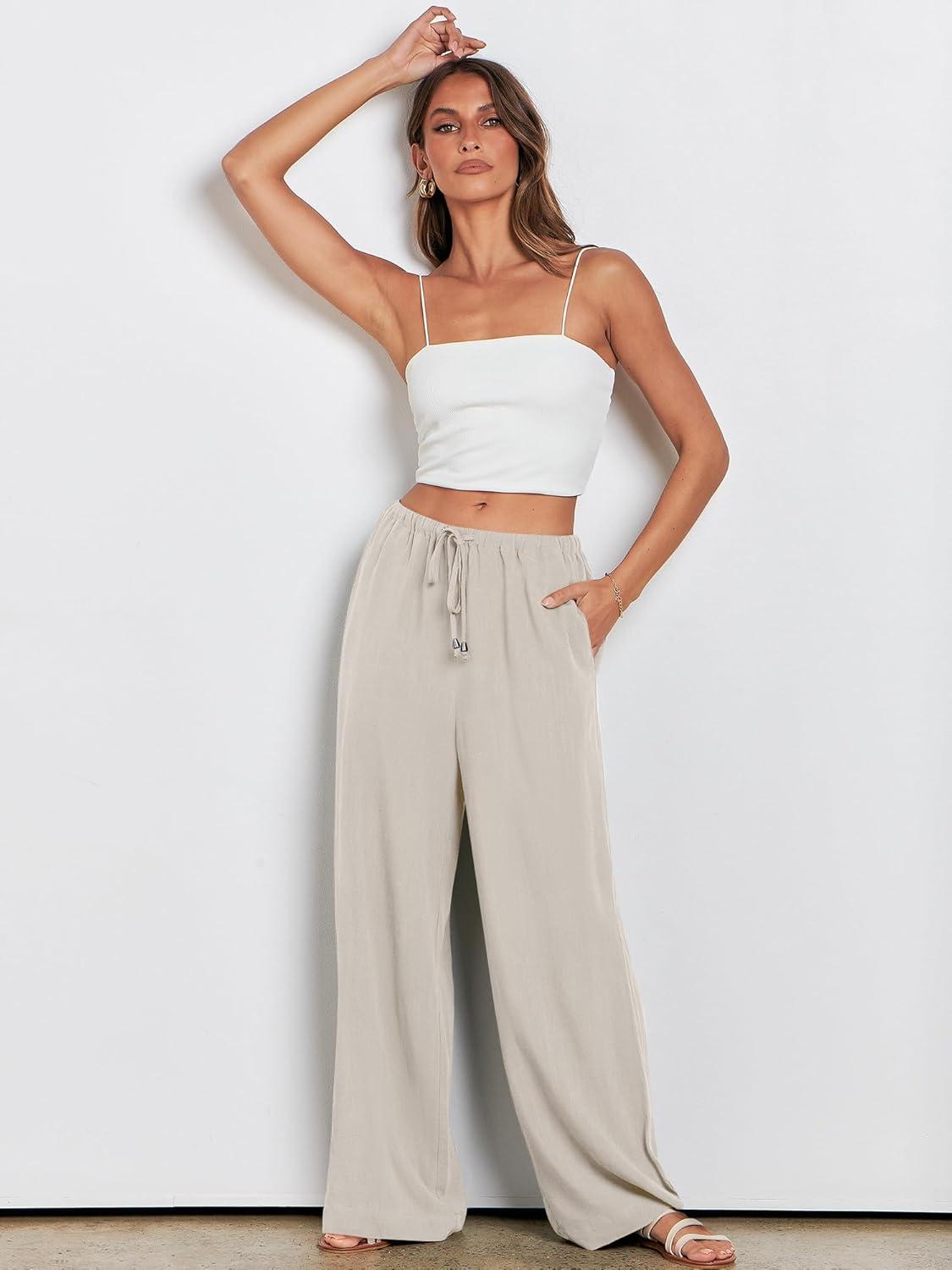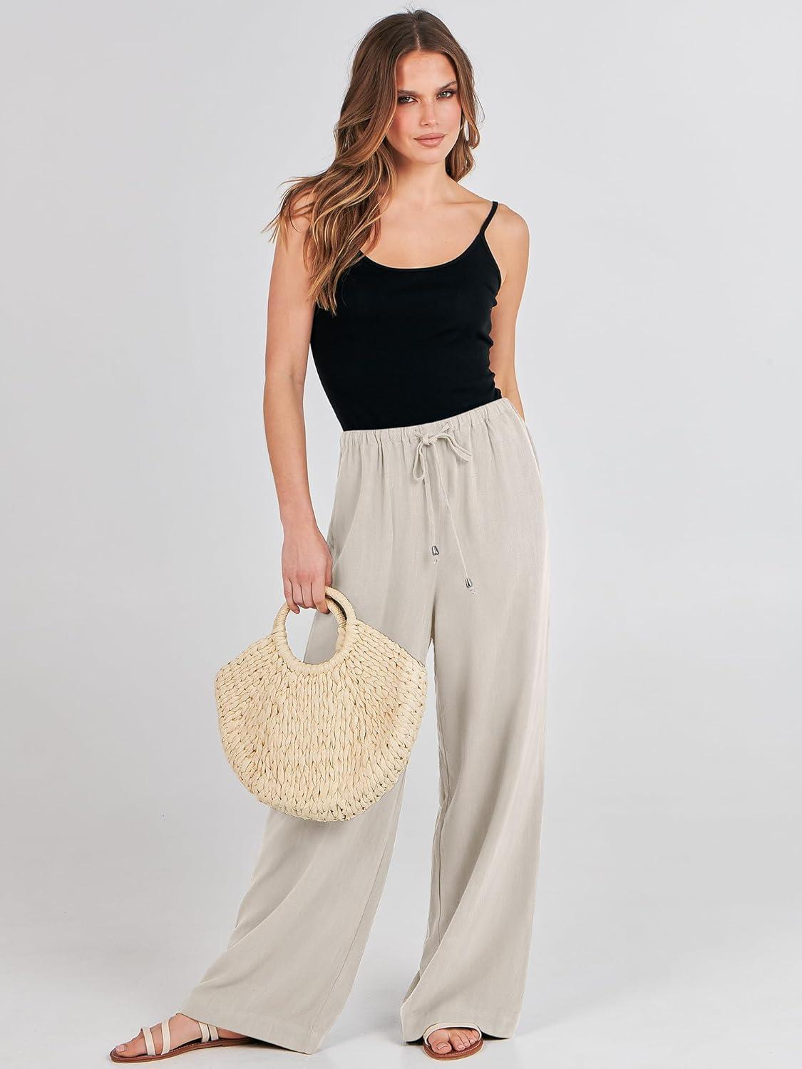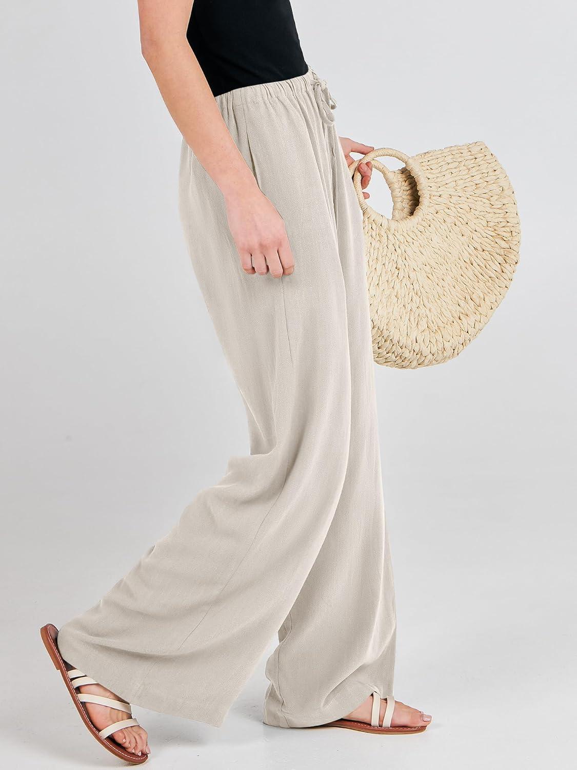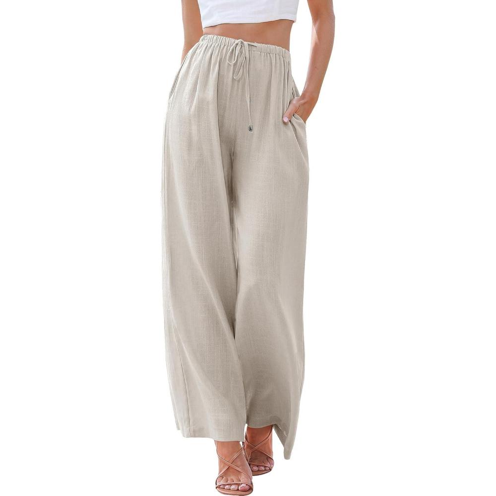 ANRABESS Womens Linen Palazzo Pants Summer Flowy Wide Leg Drawstring Casual Trousers with Pockets Beach Vacation Outfits(Light Khaki)
