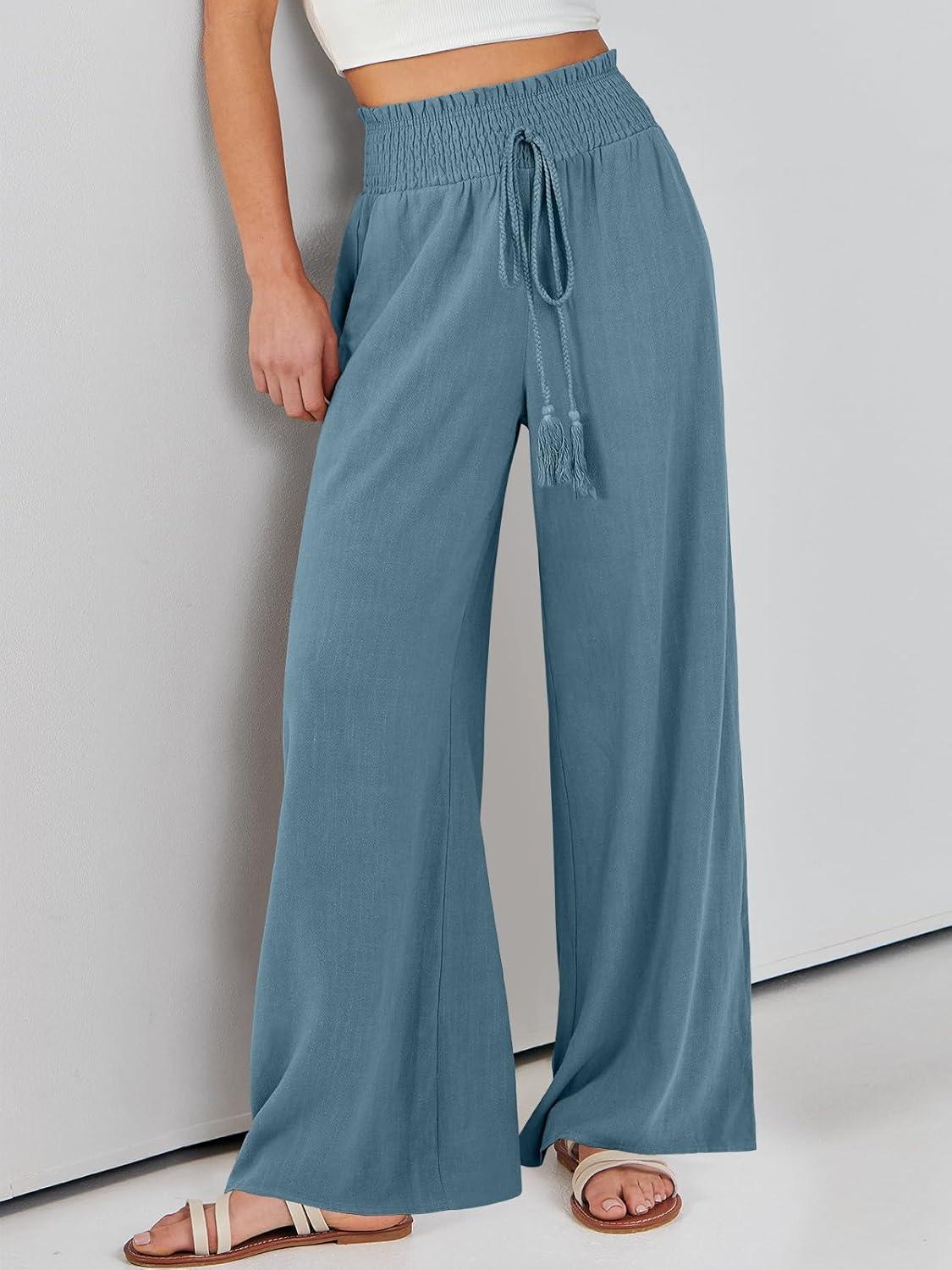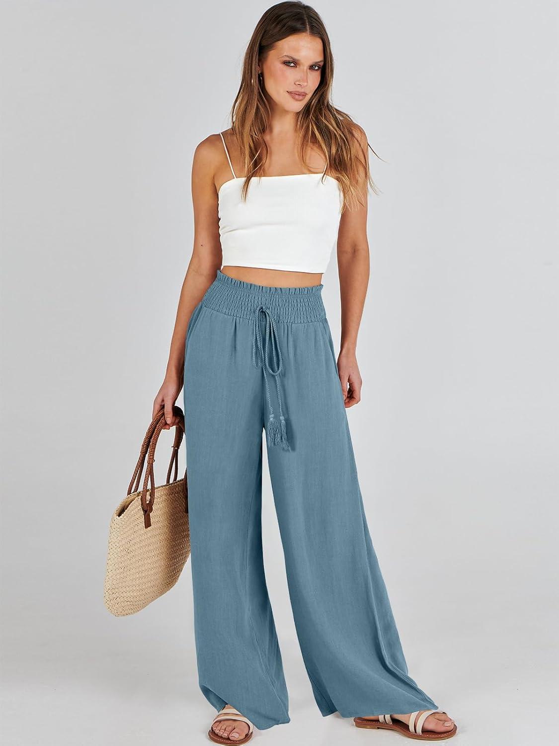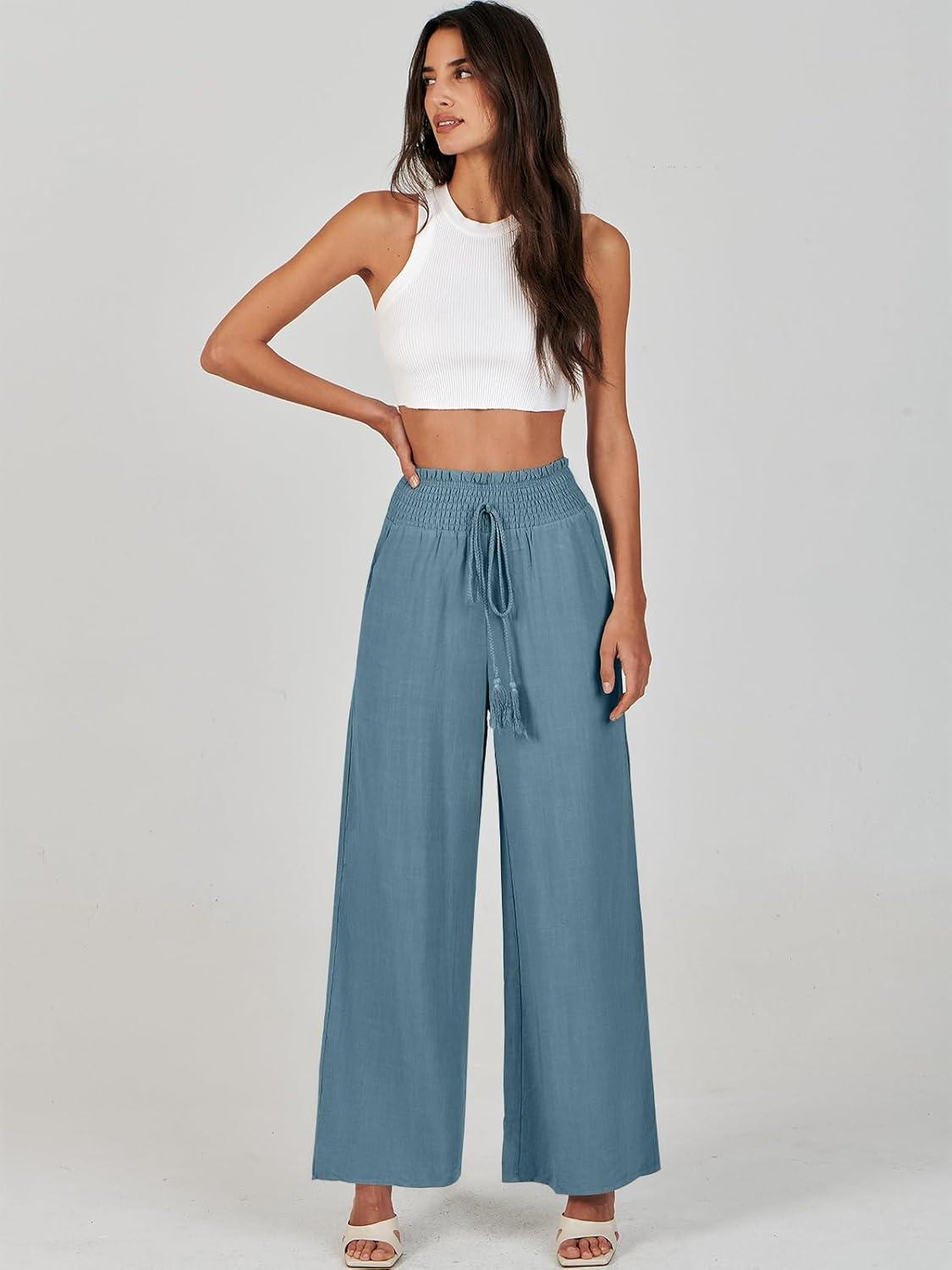 ANRABESS Women Linen Palazzo Pants Summer Casual Loose High Waist Wide Leg Long Lounge Pant Trousers with Pocket