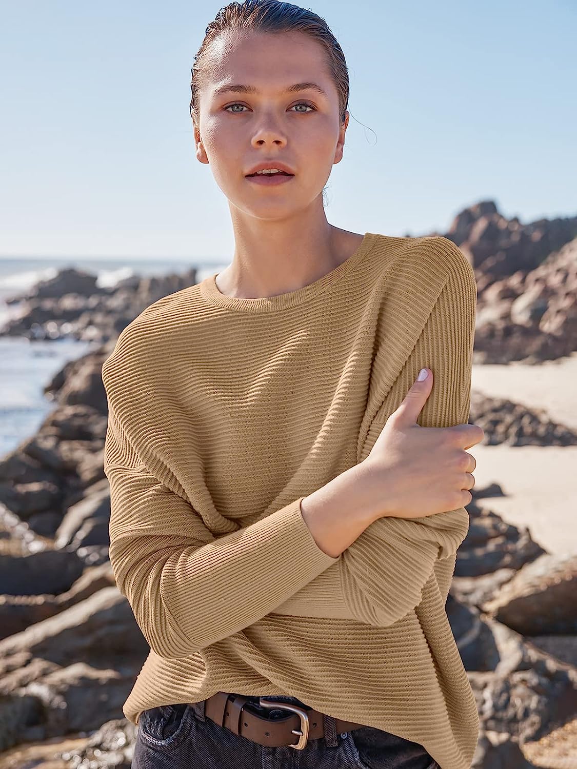 ANRABESS Women’s Long Batwing Sleeve Crewneck Casual Loose Ribbed Knit Fall Sweater Pullover with Split(Khaki)
