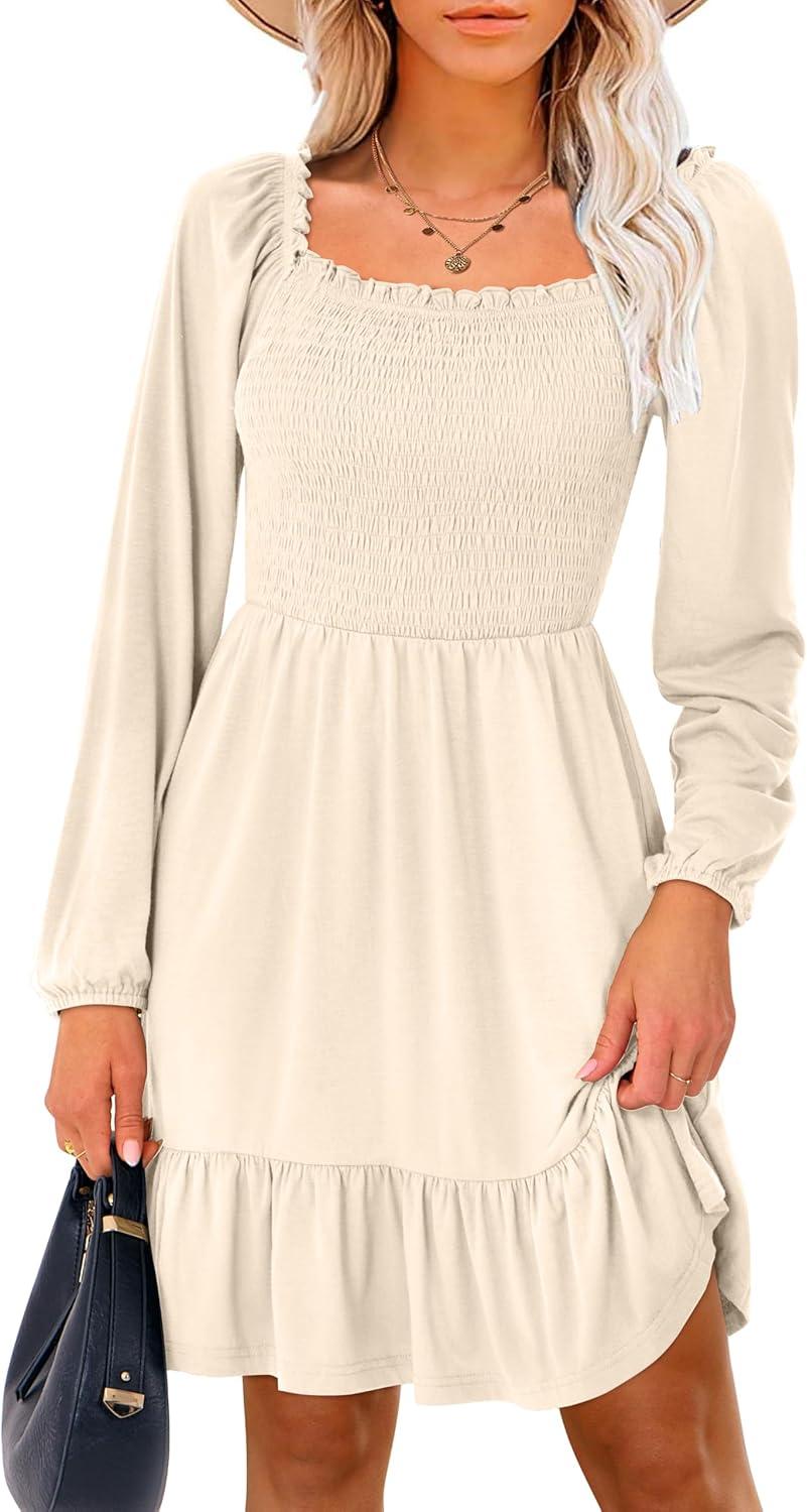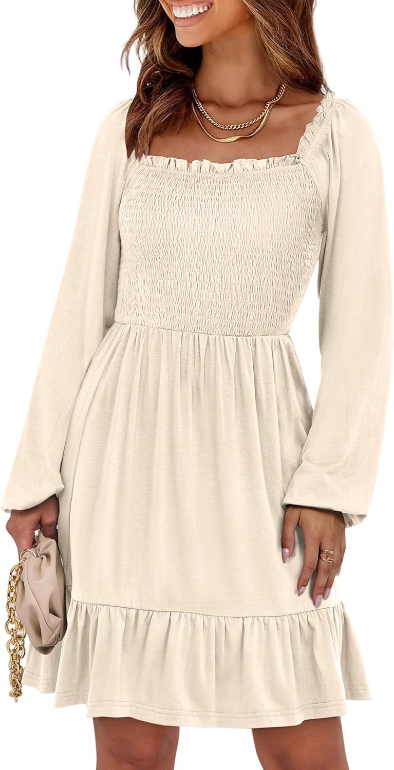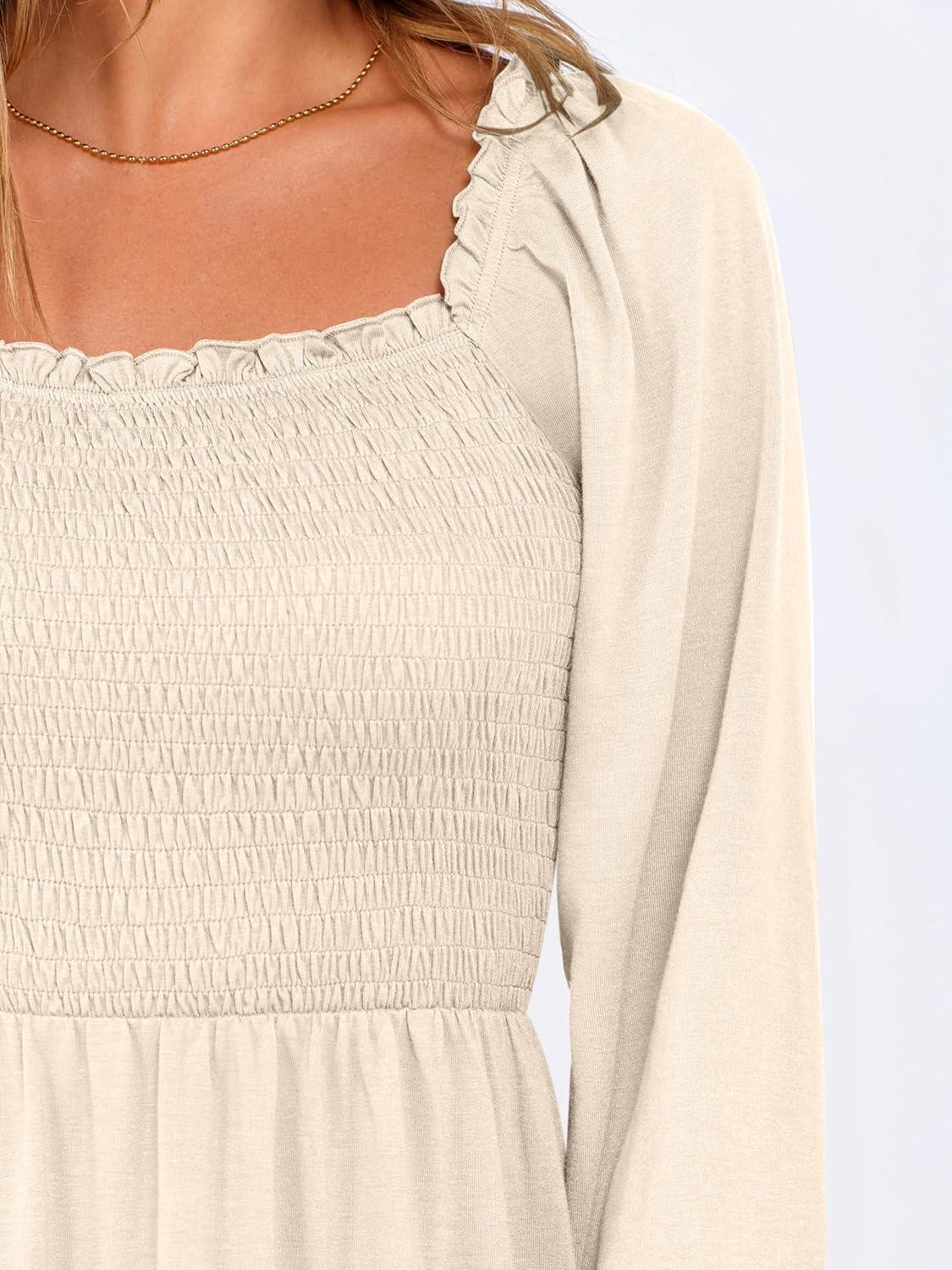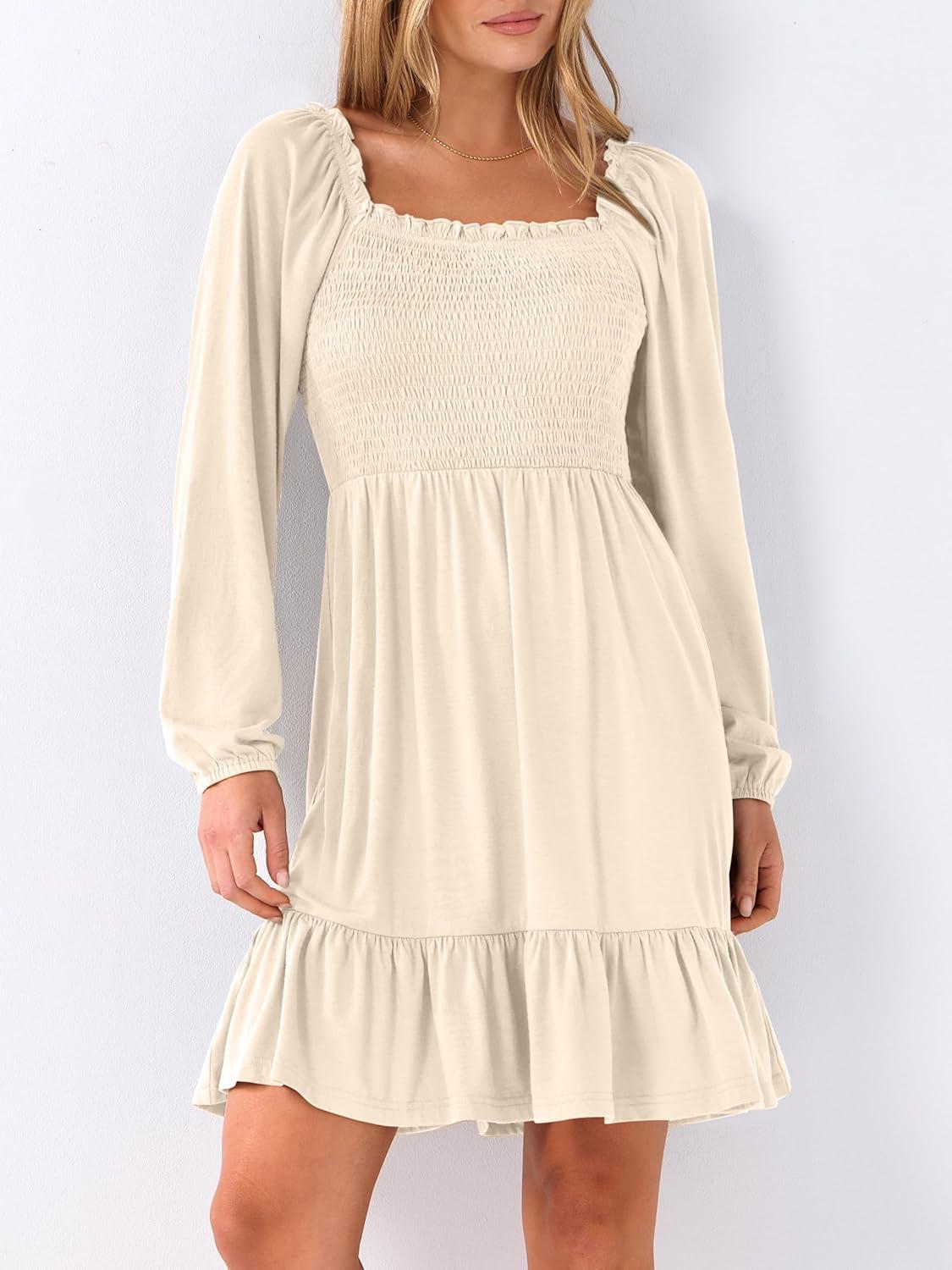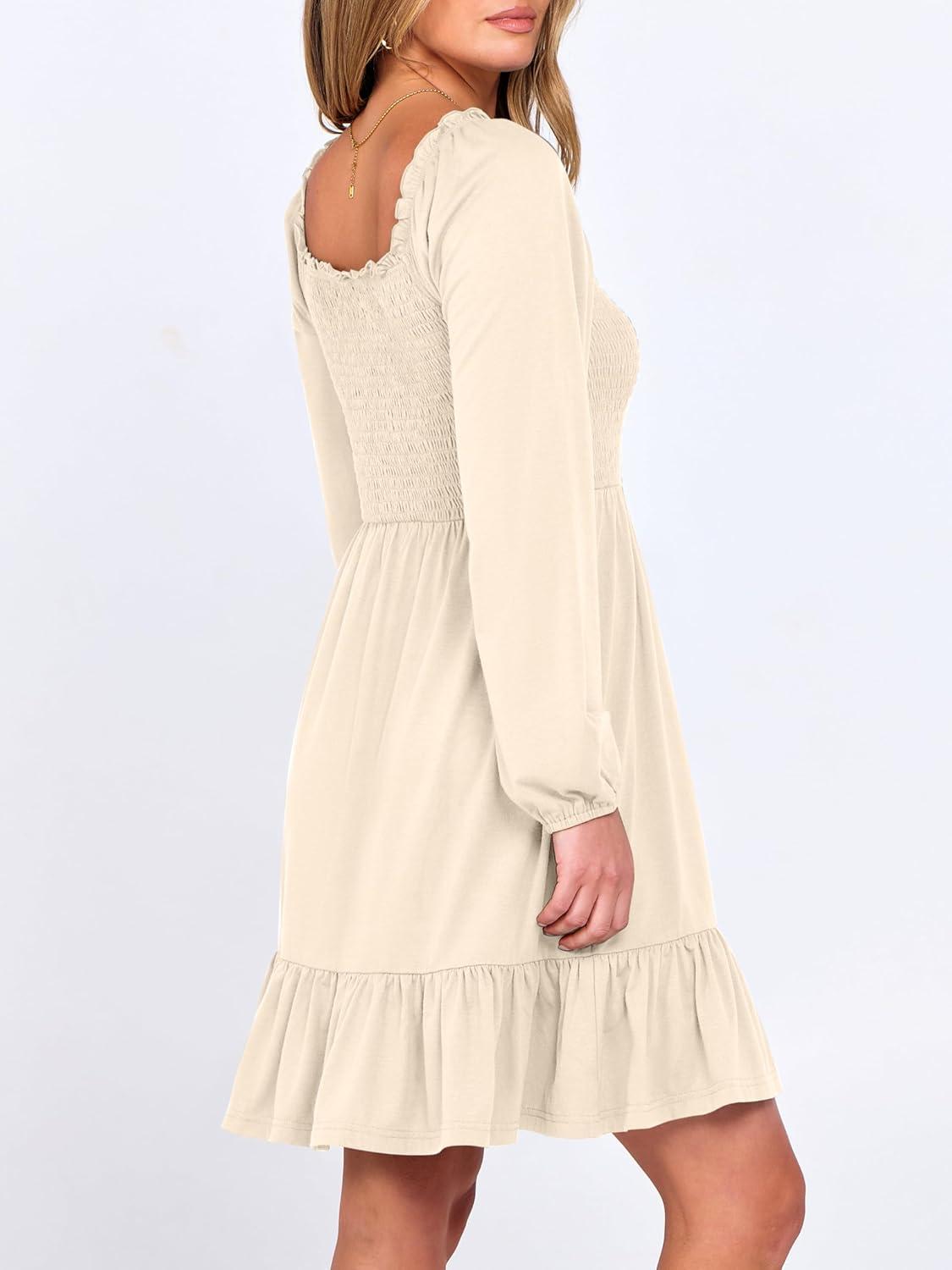 ANRABESS Womens Long Lantern Sleeve Square Neck Dress Smocked Tiered High Waist Ruffle Flowy Swing 2025 Fall Short Dresses(Beige)