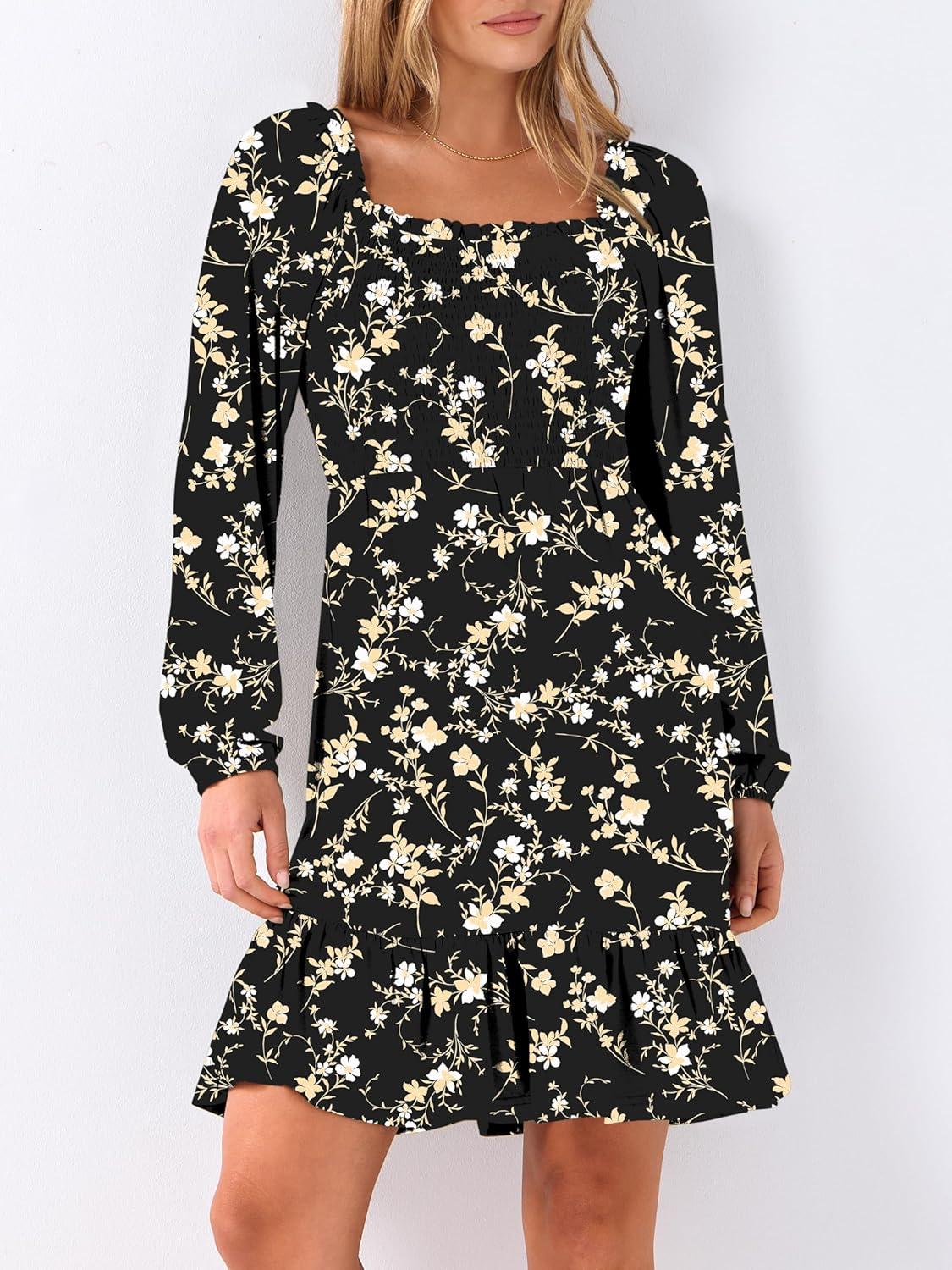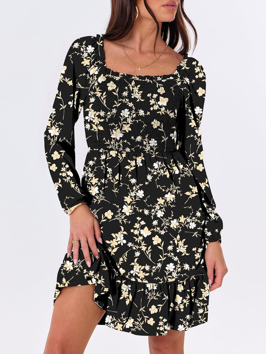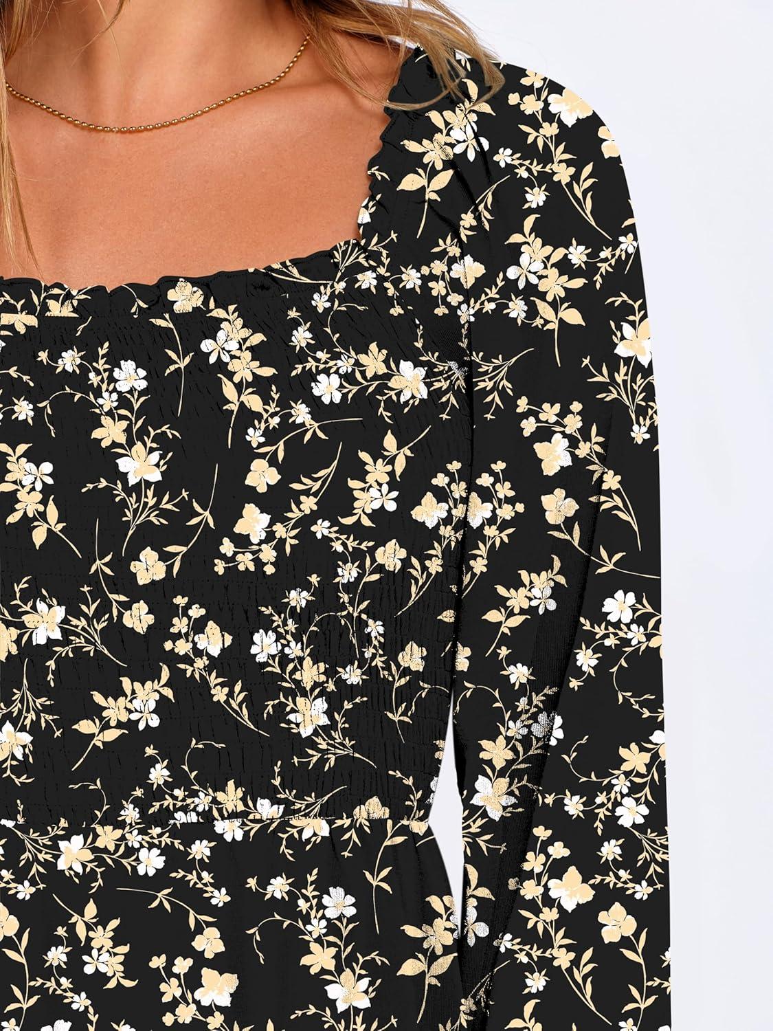 ANRABESS Womens Long Lantern Sleeve Square Neck Dress Smocked Tiered High Waist Ruffle Flowy Swing 2025 Fall Short Dresses(Black Floral)