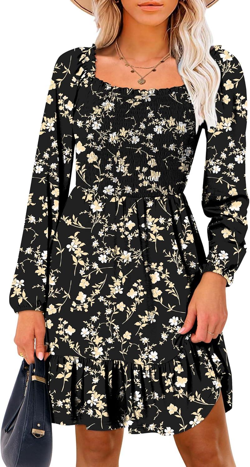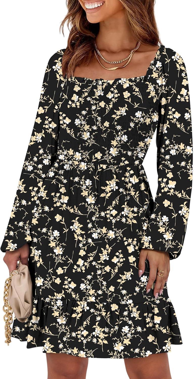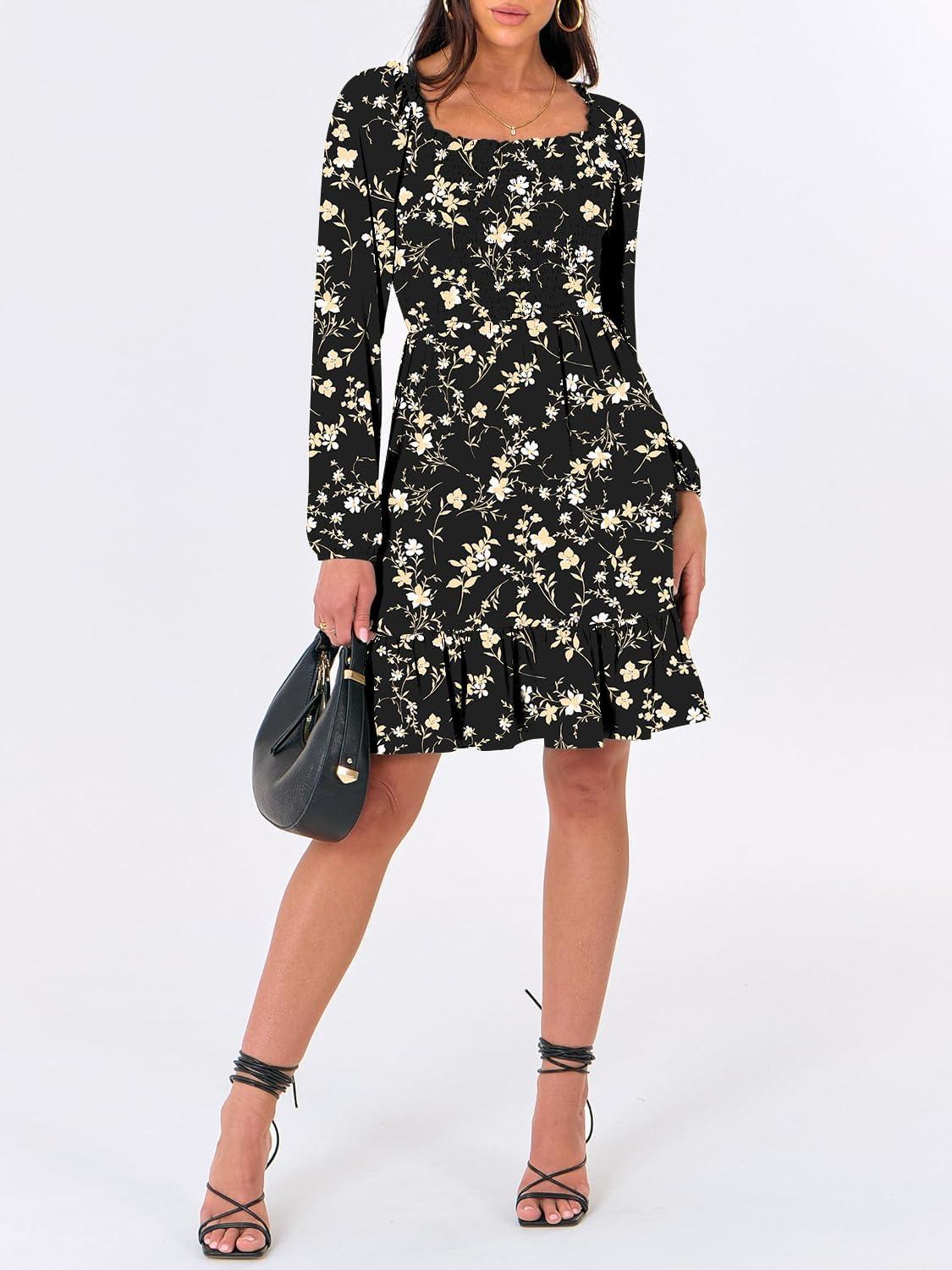 ANRABESS Womens Long Lantern Sleeve Square Neck Dress Smocked Tiered High Waist Ruffle Flowy Swing 2025 Fall Short Dresses(Black Floral)