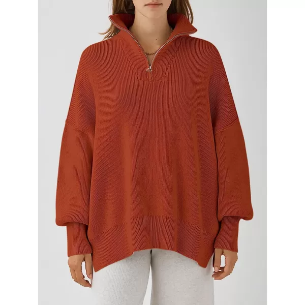 ANRABESS Women's Long Sleeve 1/4 Zipper Collar Drop Shoulder Oversized Slouchy Sweatshirt Pullover Sweater with Slit(Rust)