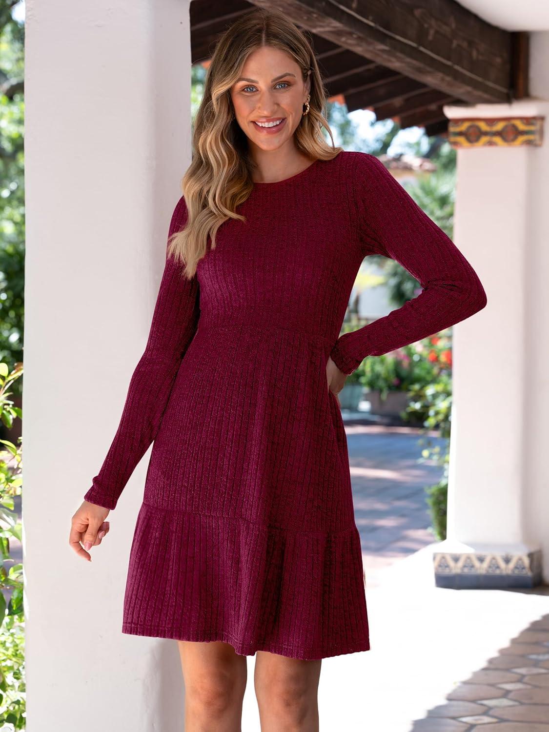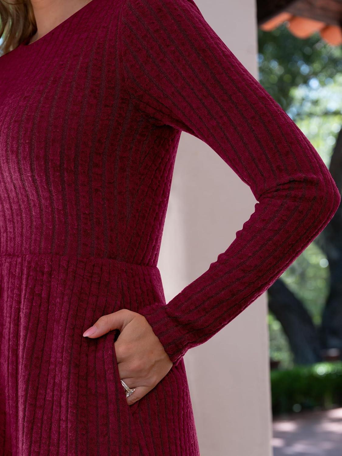 ANRABESS Womens Long Sleeve 2025 Fall Short Dress Casual Ribbed Knit Crewneck Flowy A Line Mini Sweater Dresses with Pockets(Burgundy)