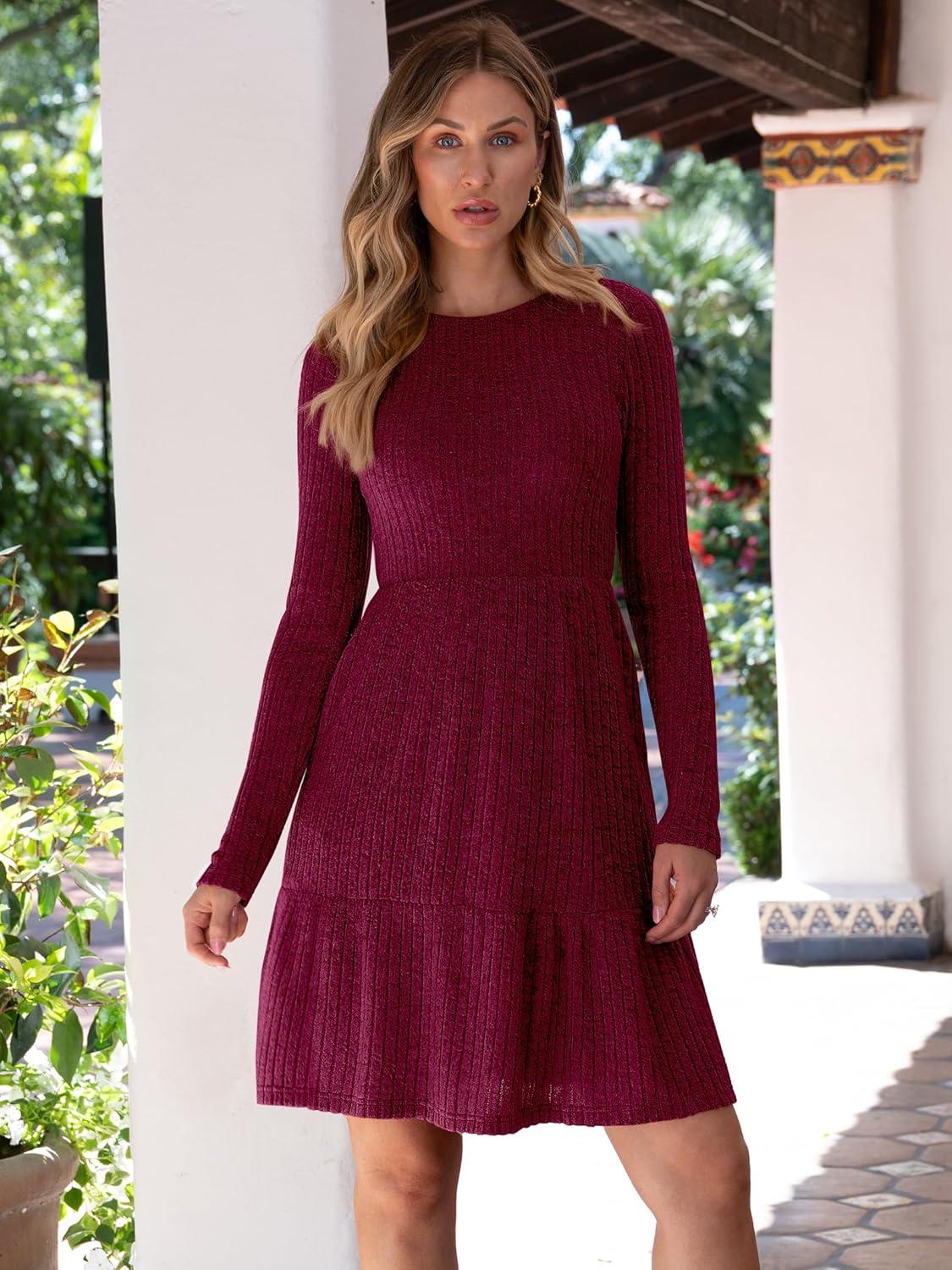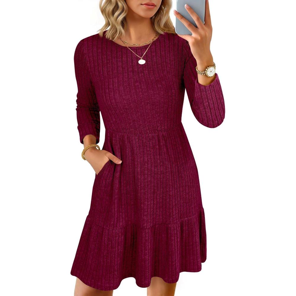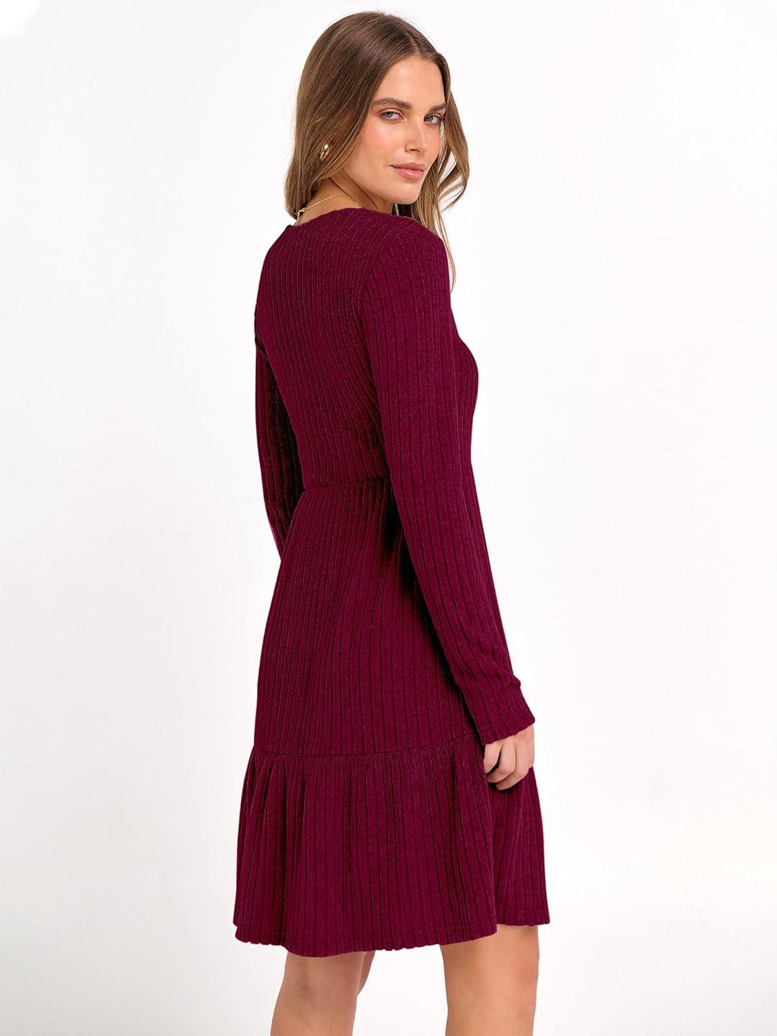 imageANRABESS Womens Long Sleeve 2025 Fall Short Dress Casual Ribbed Knit Crewneck Flowy A Line Mini Sweater Dresses with PocketsBurgundy