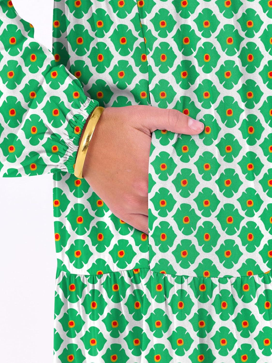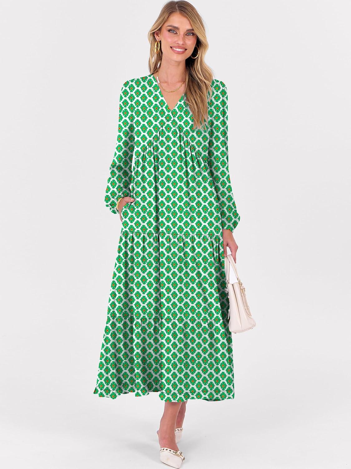 ANRABESS Womens Long Sleeve Boho Maxi Dress 2025 Fall V Neck Floral Striped Casual Loose Fit Beach Vacation Dresses(Green)