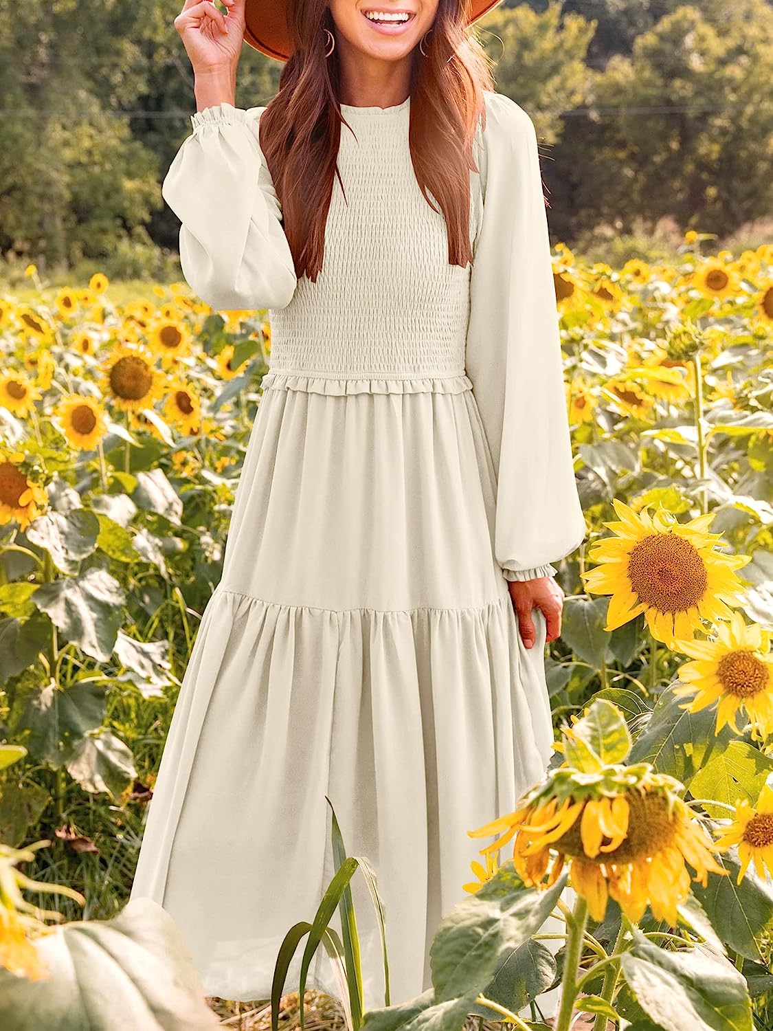 ANRABESS Women’s Long Sleeve Crewneck Smocked Boho Dress A-Line Ruffle Frill Tiered Swing Midi Dress(A-apricot)