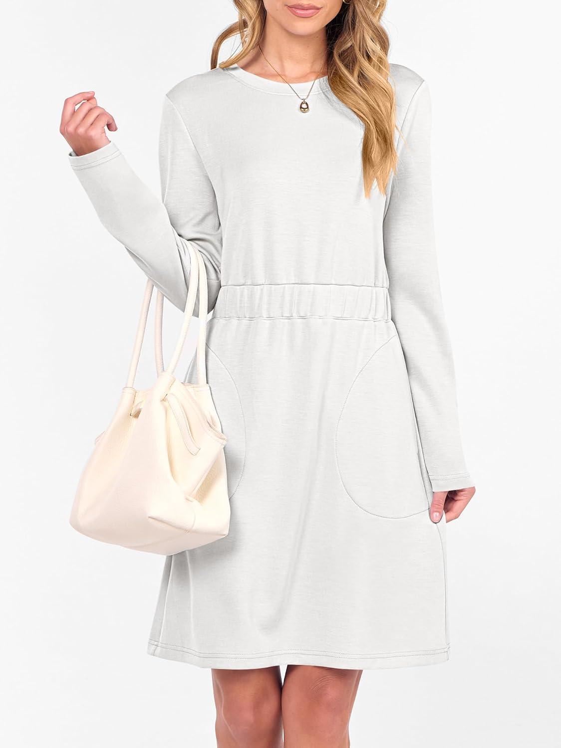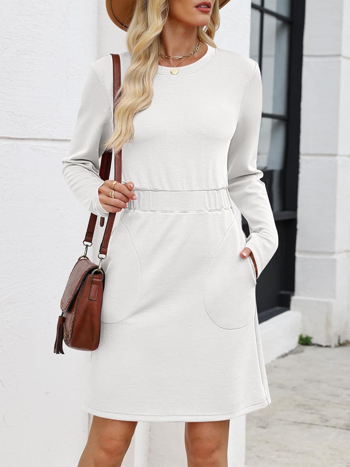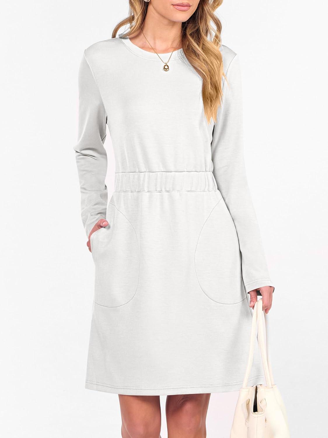 ANRABESS Womens Long Sleeve Dress 2025 Fall Casual Elastic Waist Short Mini T Shirt Dresses with Pockets Travel Outfits(White)