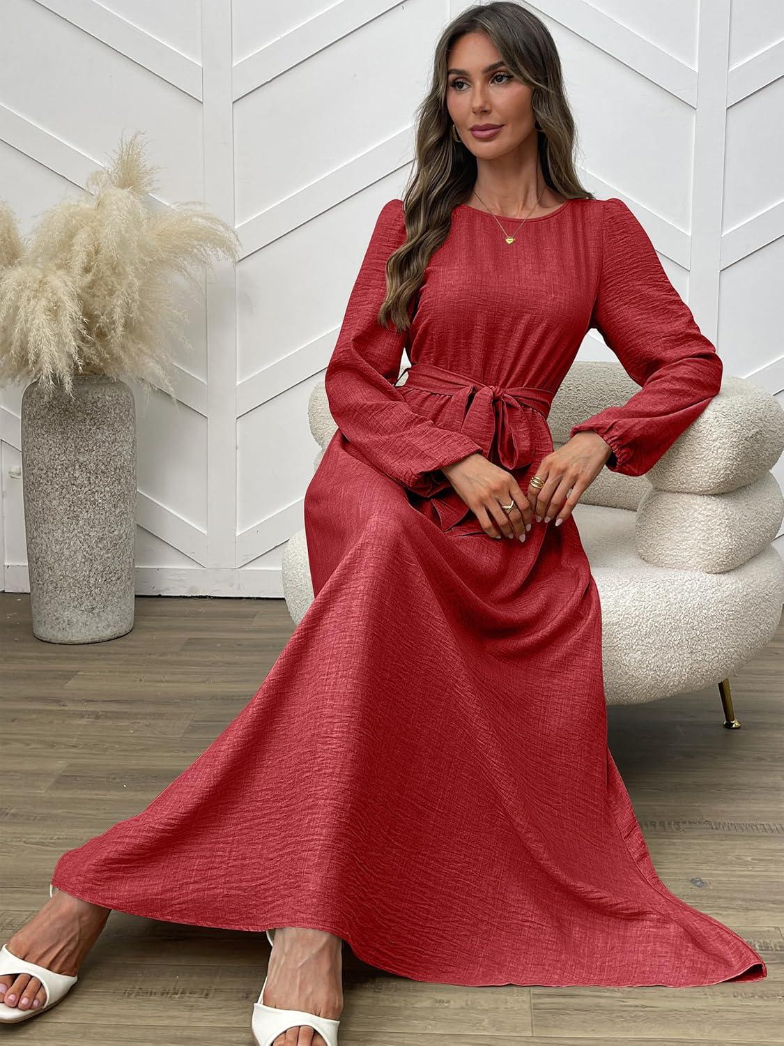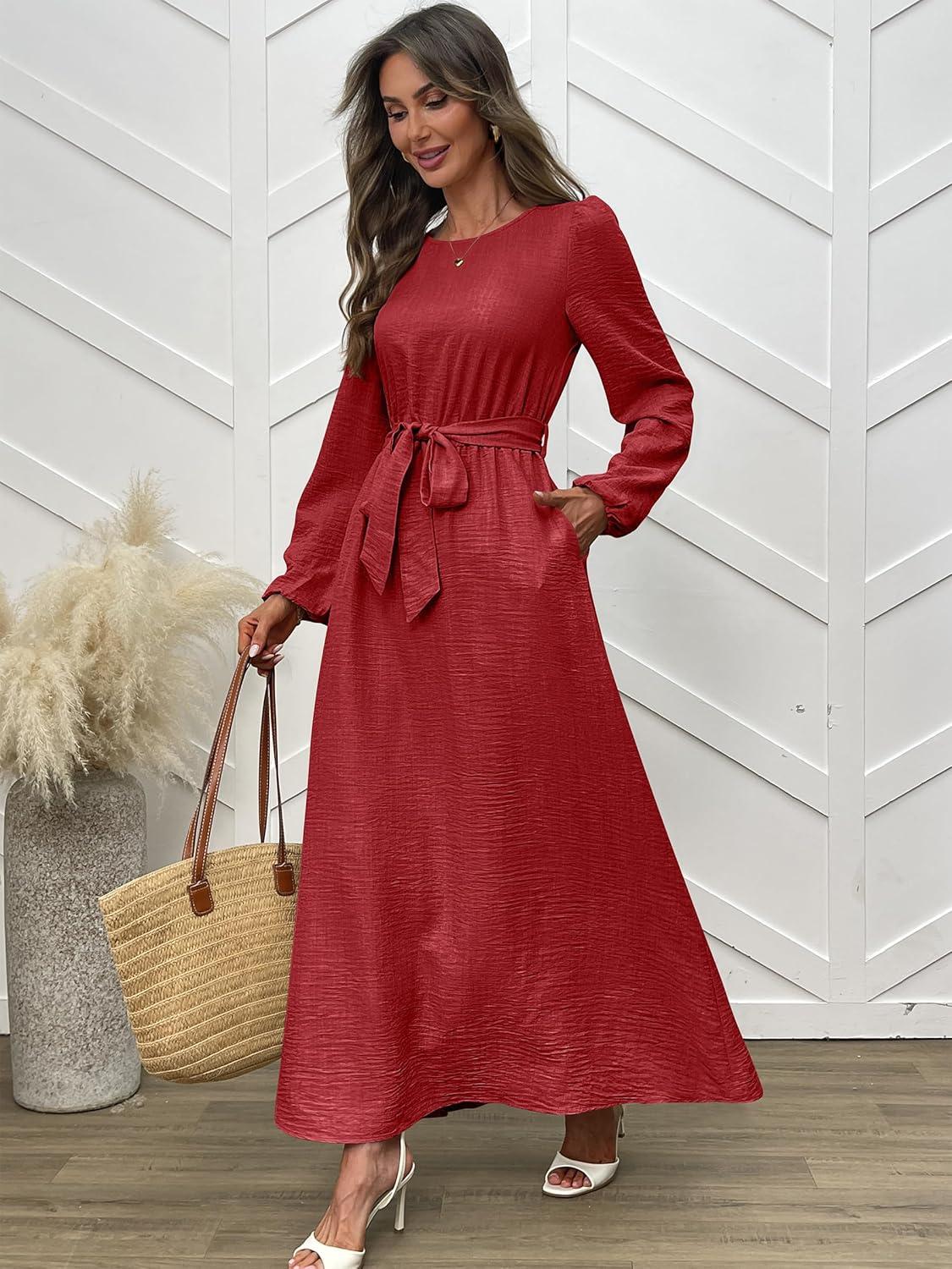 ANRABESS Womens Long Sleeve Dress 2025 Fall Casual Empire Waist A-Line Flowy Maxi Dresses with Pockets Vacation Outfits(Birck Red)