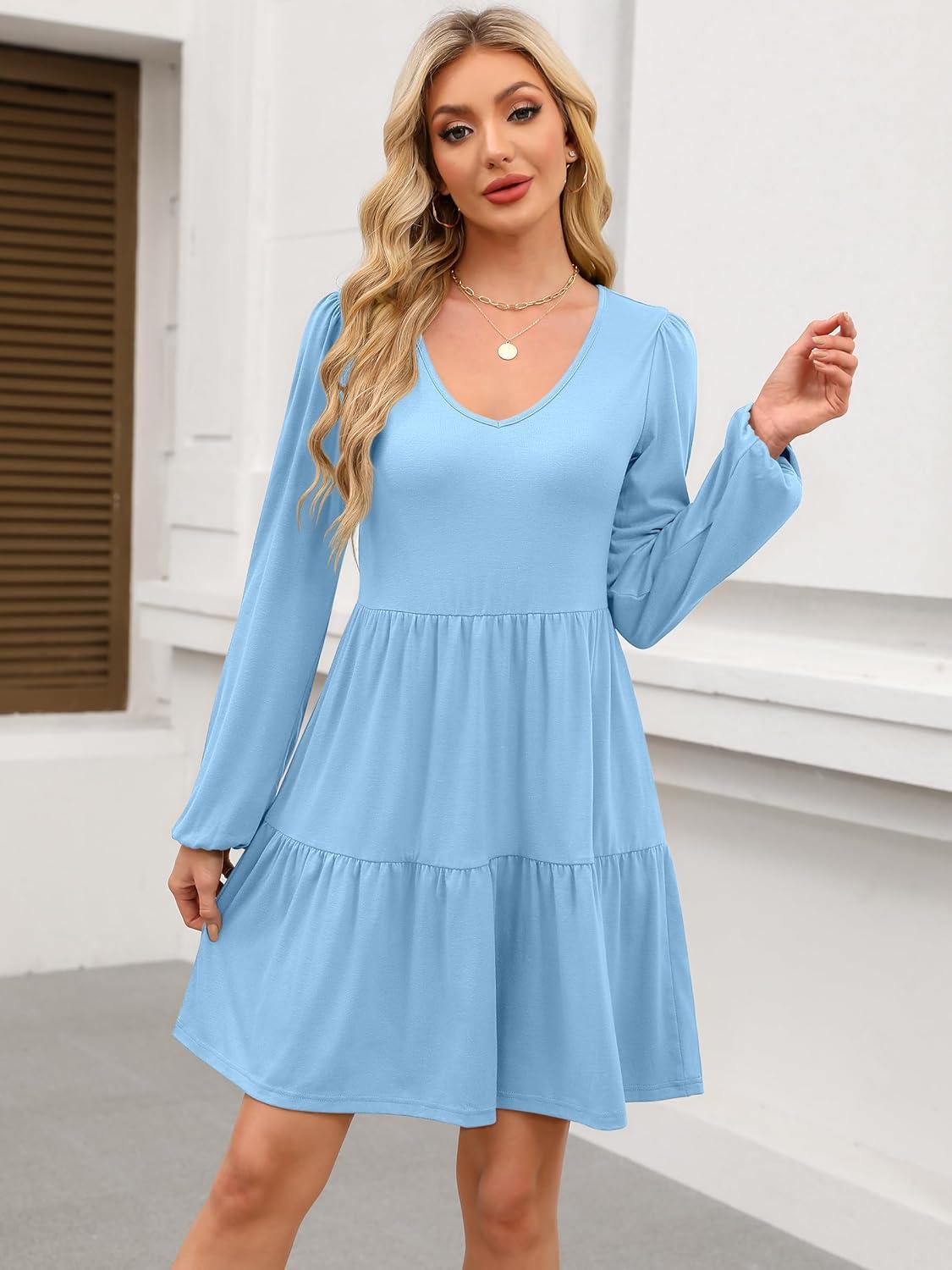 ANRABESS Womens Long Sleeve Dress 2025 Fall Casual V Neck Tiered Flowy Short Dresses Beach Travel Vacation Outfits(Light Blue)
