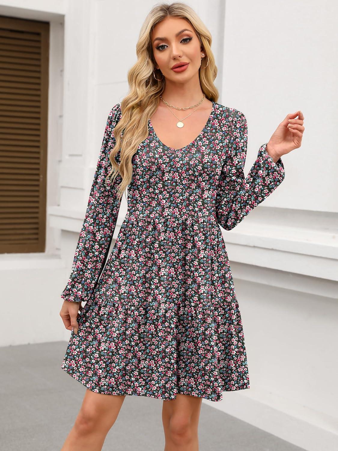 ANRABESS Womens Long Sleeve Dress 2025 Fall Casual V Neck Tiered Flowy Short Dresses Beach Travel Vacation Outfits(Print Floral Black)