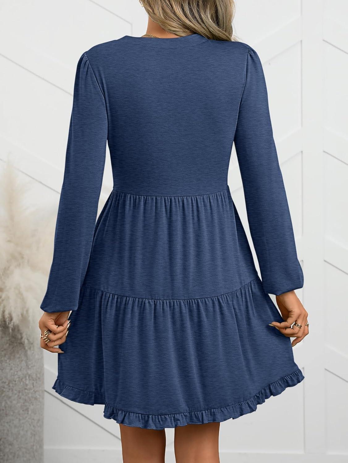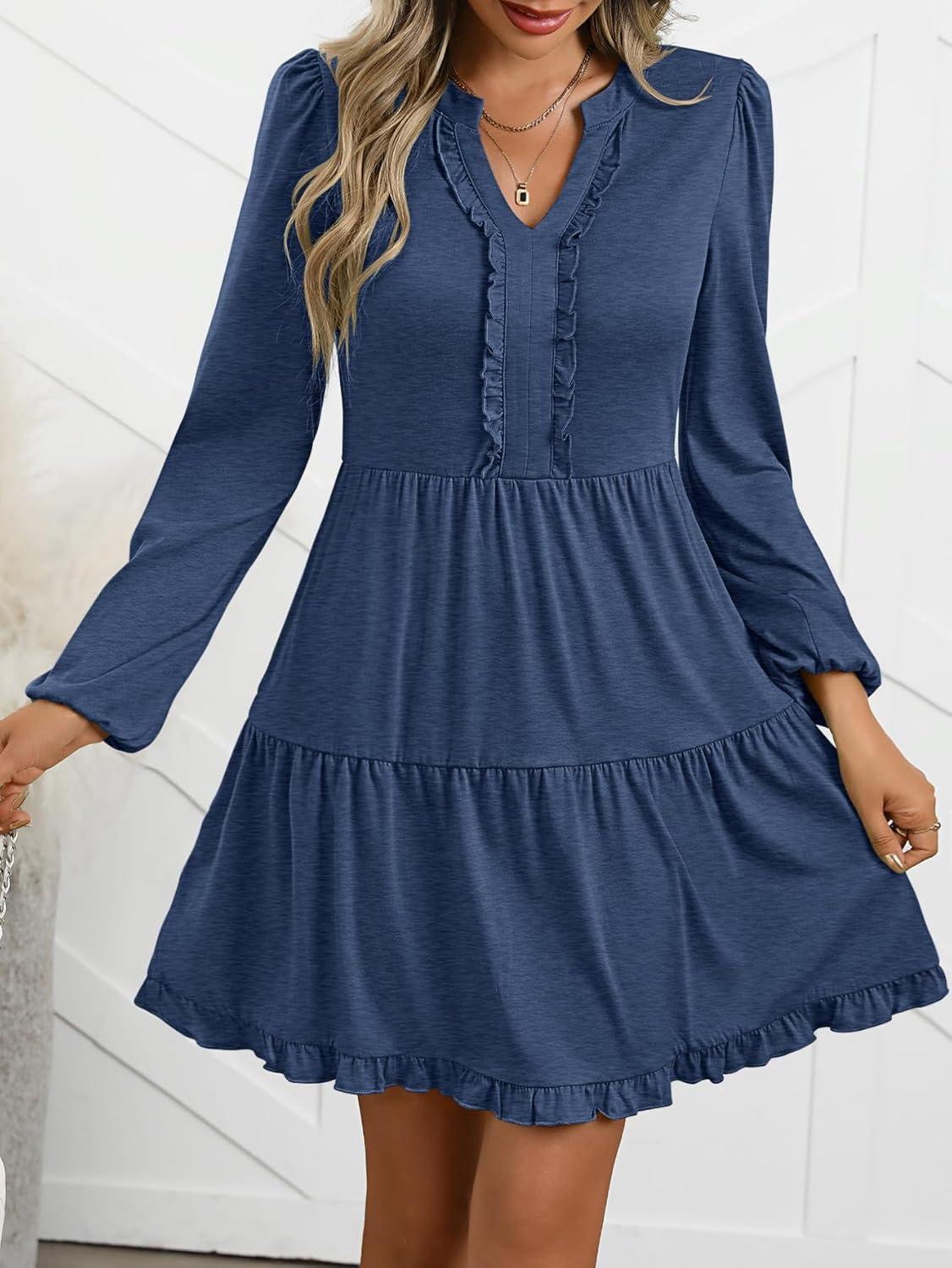 ANRABESS Womens Long Sleeve Dress 2025 Fall Casual V Neck Tiered Flowy Swing Short Mini Dresses Beach Travel Vacation Outfits(Nighty Blue)