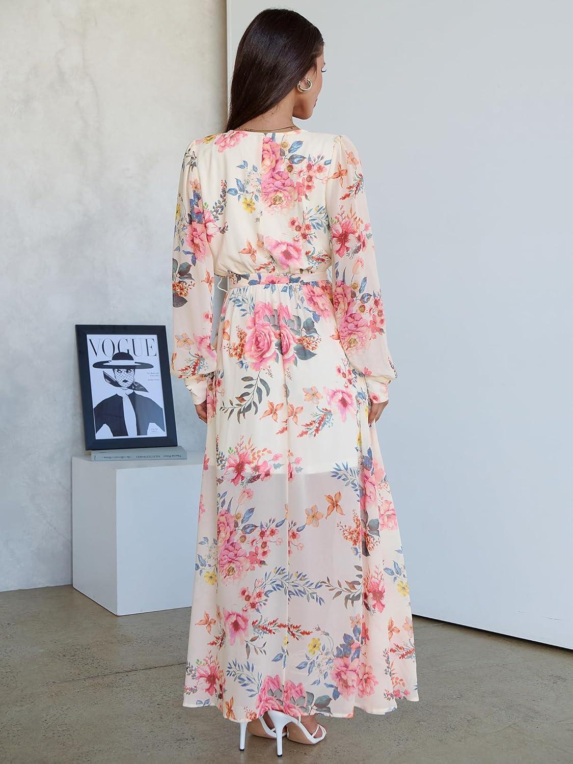Women’s Boho Flowy Wrap V Neck Long Sleeve Floral Print Slit Beach Wedding Guest Long Maxi Dresses