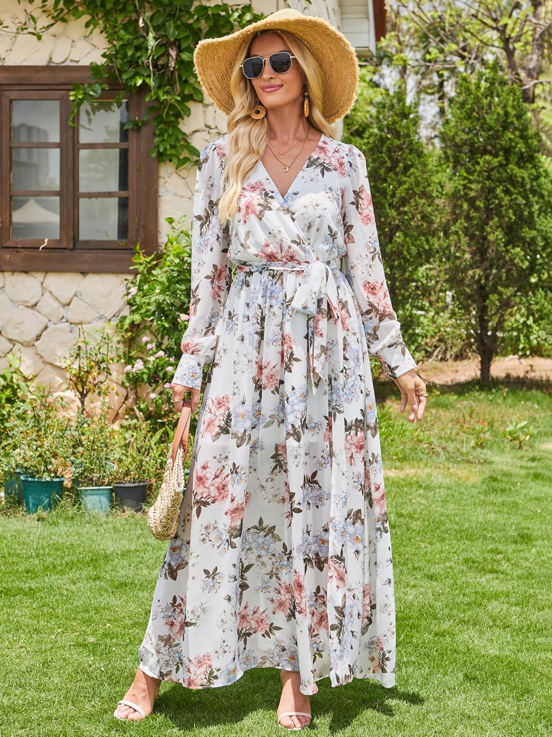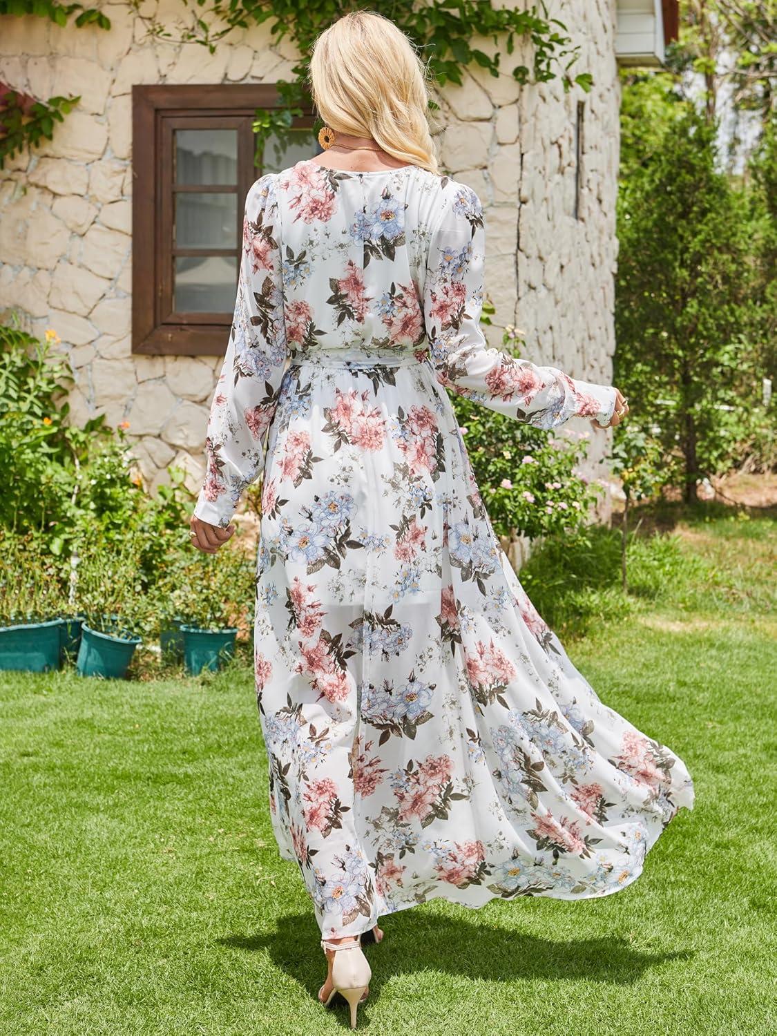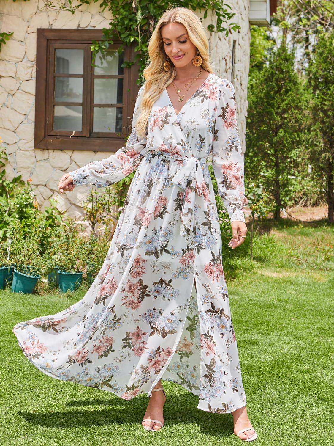 Women’s Boho Flowy Wrap V Neck Long Sleeve Floral Print Slit Beach Wedding Guest Long Maxi Dresses