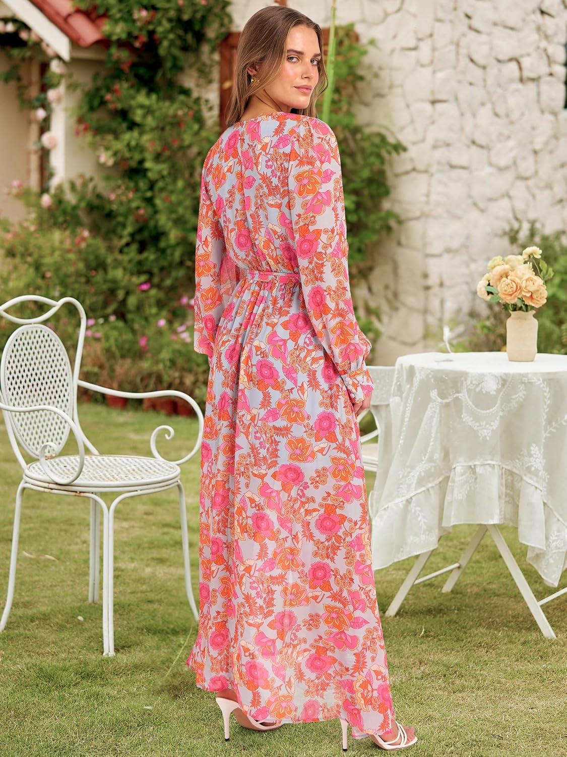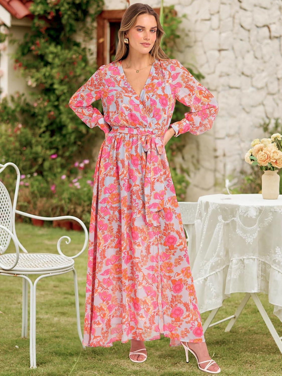 Women’s Boho Flowy Wrap V Neck Long Sleeve Floral Print Slit Beach Wedding Guest Long Maxi Dresses