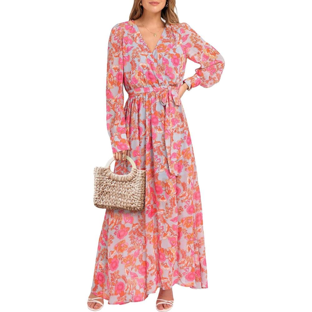 imageANRABESS Womens Long Sleeve Floral Maxi Dress Boho Flowy Wrap Slit V Neck Beach Fall Wedding Guest Party Vacation DressesGrey Pink Floral