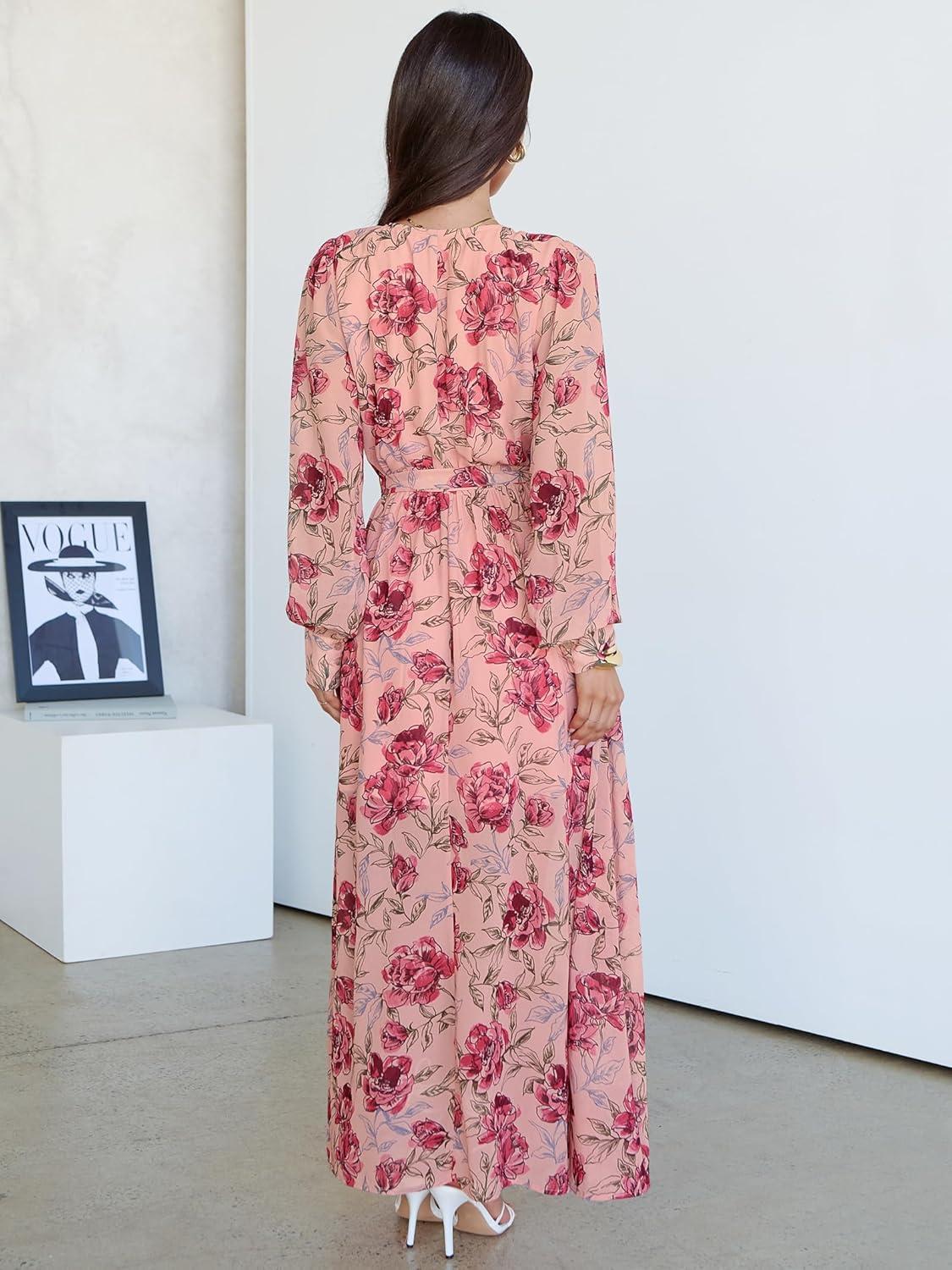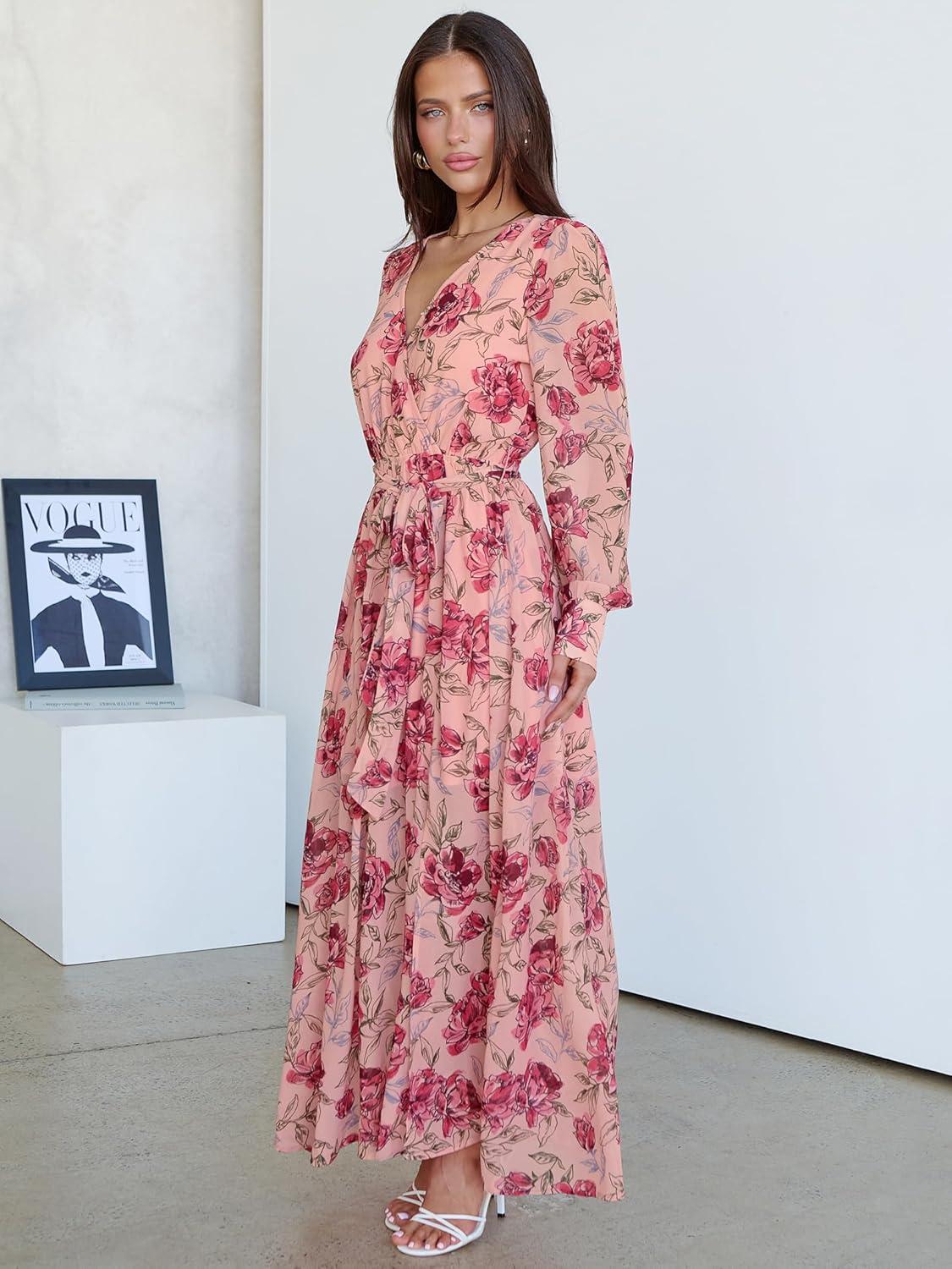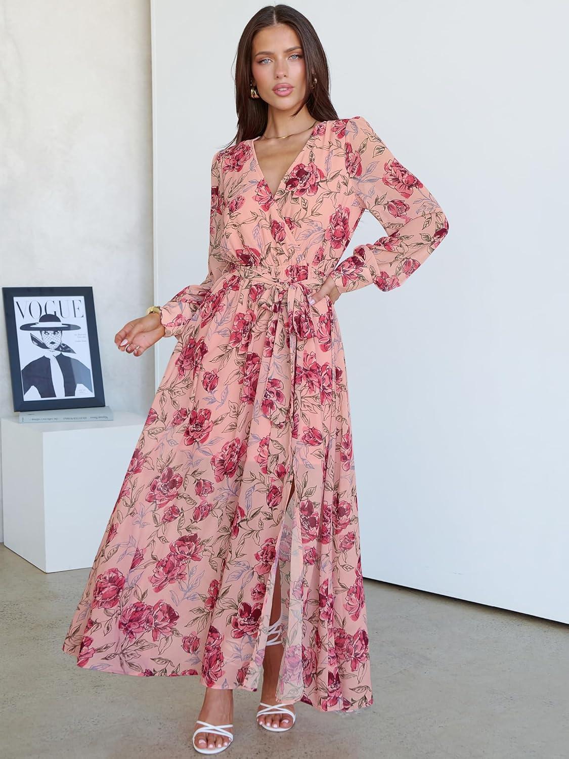 ANRABESS Women’s Long Sleeve Floral Maxi Dress Boho Flowy Wrap Slit V Neck Beach Fall Wedding Guest Party Vacation Dresses(Rose Red Floral)