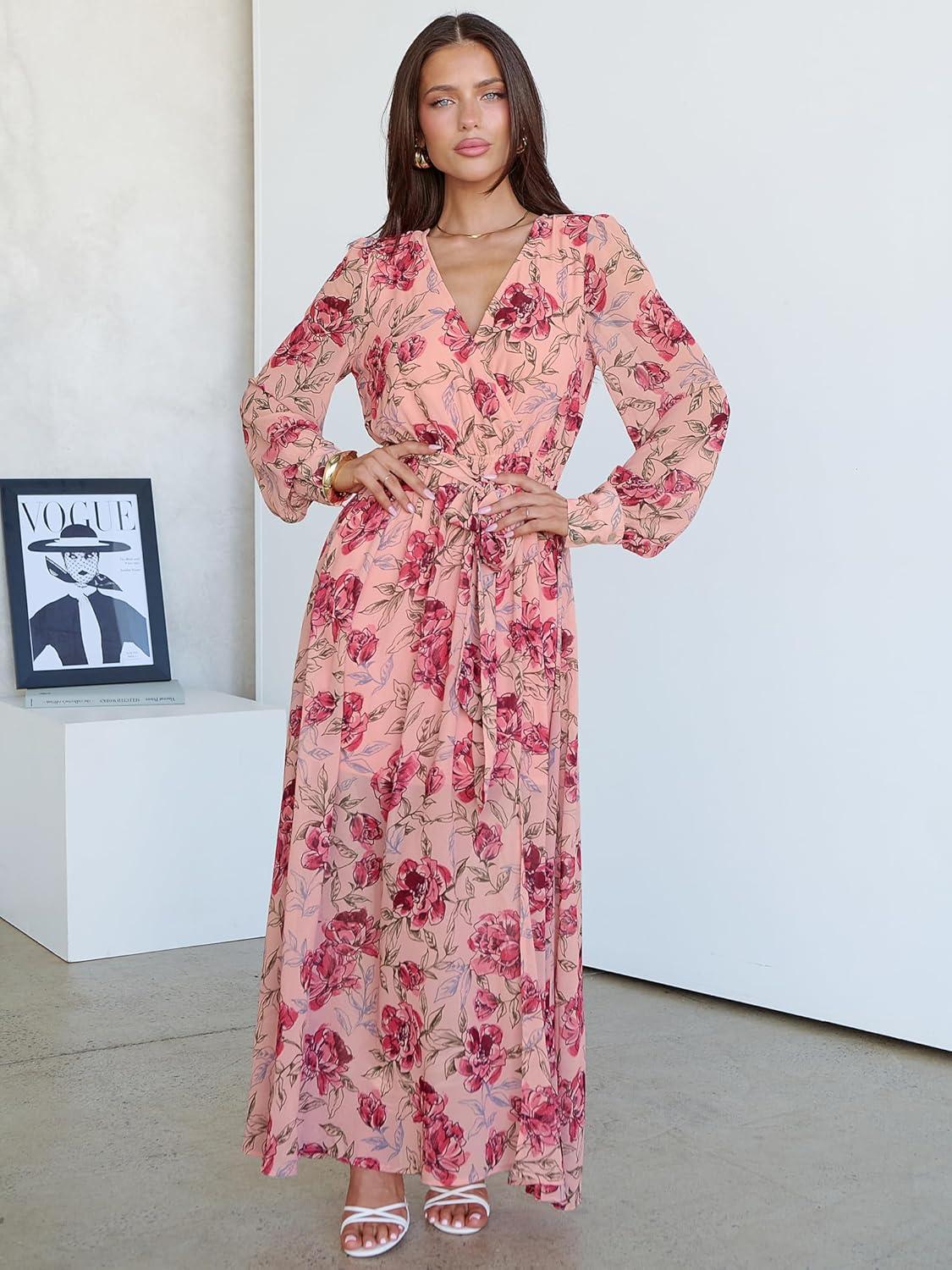 imageANRABESS Womens Long Sleeve Floral Maxi Dress Boho Flowy Wrap Slit V Neck Beach Fall Wedding Guest Party Vacation DressesOrange Pink Floral