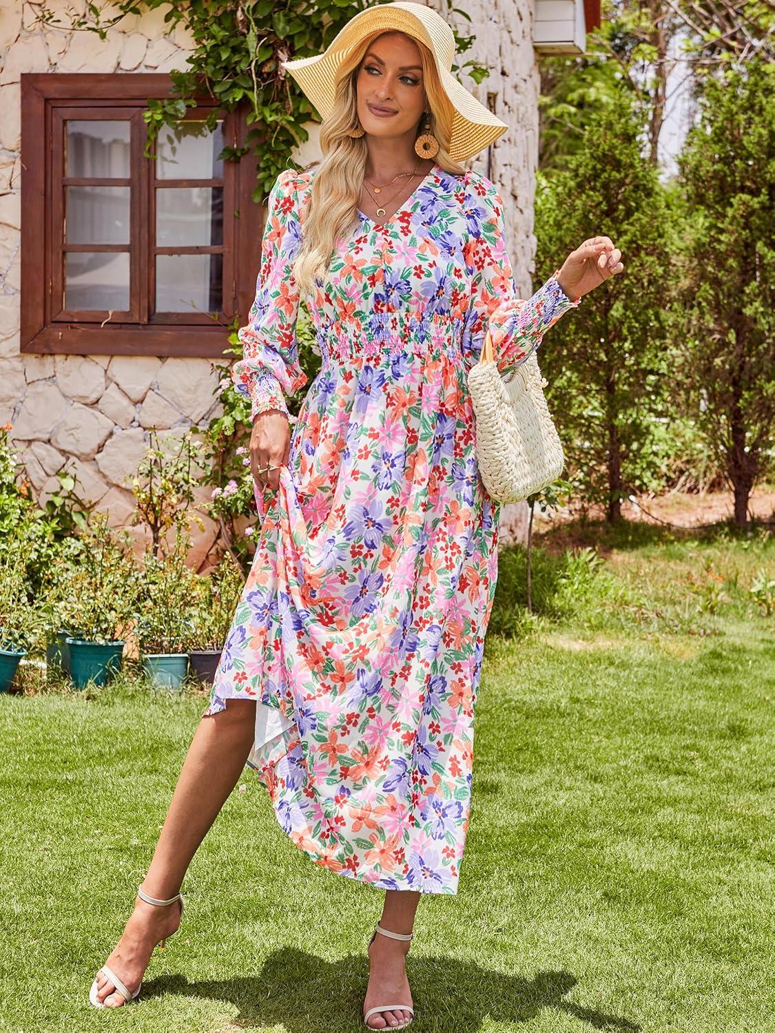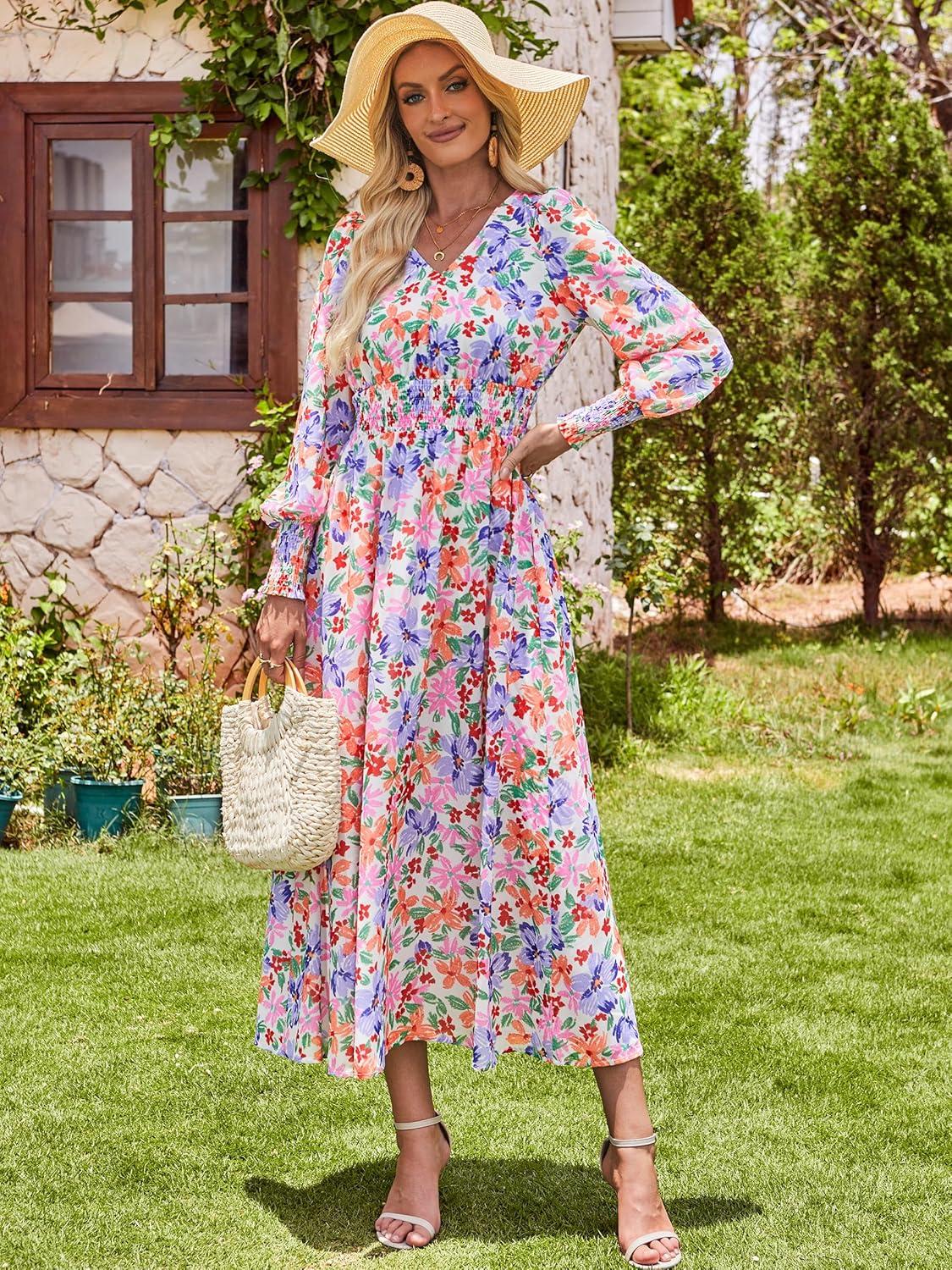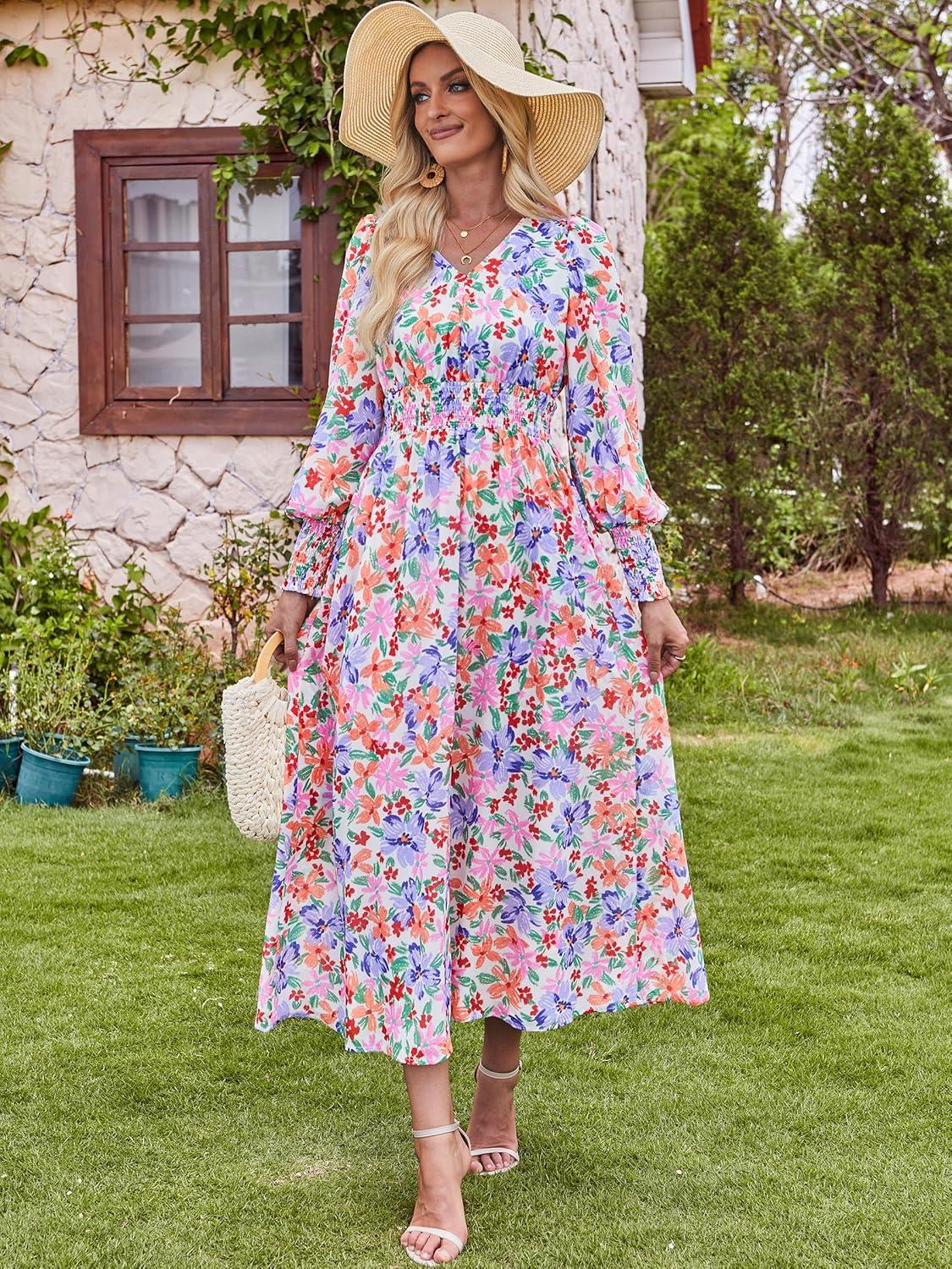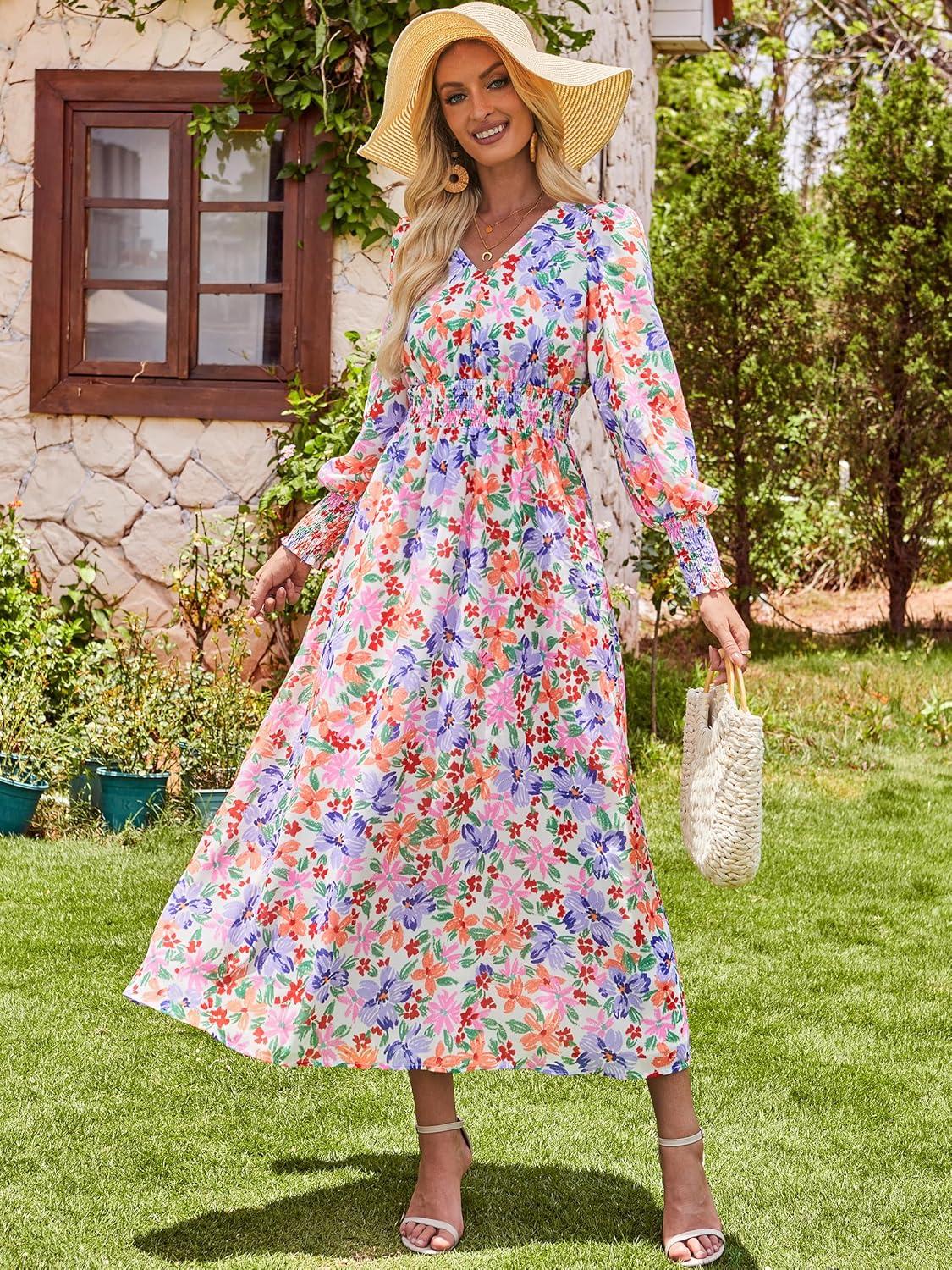 ANRABESS Women's Long Sleeve Floral Maxi Dress Casual V Neck Chiffon Boho Flowy Beach Fall Wedding Guest Party Long Dresses(Crayon Multicolored Floral)